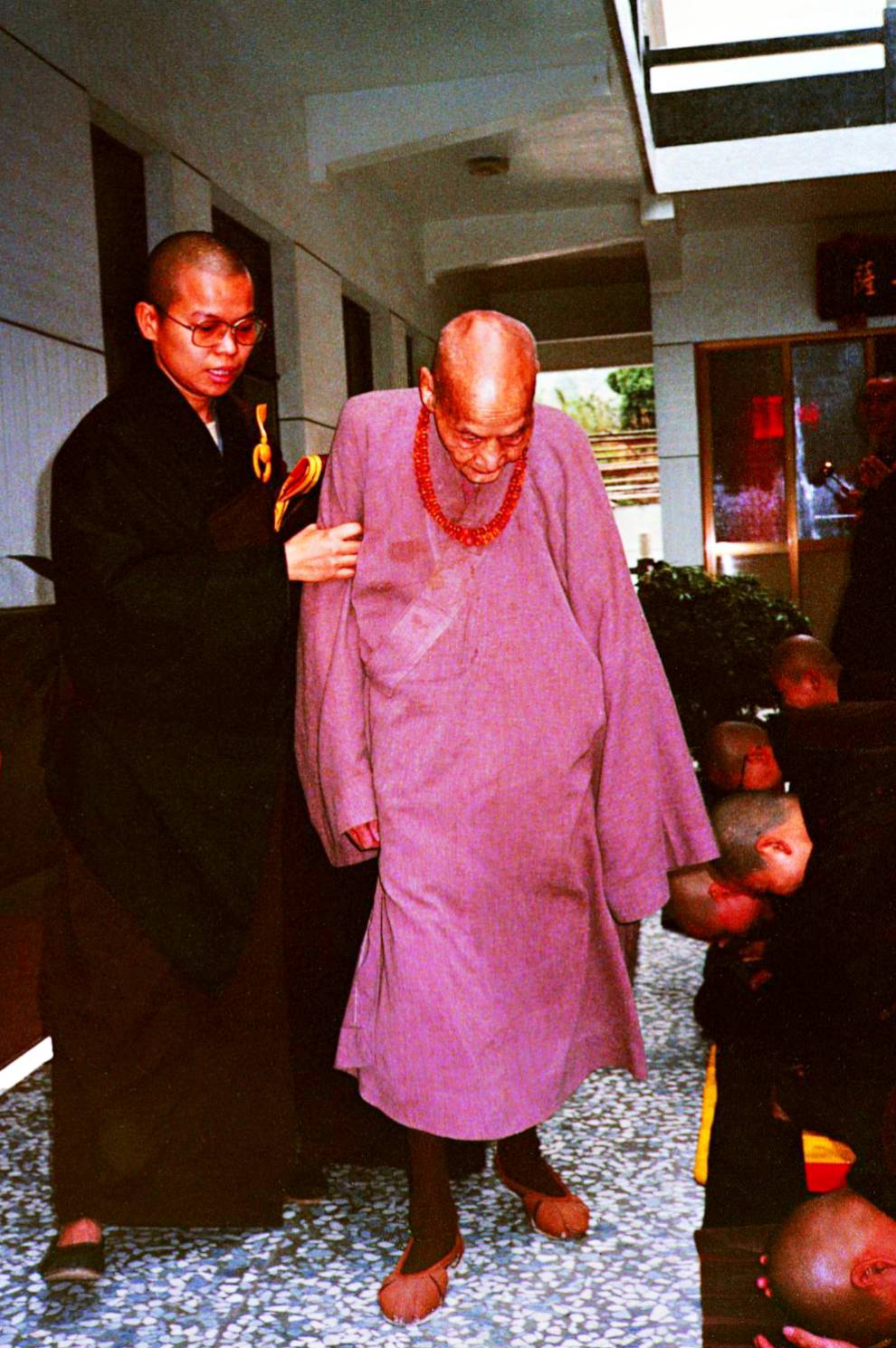 民國74年(1985)農曆12月26日,上廣下欽老和尚示意北返,妙通寺弟子頂禮恭送,法師攙扶老和尚上車。