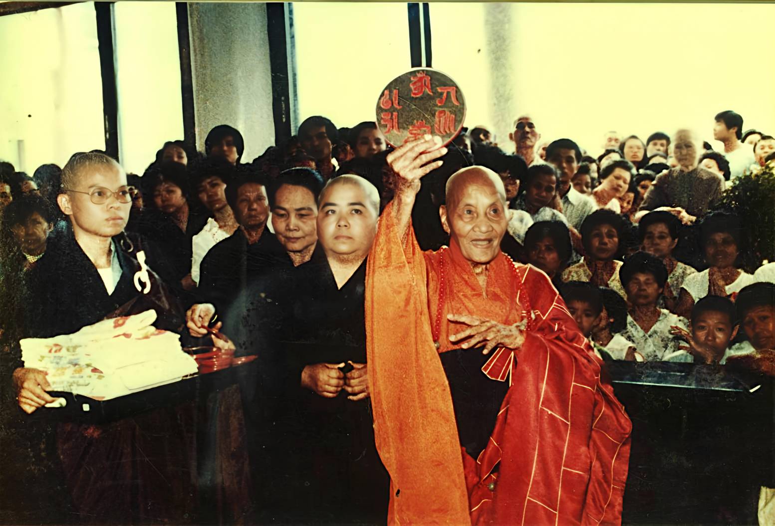 民國73年(1984)農曆6月16日,上廣下欽老和尚親臨妙通寺主持大雄寶殿開光安座大典,傳敦法師(左)與傳聞上師(中)善體師意,全力配合。