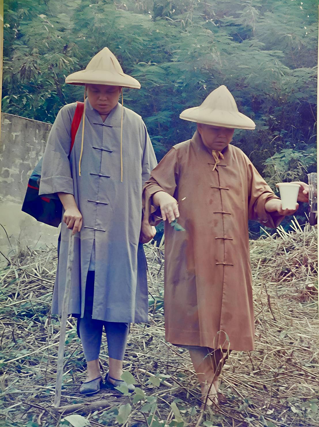 民國83年(1994)農曆11月,千僧寺於台南市左鎮區開山建設,傳聞上師在地面崎嶇不平的工地灑淨,傳敦法師(左)亦步亦趨關照傳聞上師。