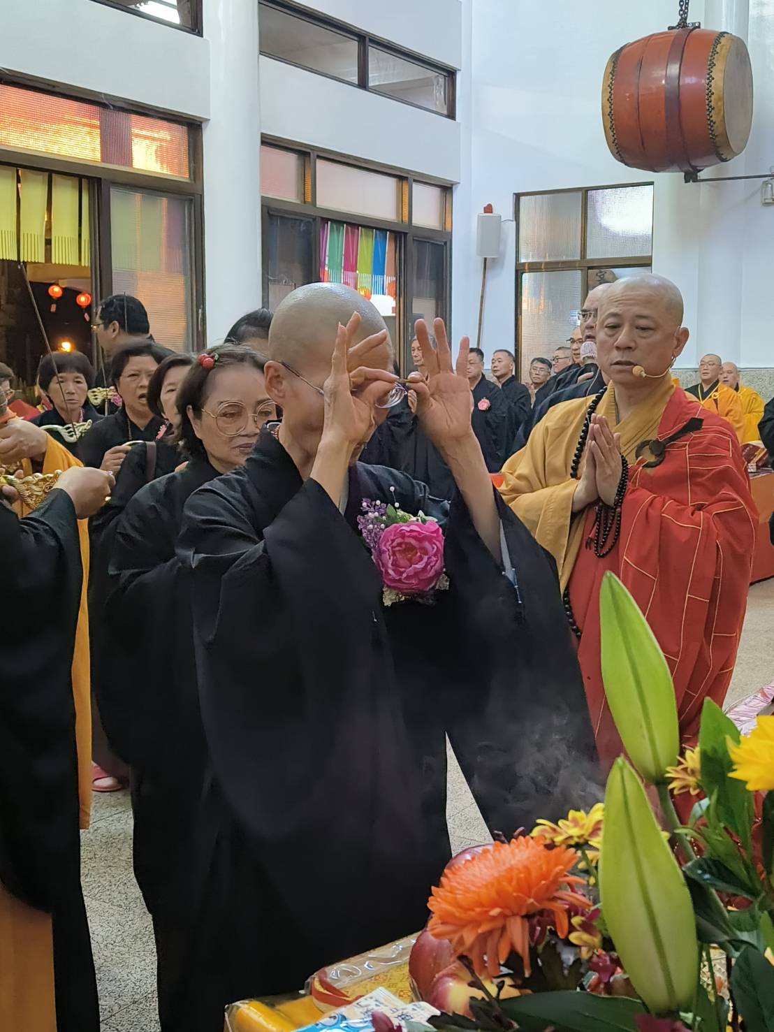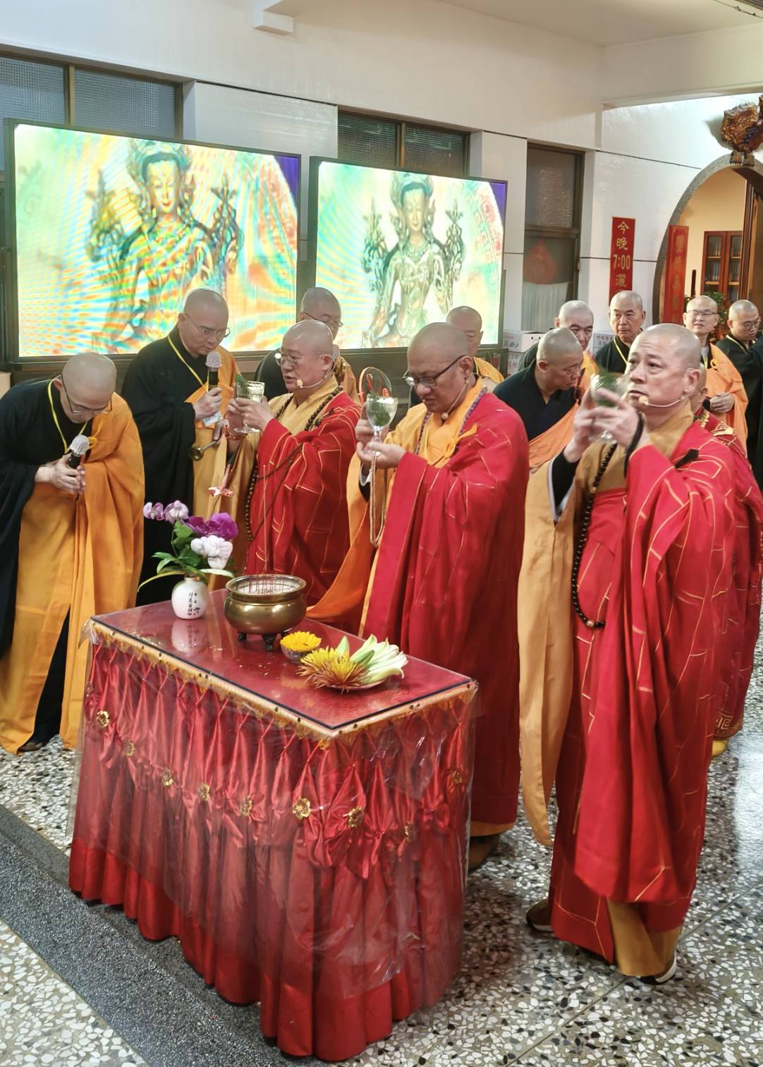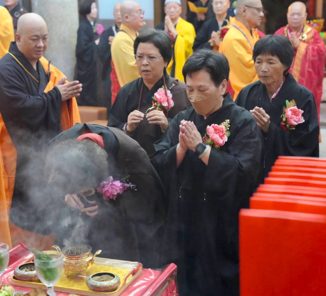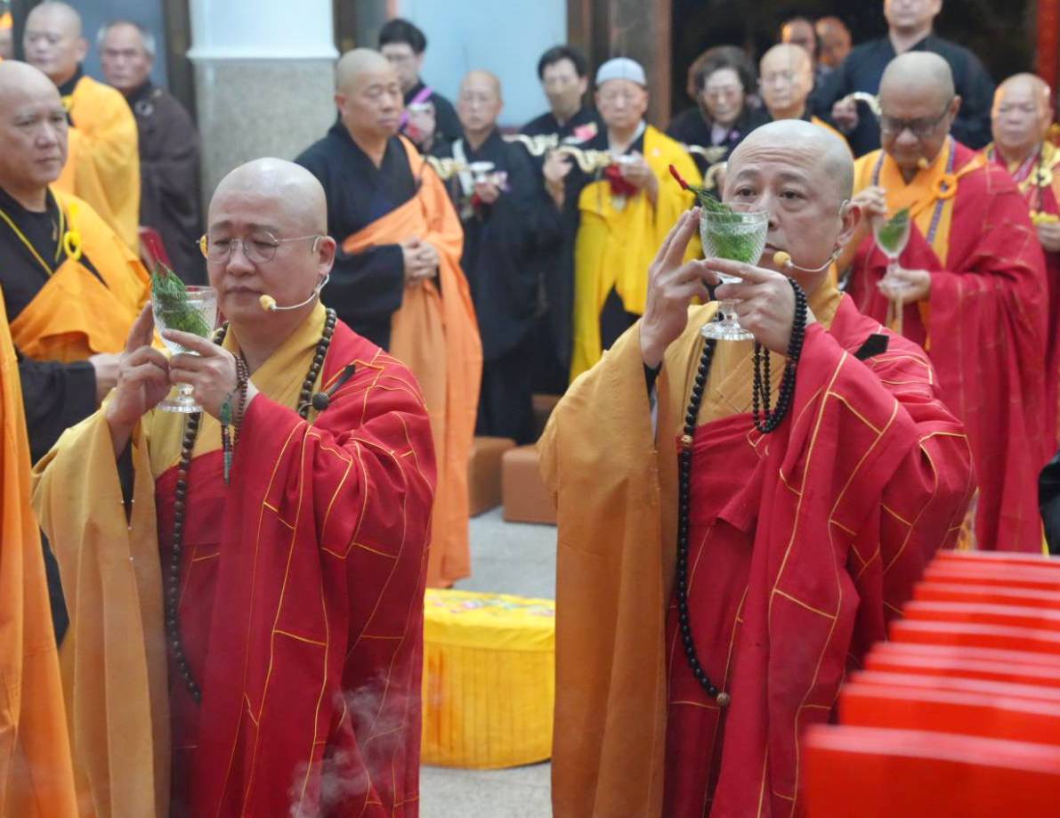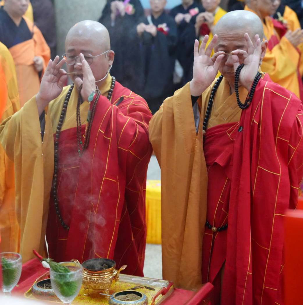 入壇已,舉讚《楊枝淨水》,主法和尚、上傳下敦師父、齋主依序上香。