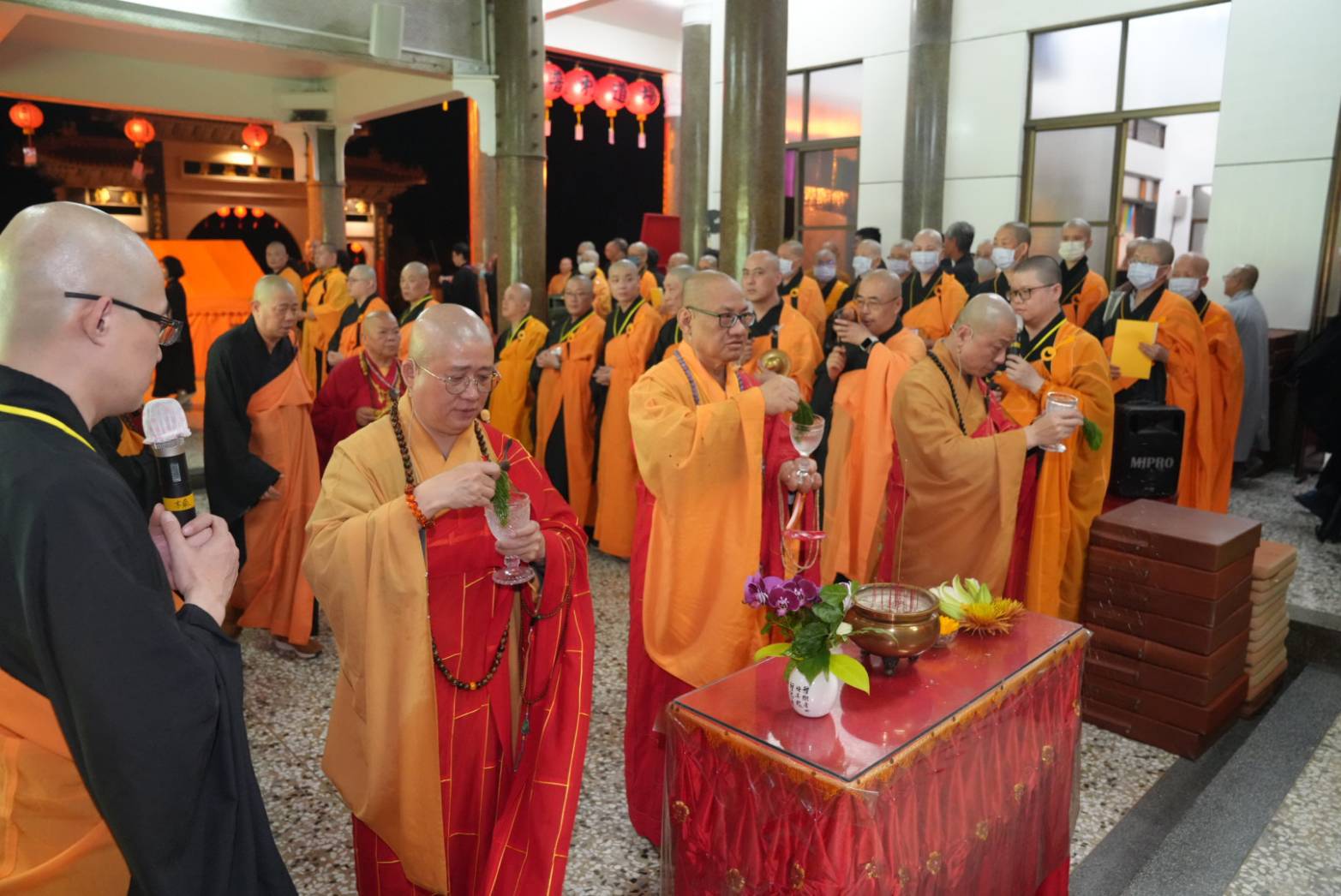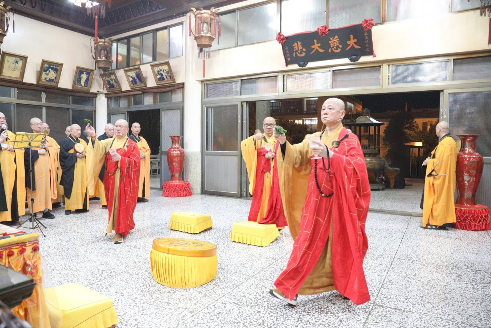 與會大眾誦〈大悲咒〉,三位主法和尚開始各壇灑淨。前往淨土壇。