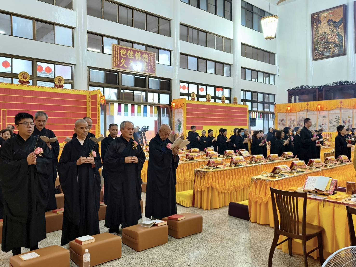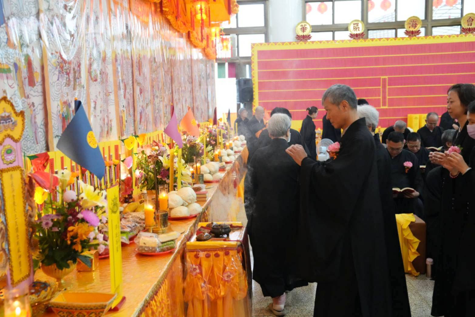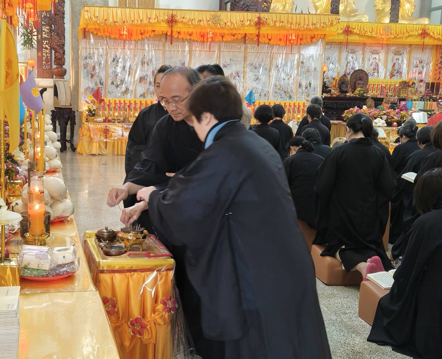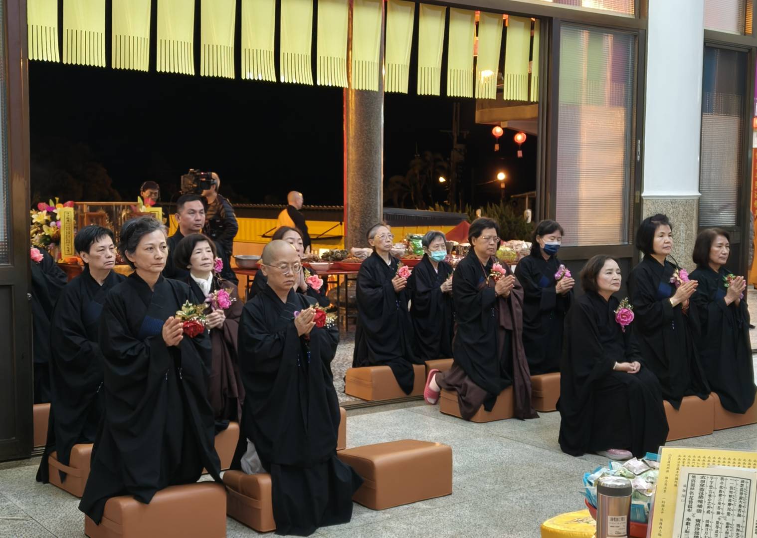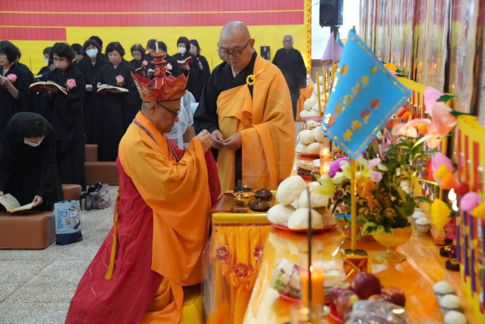 準備兩張茶几及拜墊,香燈置香盤於茶几,佛事前置下堂第1、2席前(第11、12席)