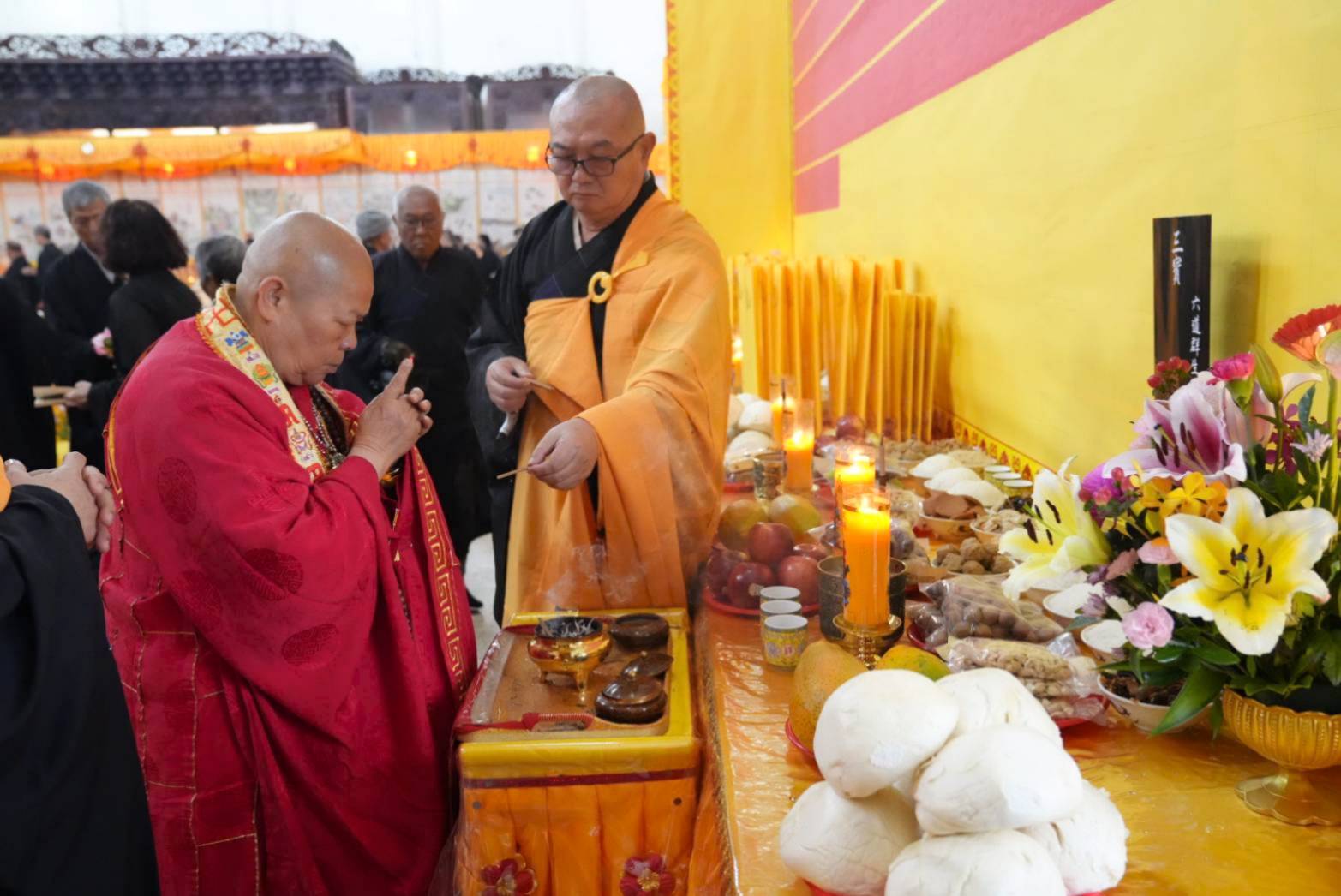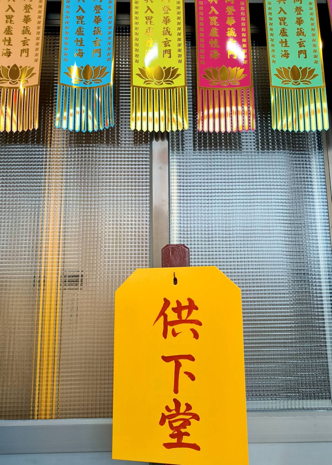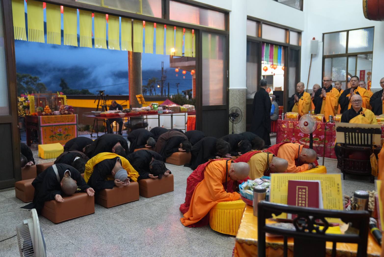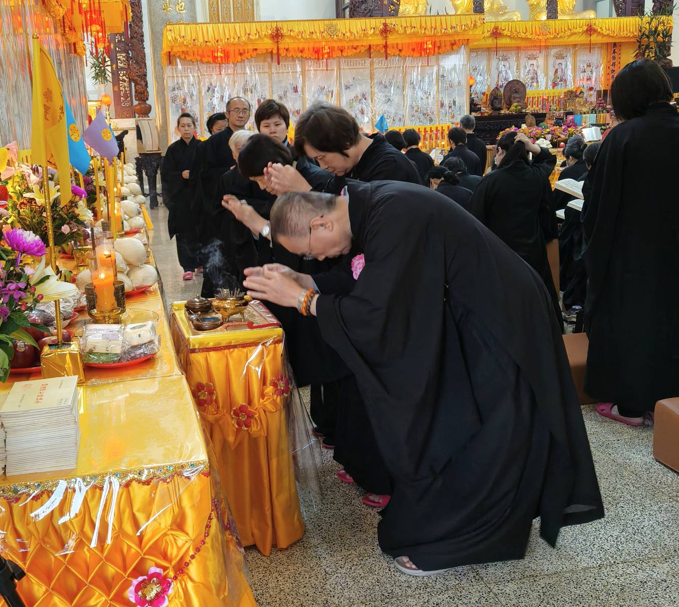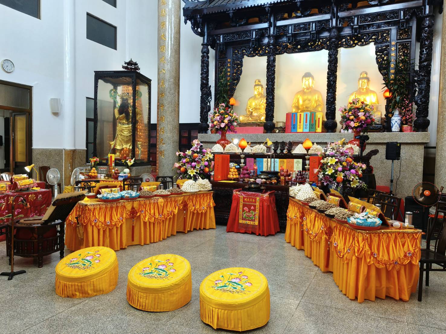 準備兩張茶几及拜墊,香燈置香盤於茶几,佛事前置下堂第1、2席前(第11、12席)