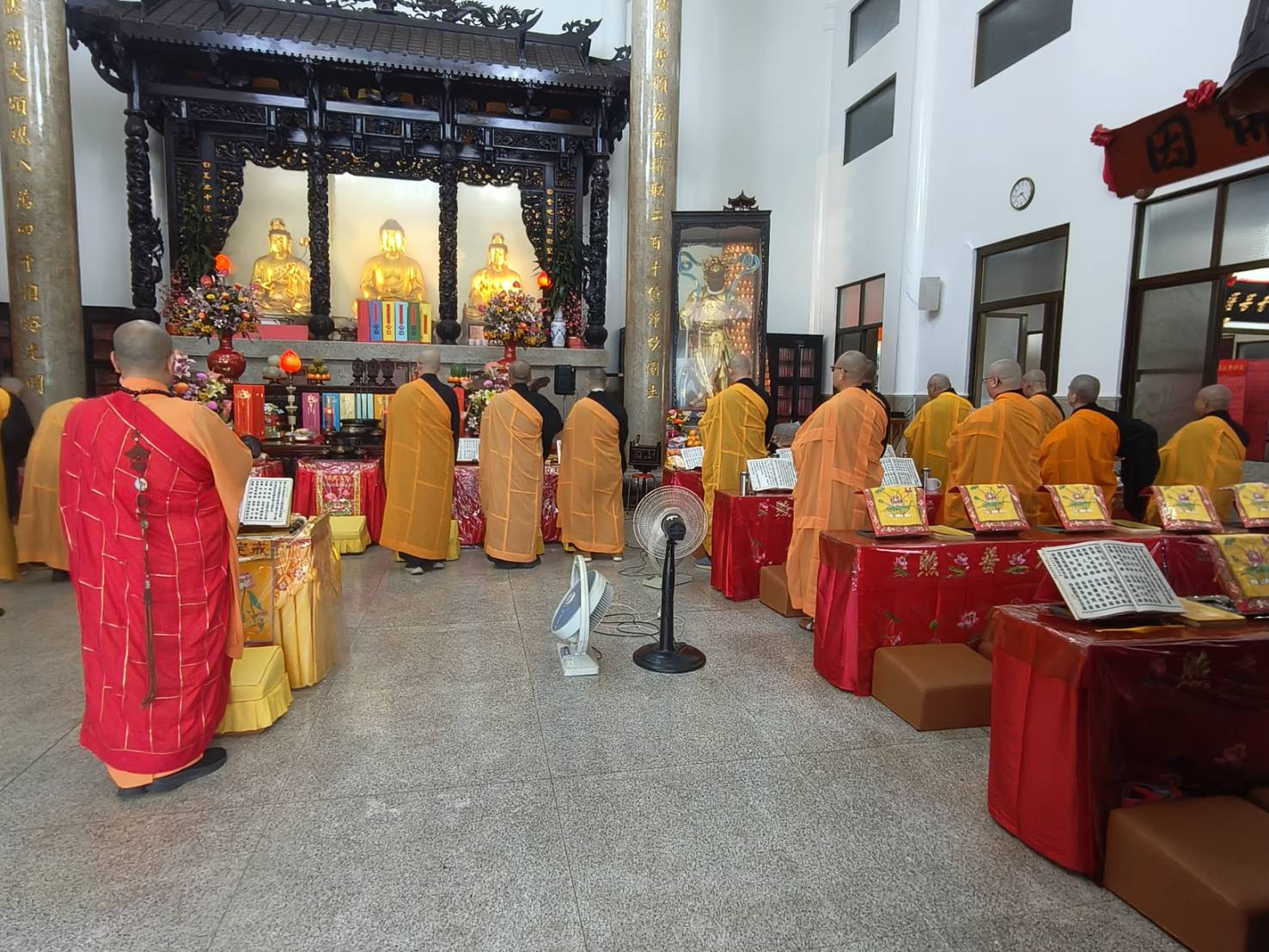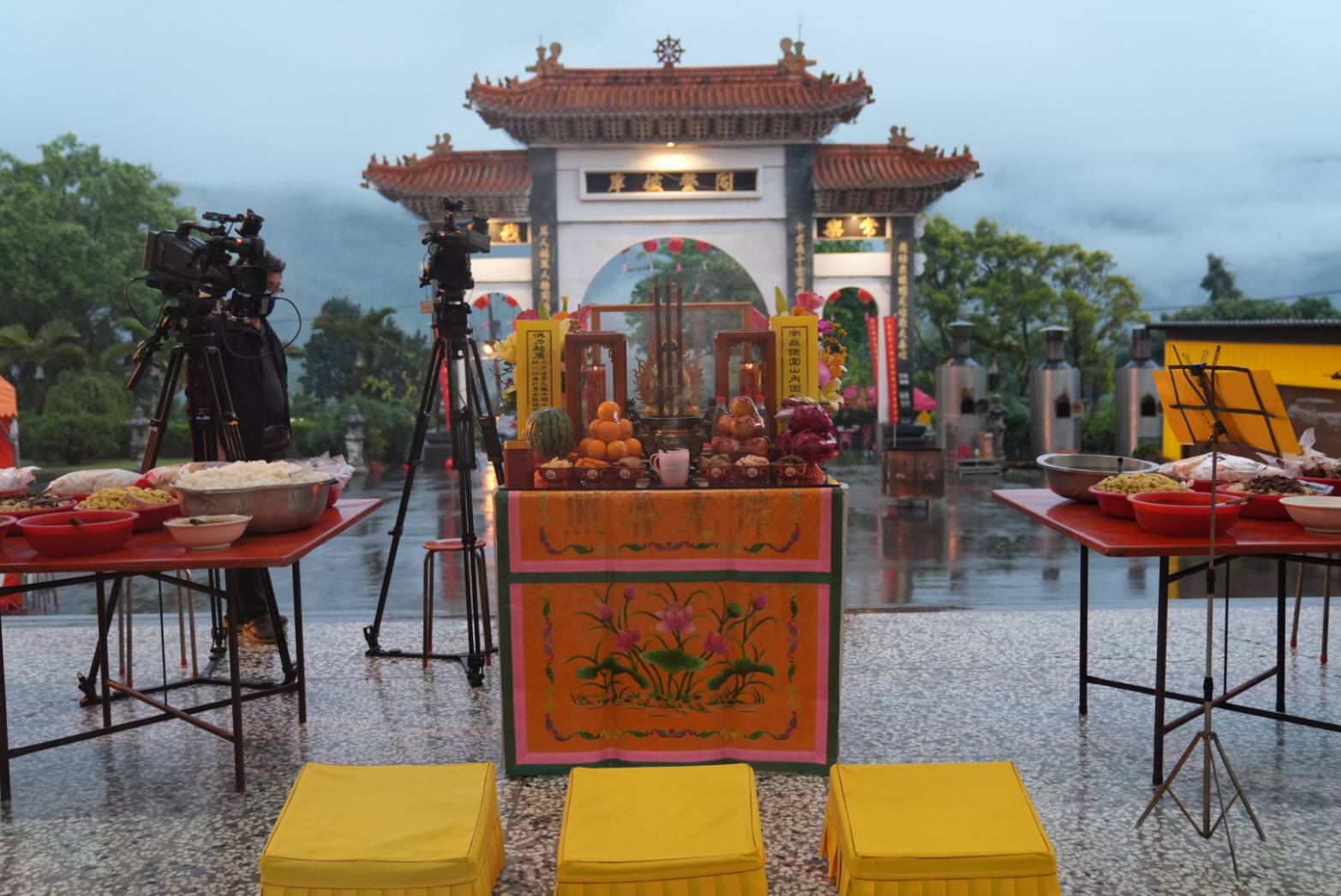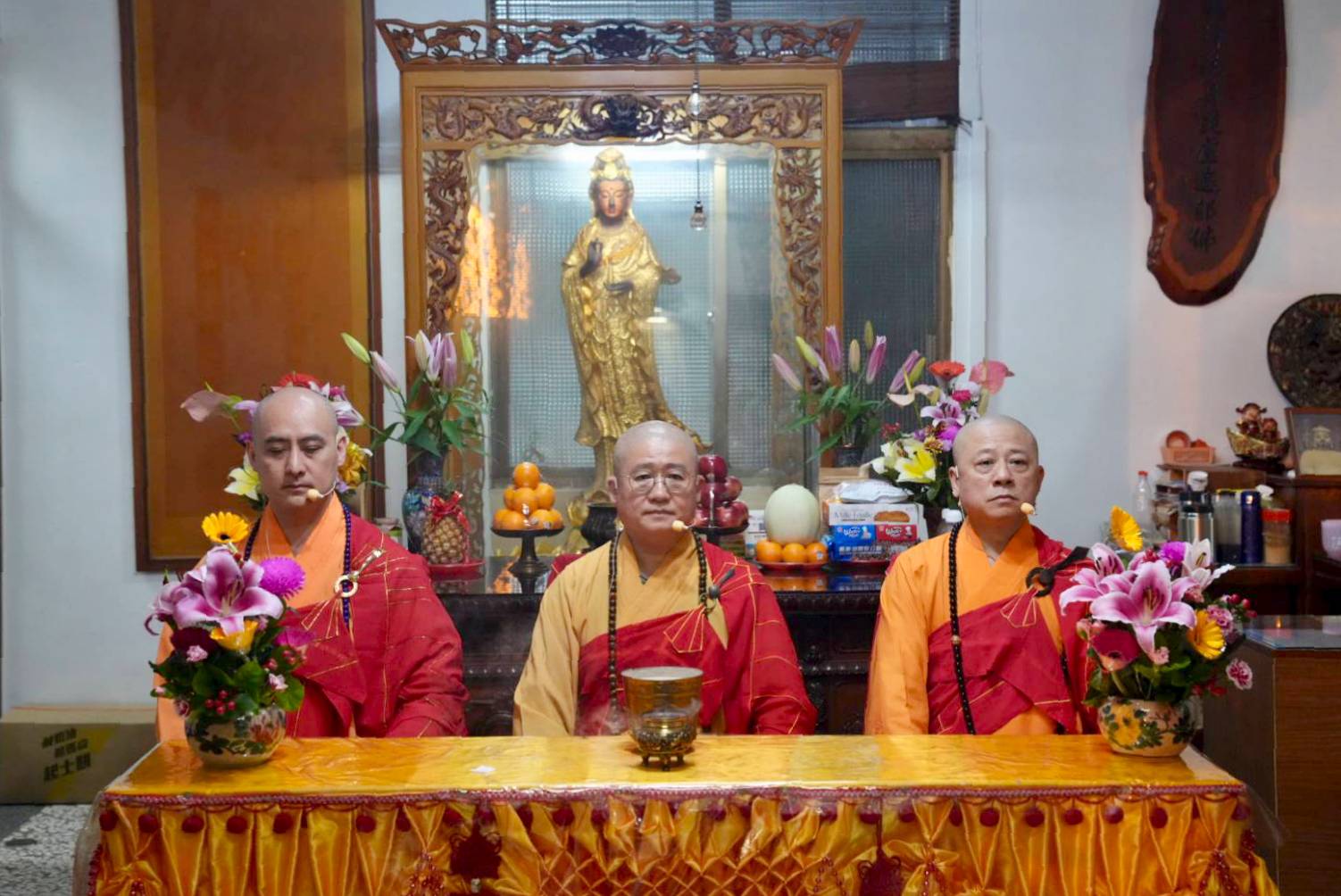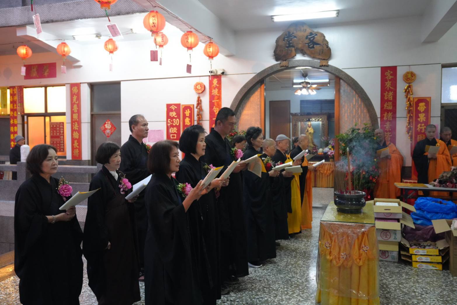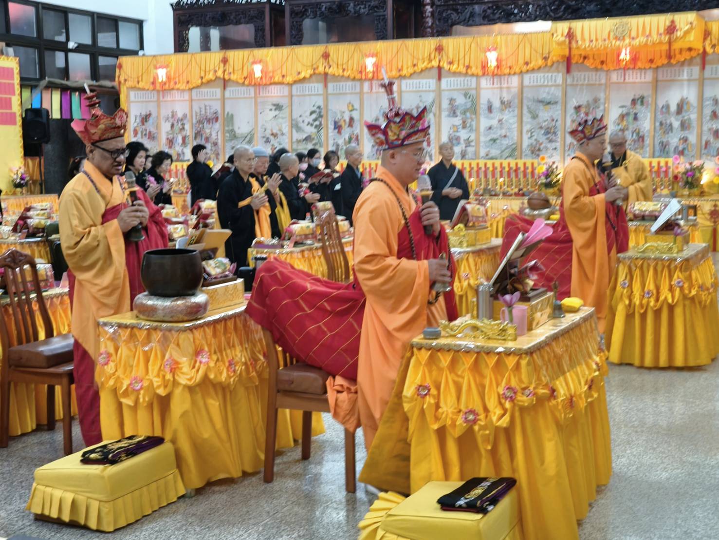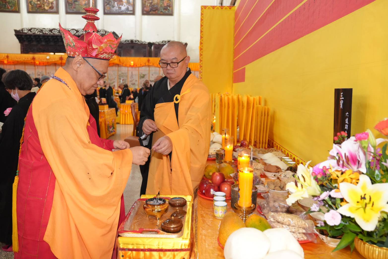 準備兩張茶几及拜墊,香燈置香盤於茶几,佛事前置下堂第1、2席前(第11、12席)