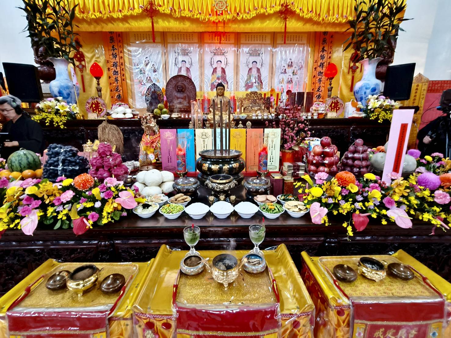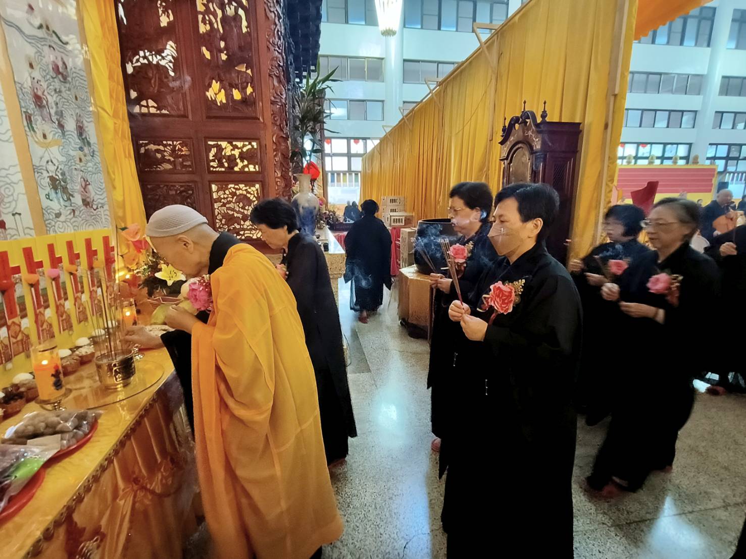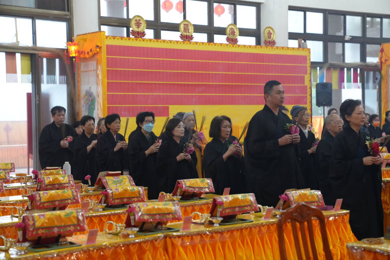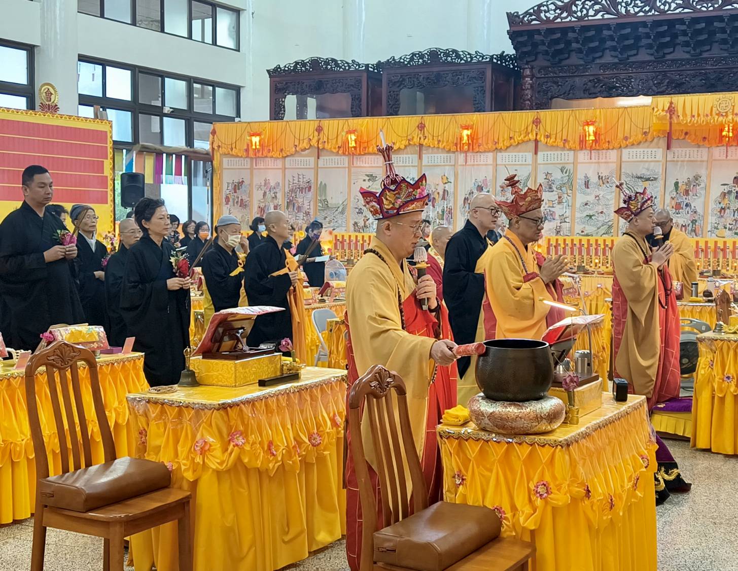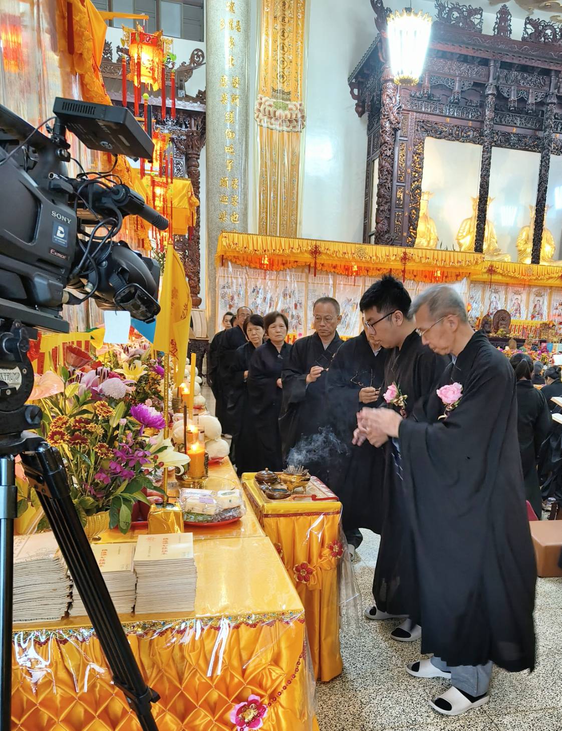 準備兩張茶几及拜墊,香燈置香盤於茶几,佛事前置下堂第1、2席前(第11、12席)
