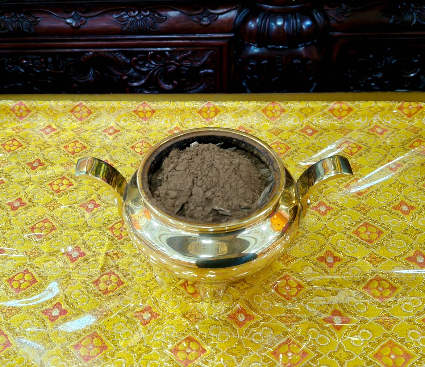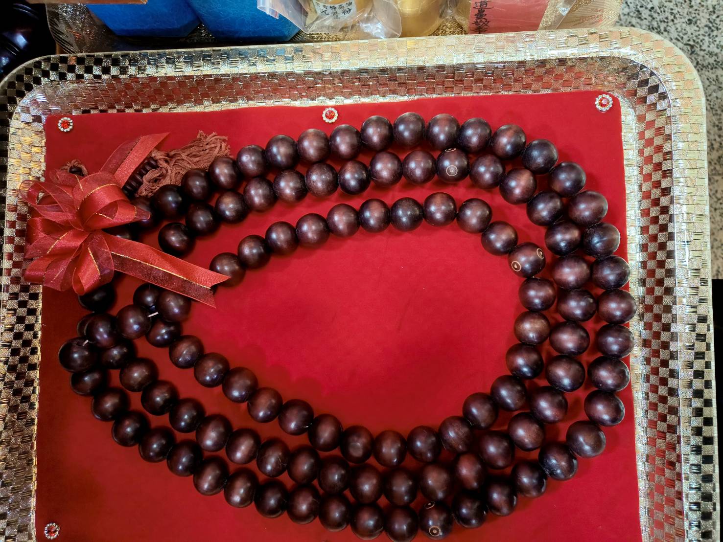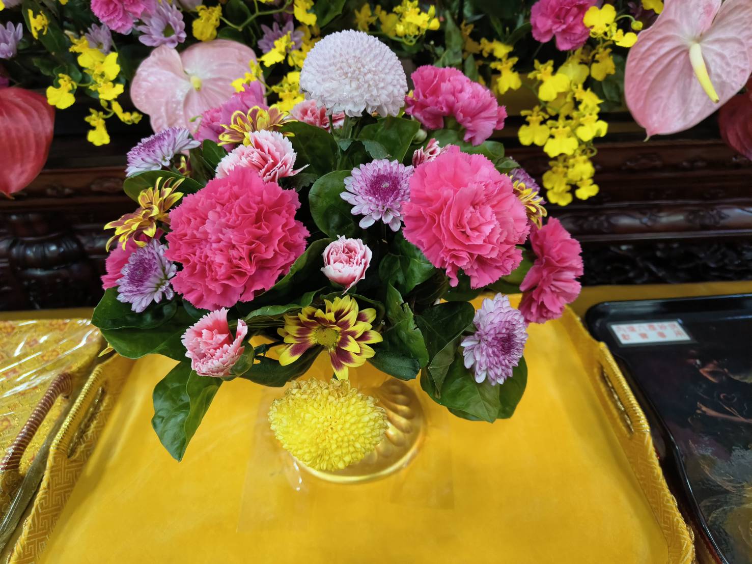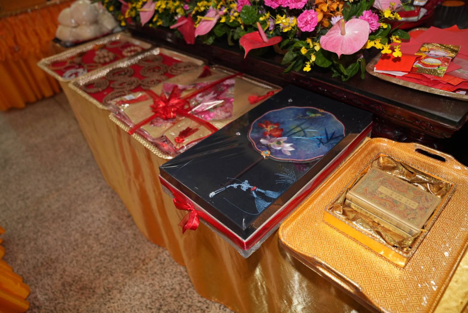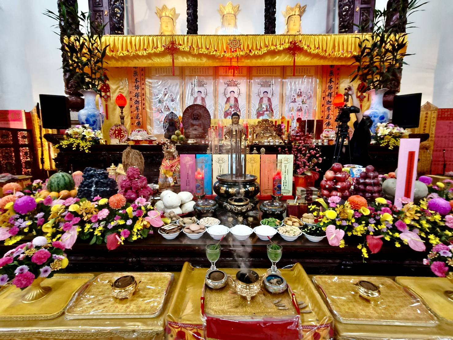 準備兩張茶几及拜墊,香燈置香盤於茶几,佛事前置下堂第1、2席前(第11、12席)