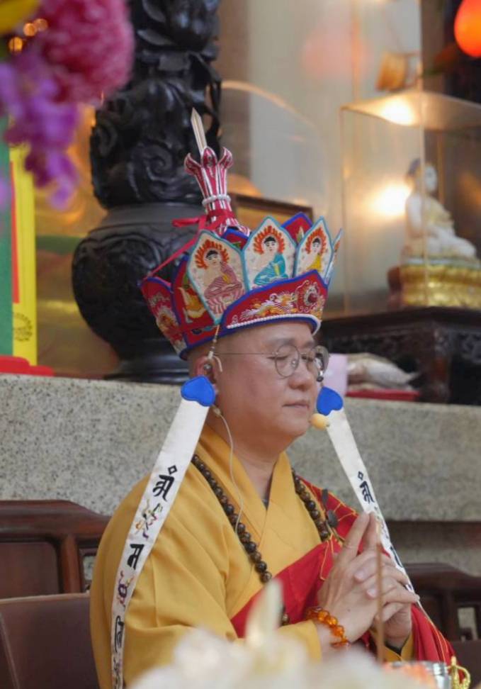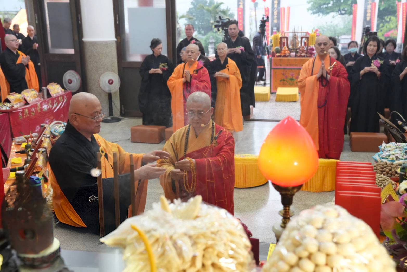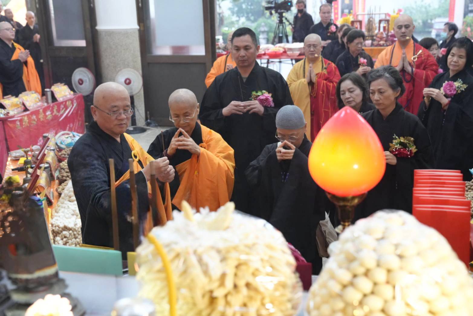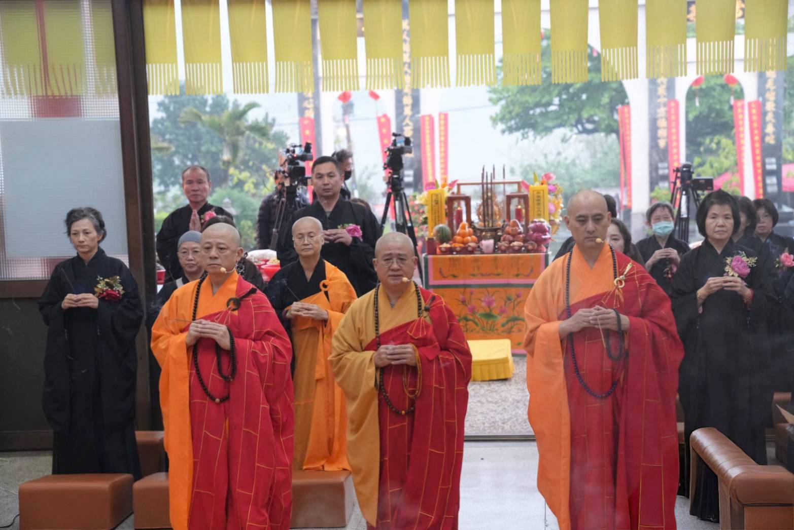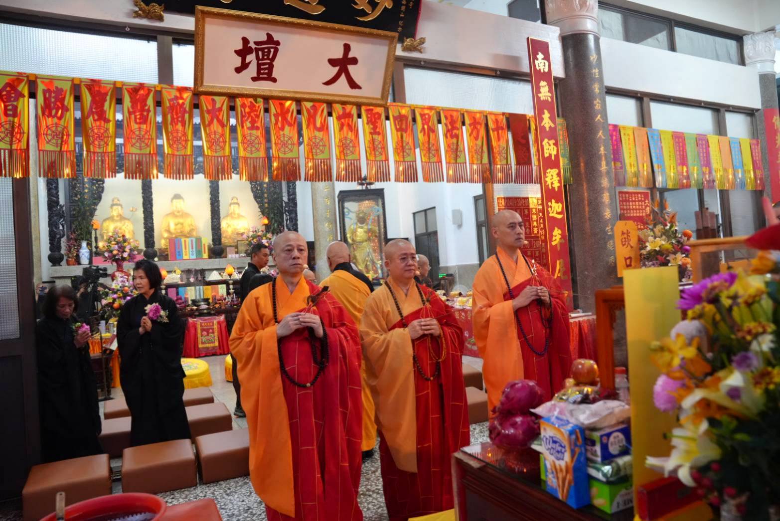 香燈引領上傳下敦師父跟齋主到法堂恭請三位和尚