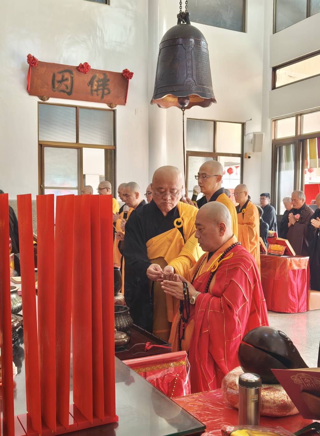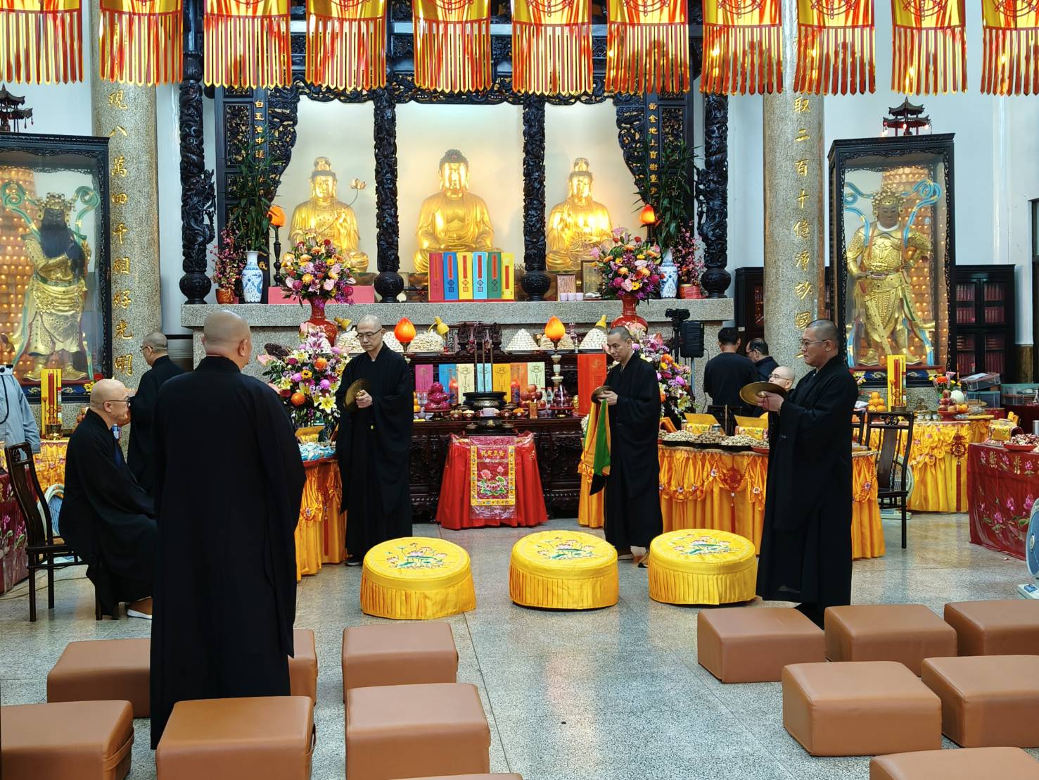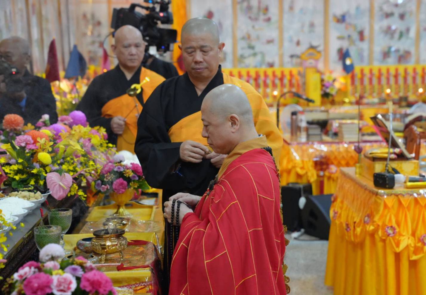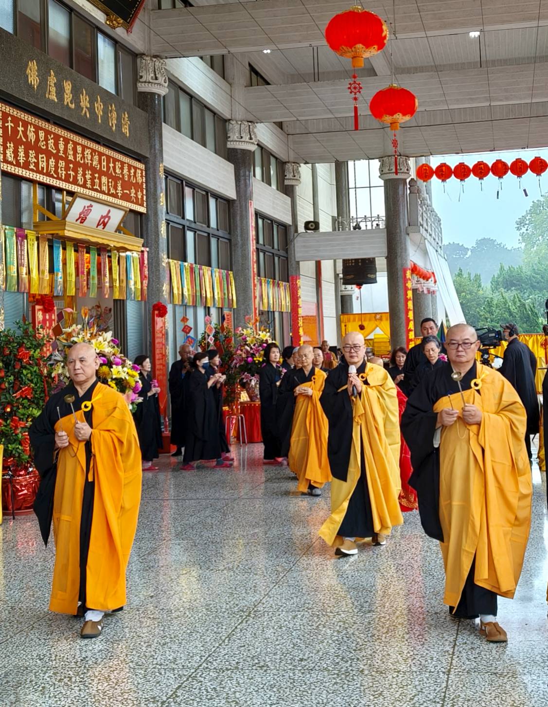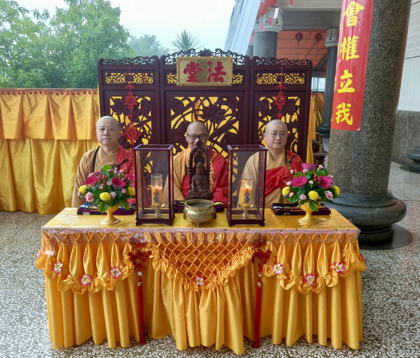 香燈引領上傳下敦師父跟齋主到法堂恭請三位和尚
