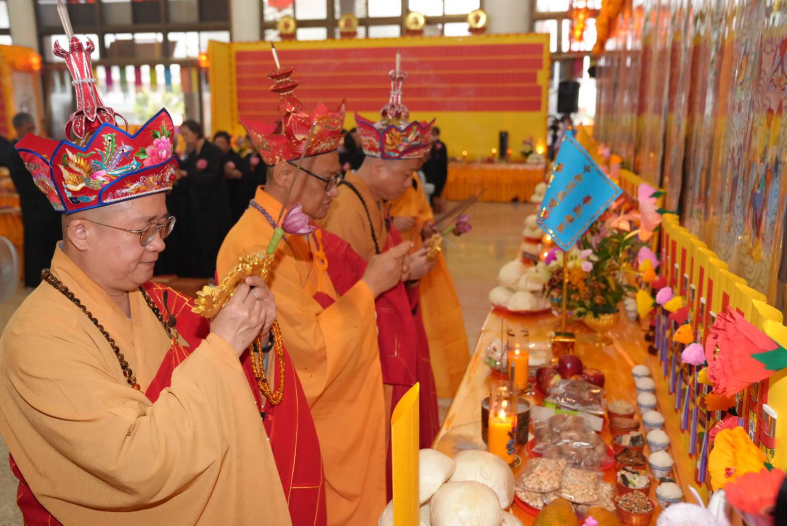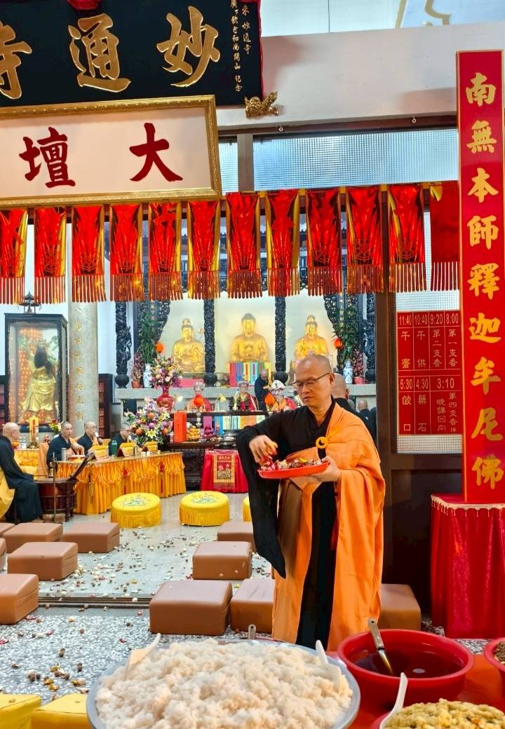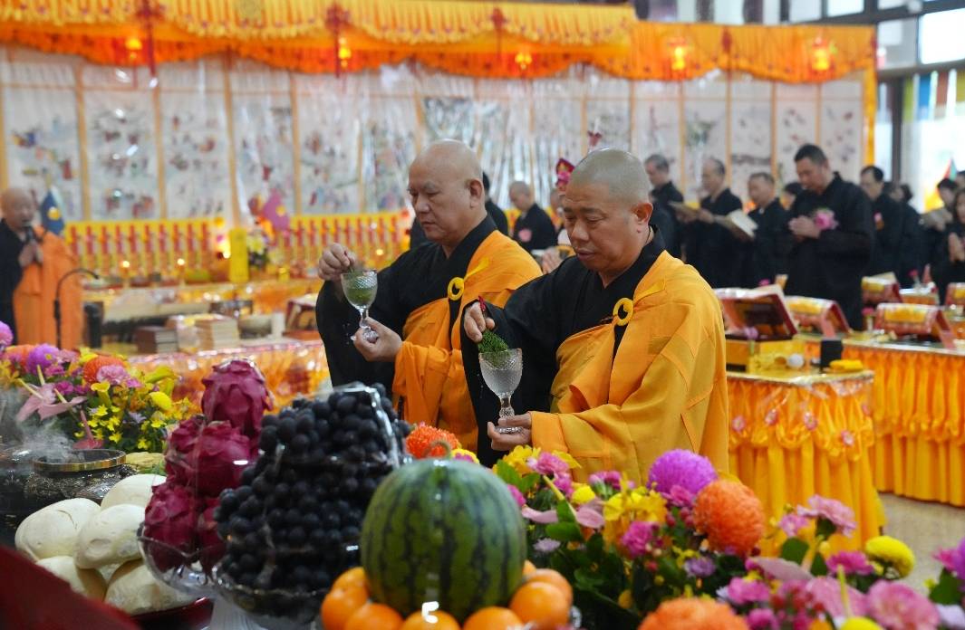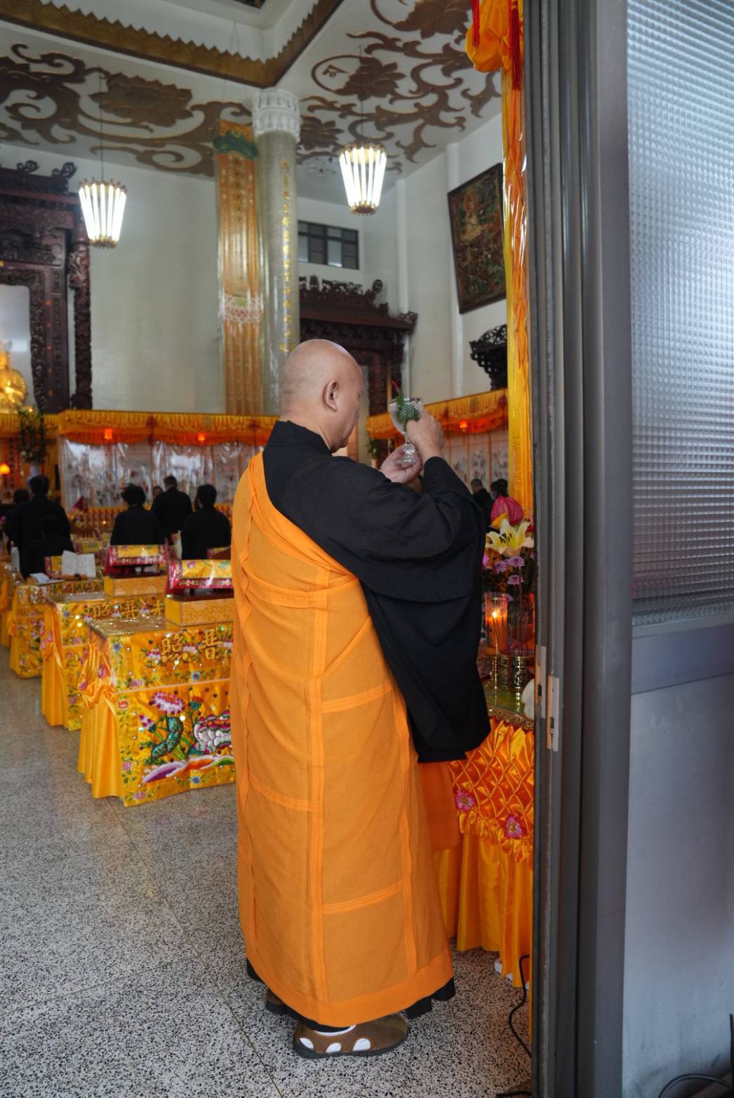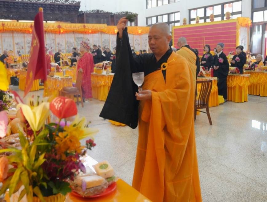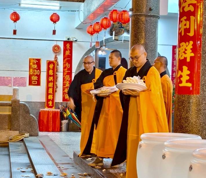 誦持「施甘露真言」時,兩位香燈分東西單,以水灑淨於下堂14席及中央普供桌。