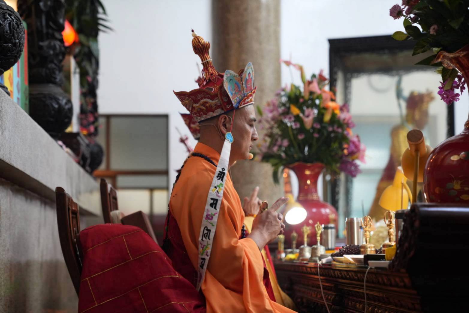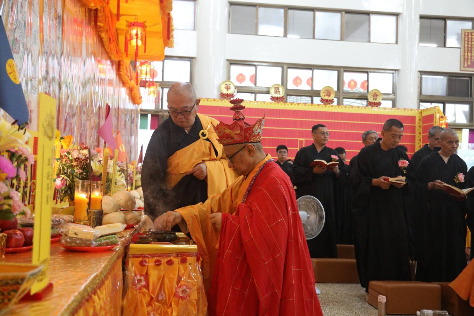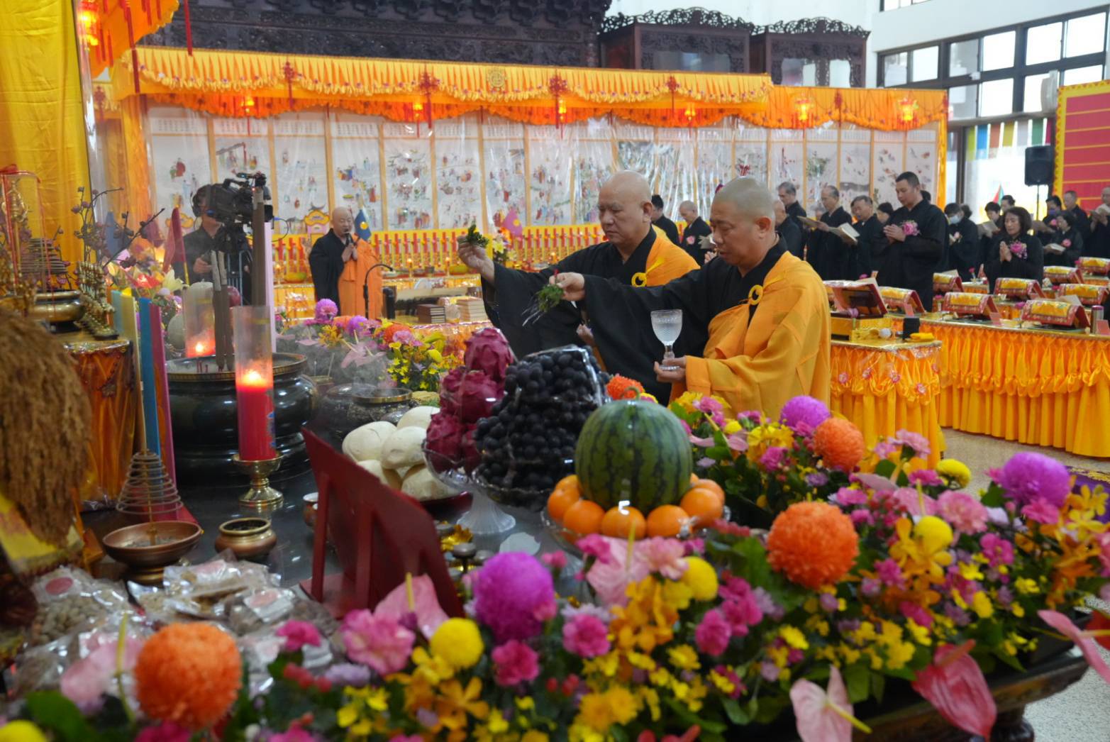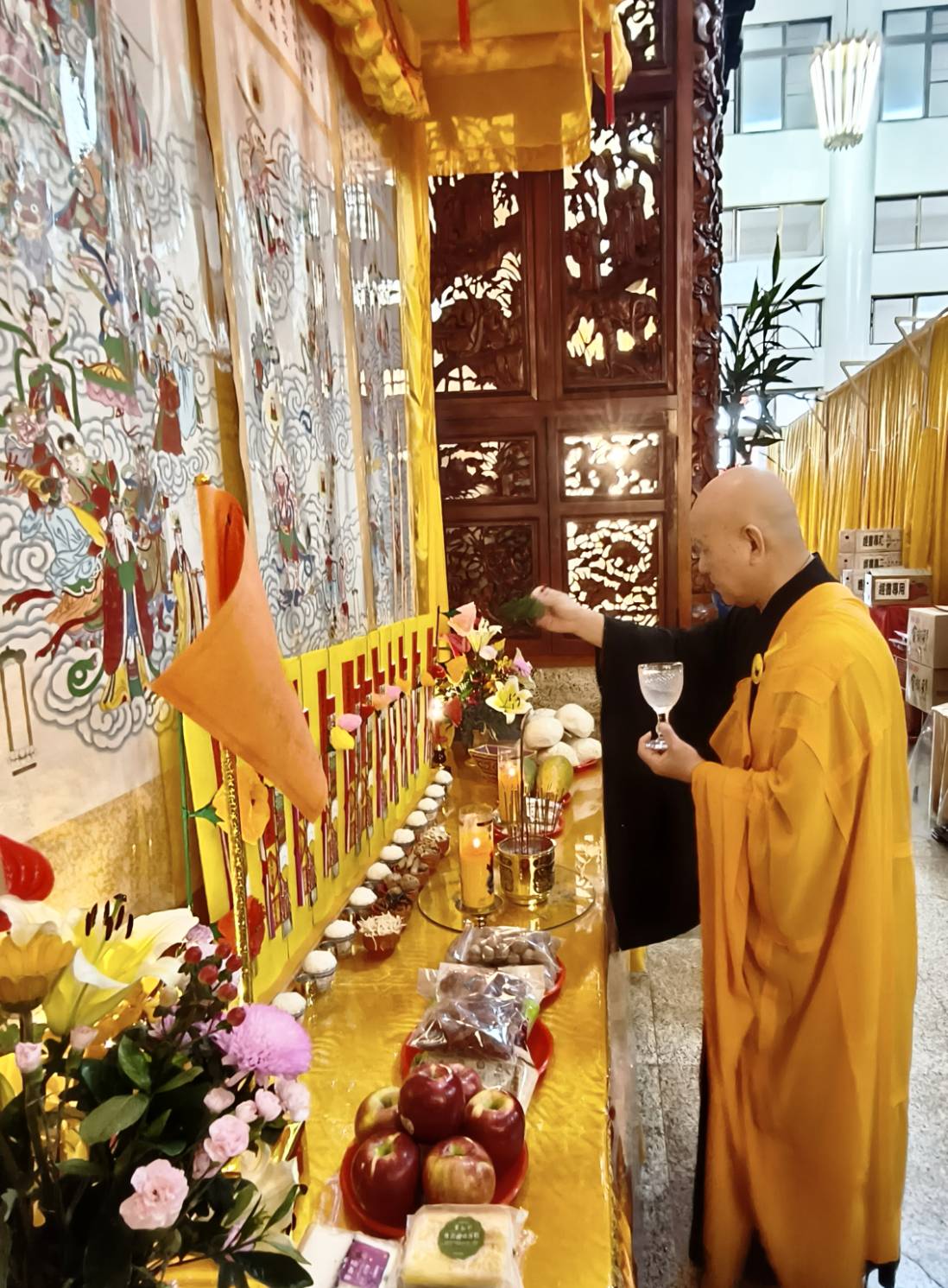 誦持「施甘露真言」時,兩位香燈分東西單,以水灑淨於下堂14席及中央普供桌。