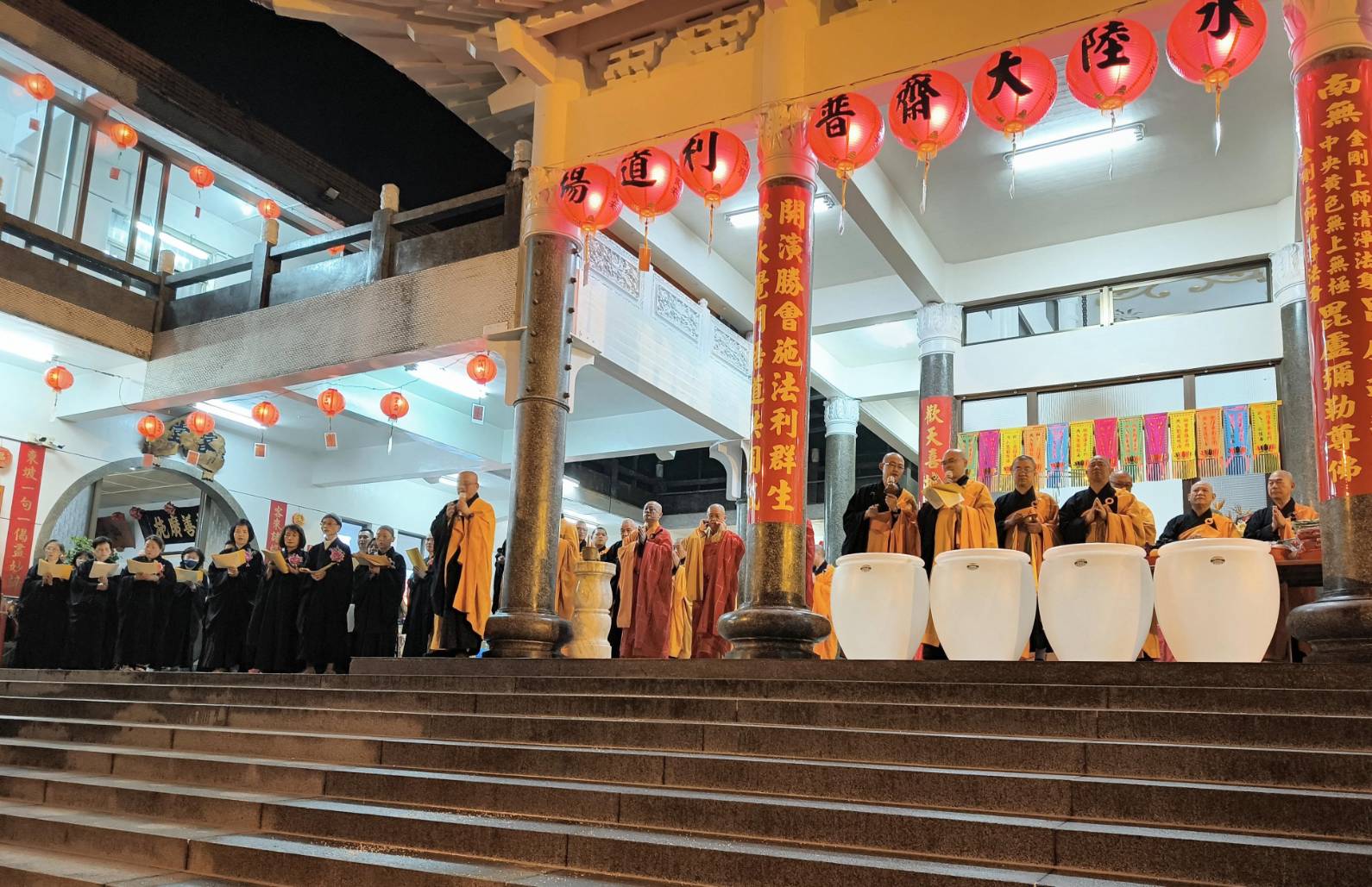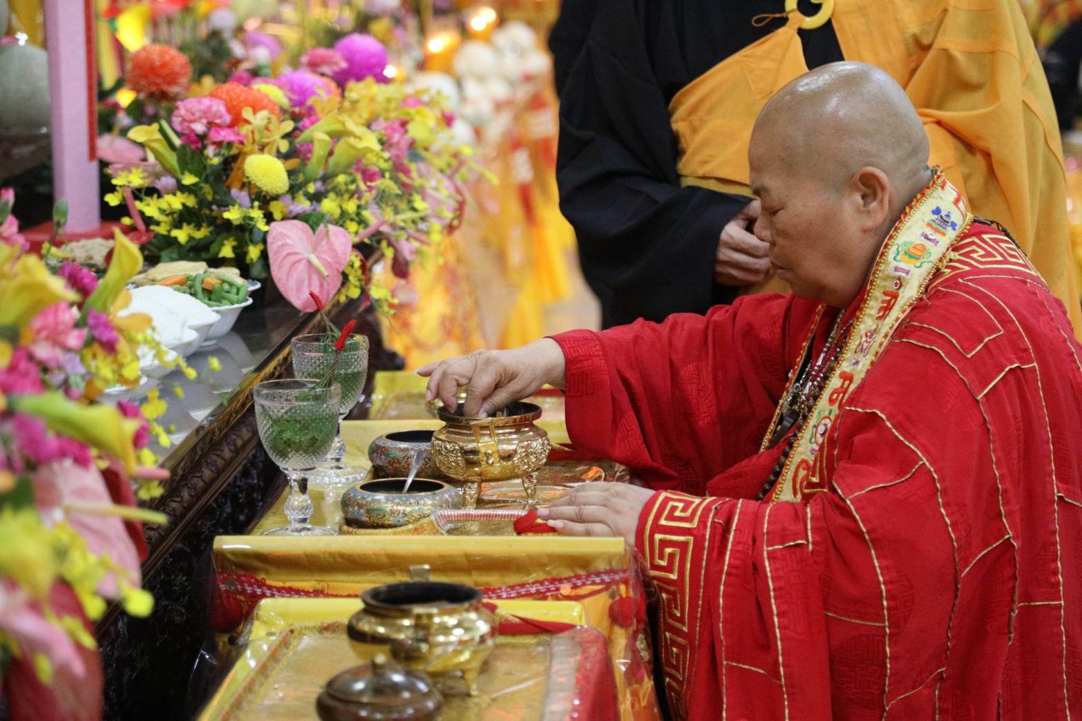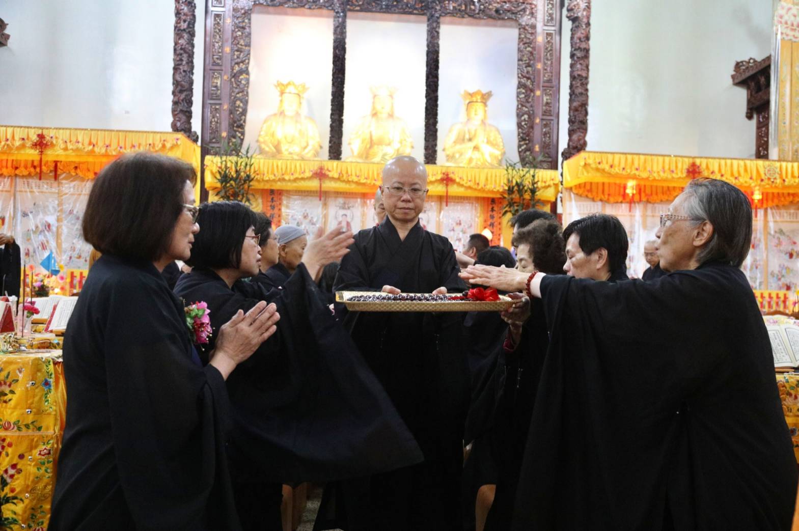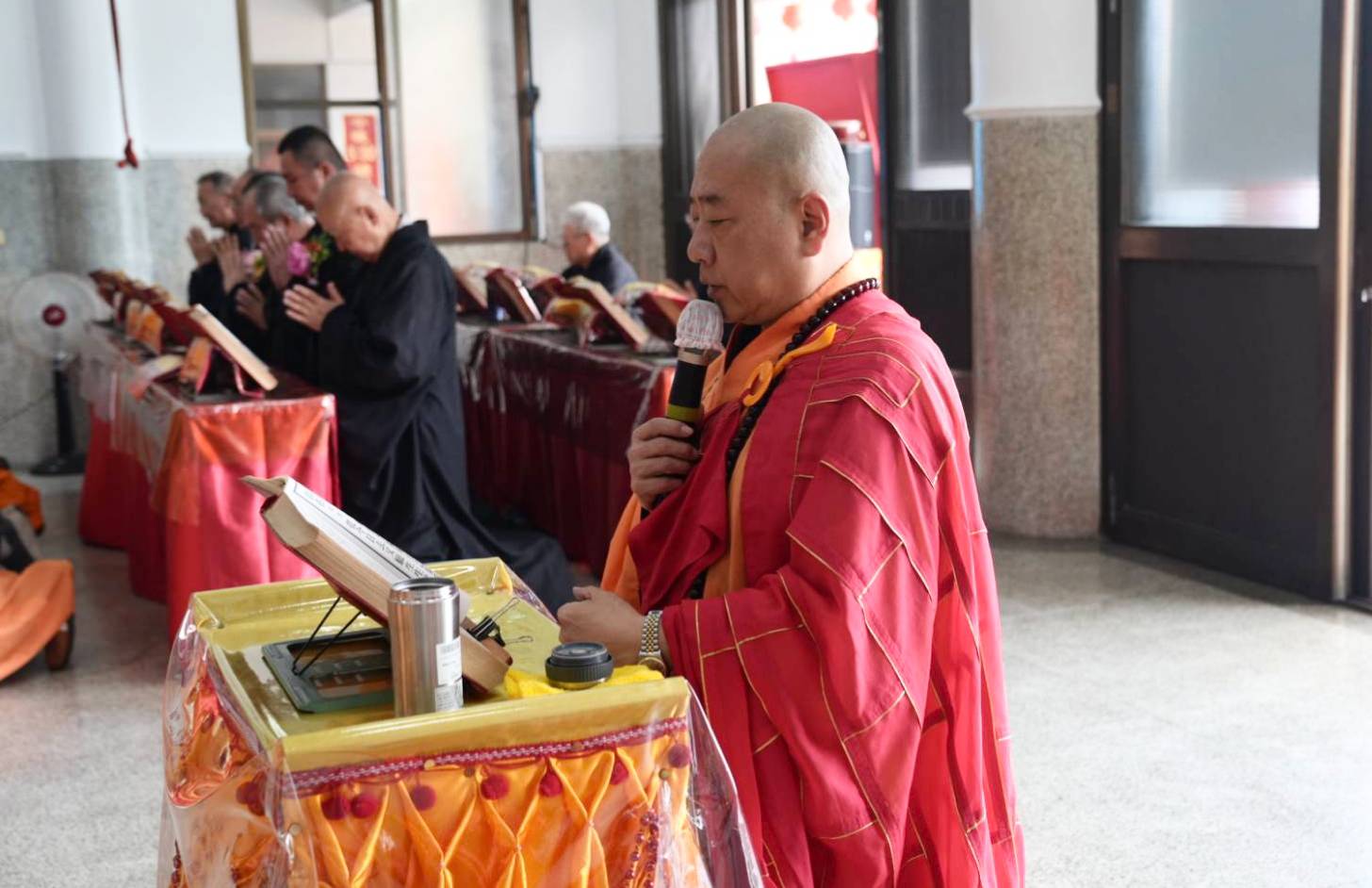 誦持「施甘露真言」時,兩位香燈分東西單,以水灑淨於下堂14席及中央普供桌。