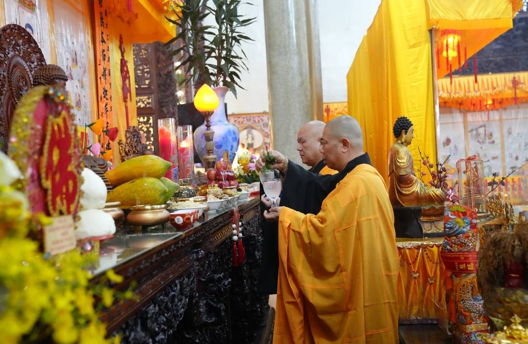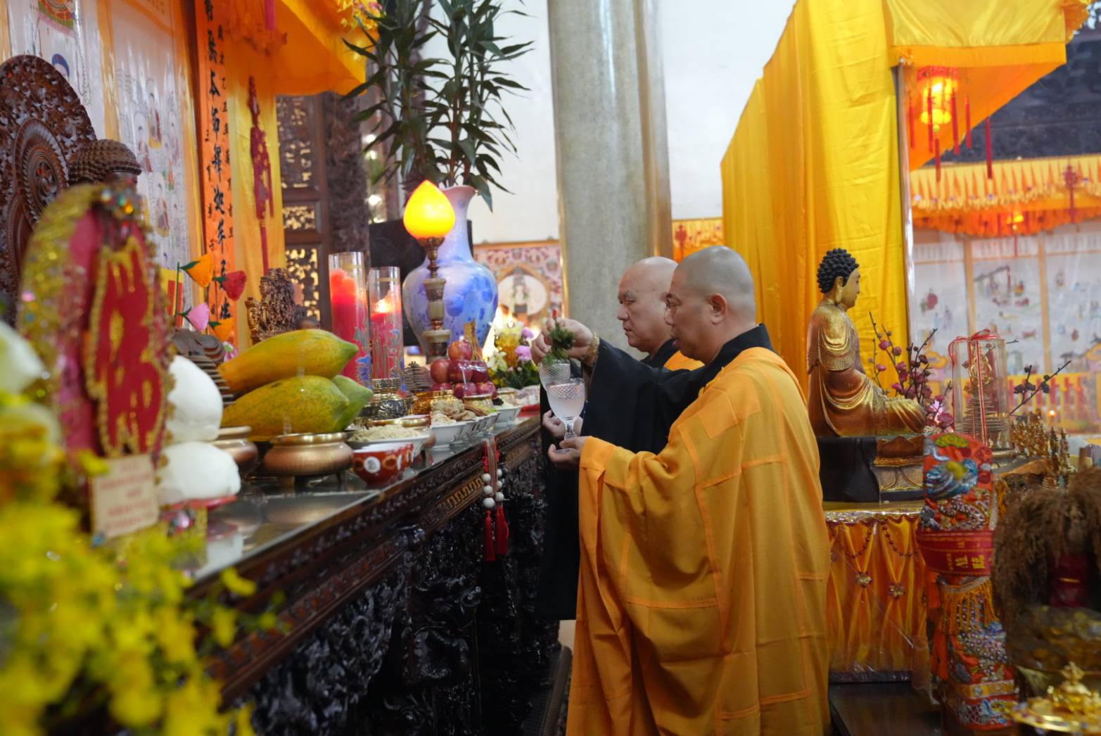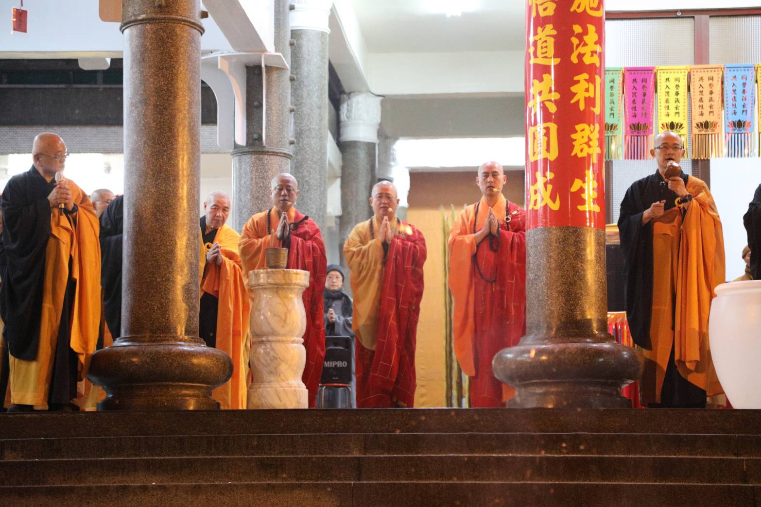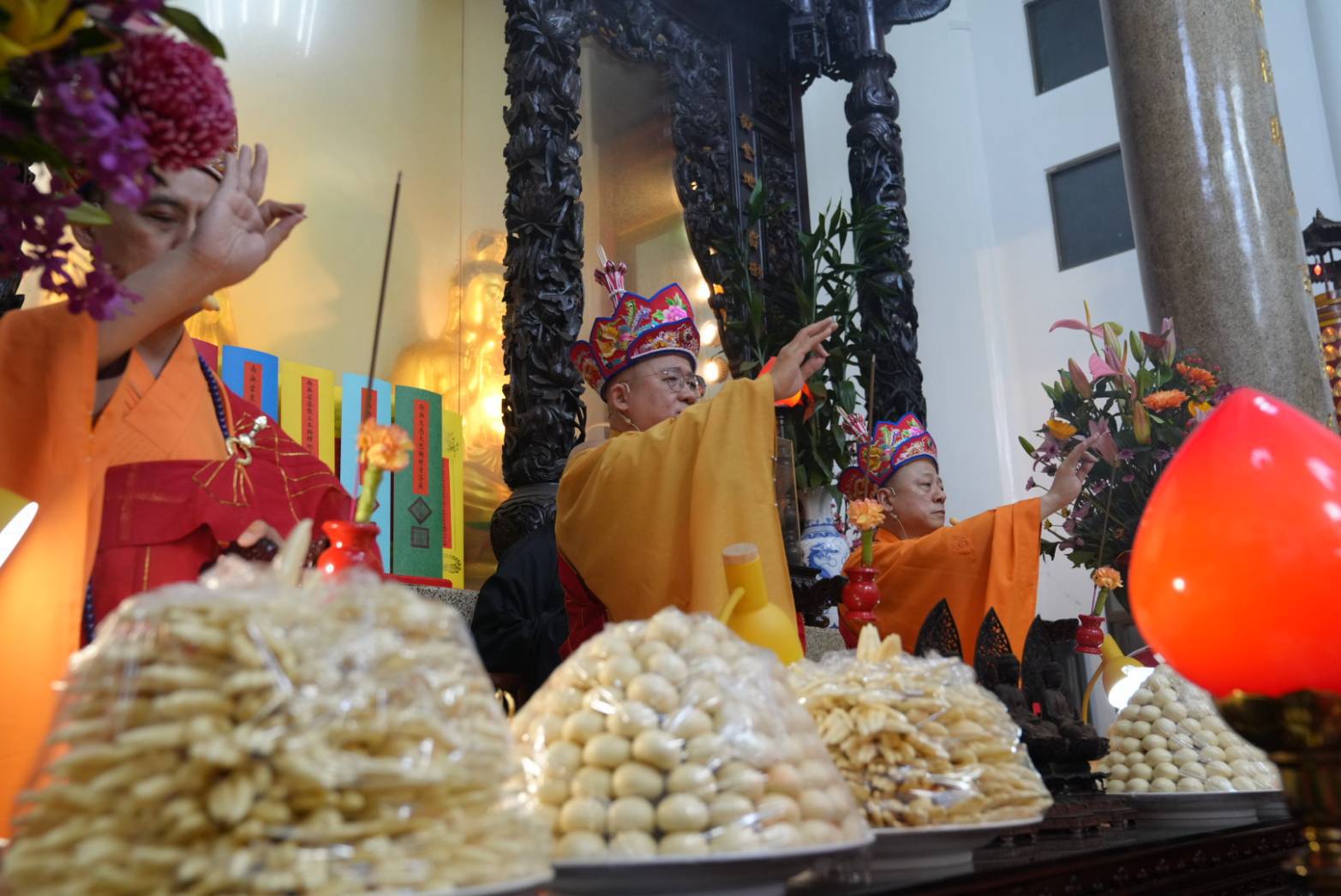 誦持「施甘露真言」時,兩位香燈分東西單,以水灑淨於下堂14席及中央普供桌。