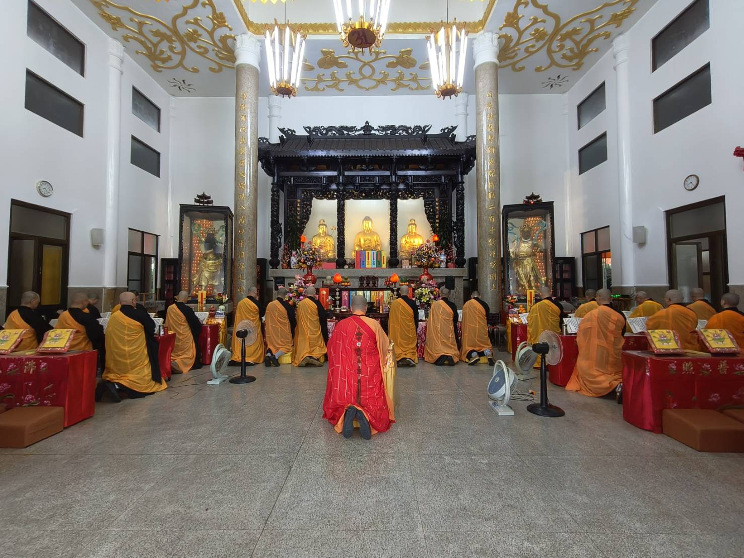 誦持「灑淨真言」時,兩位香燈分東西單,以水灑淨於下堂14席。