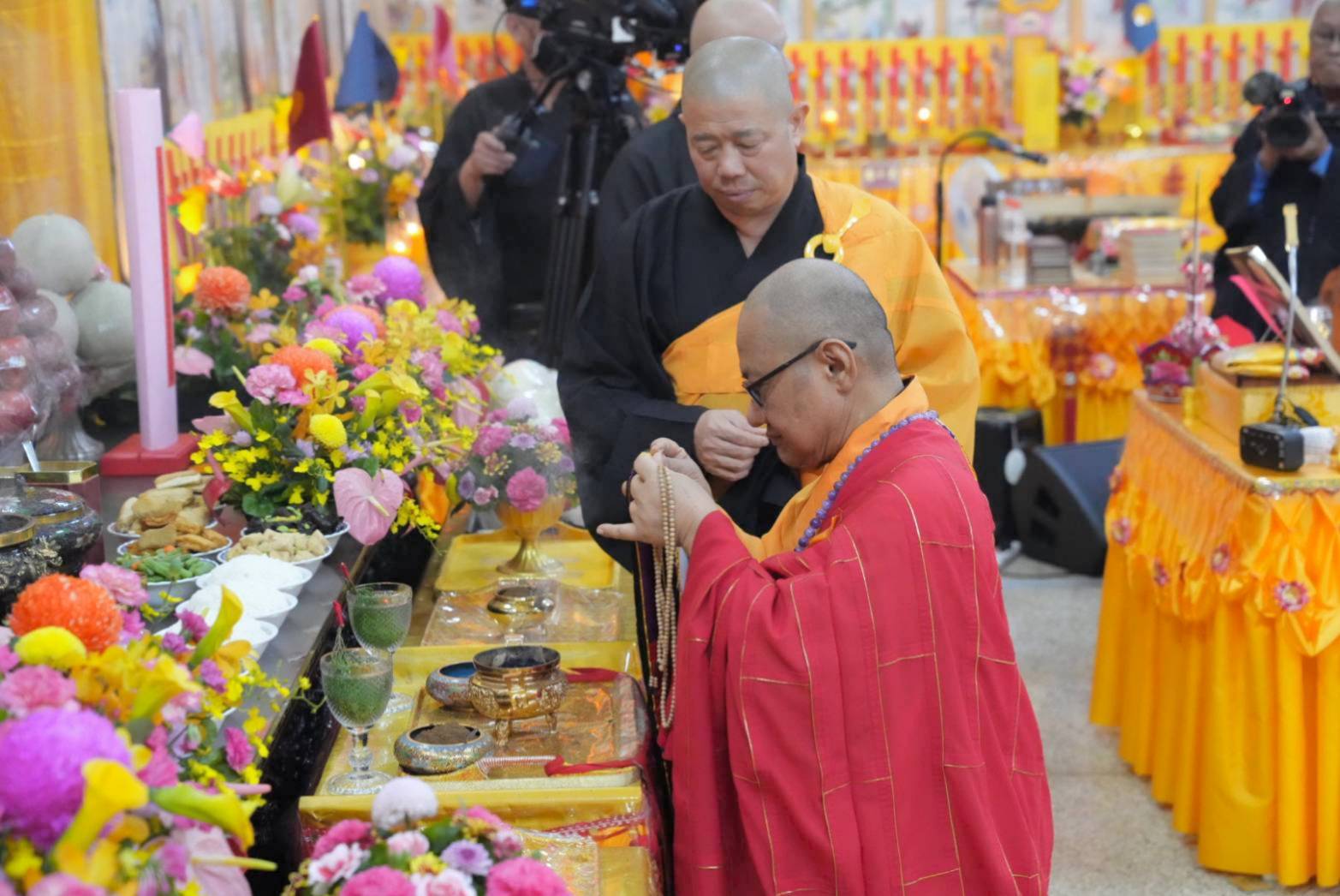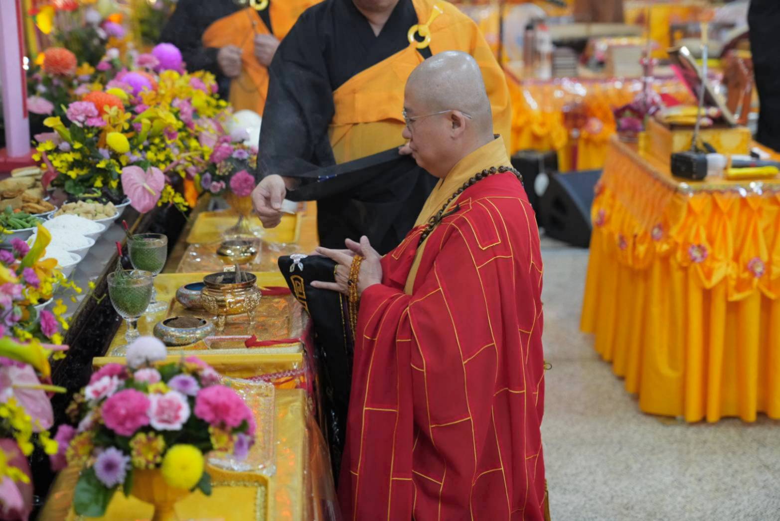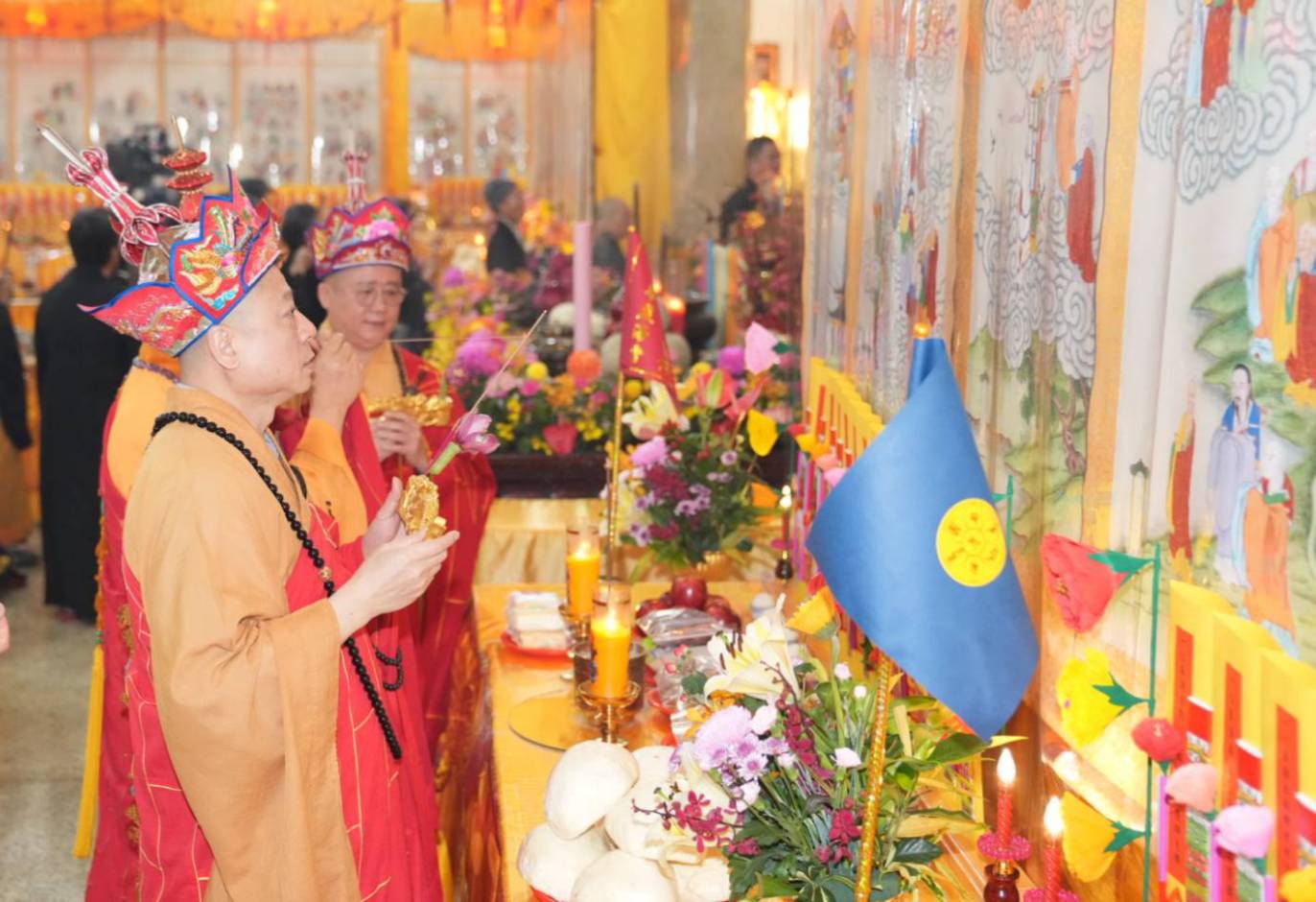 舉讚畢,正表、助表執手爐,領主法至第1〜10席上香。上傳下敦師父和齋主隨後依次各席上香,至韋馱菩薩、伽藍菩薩。