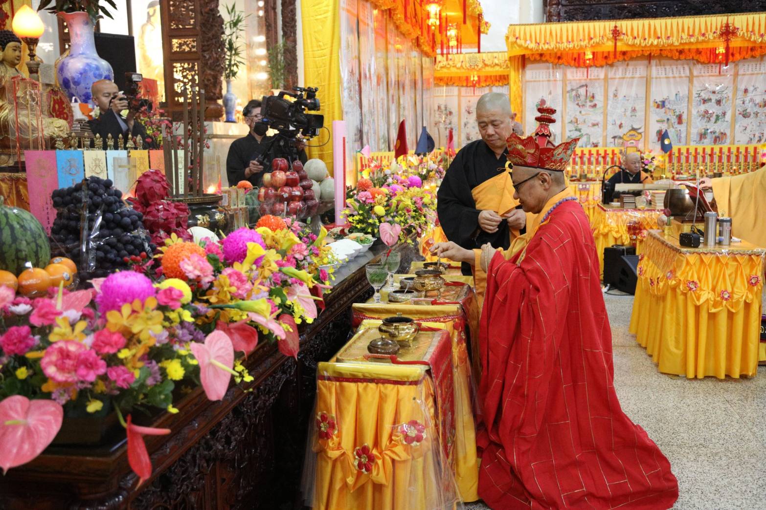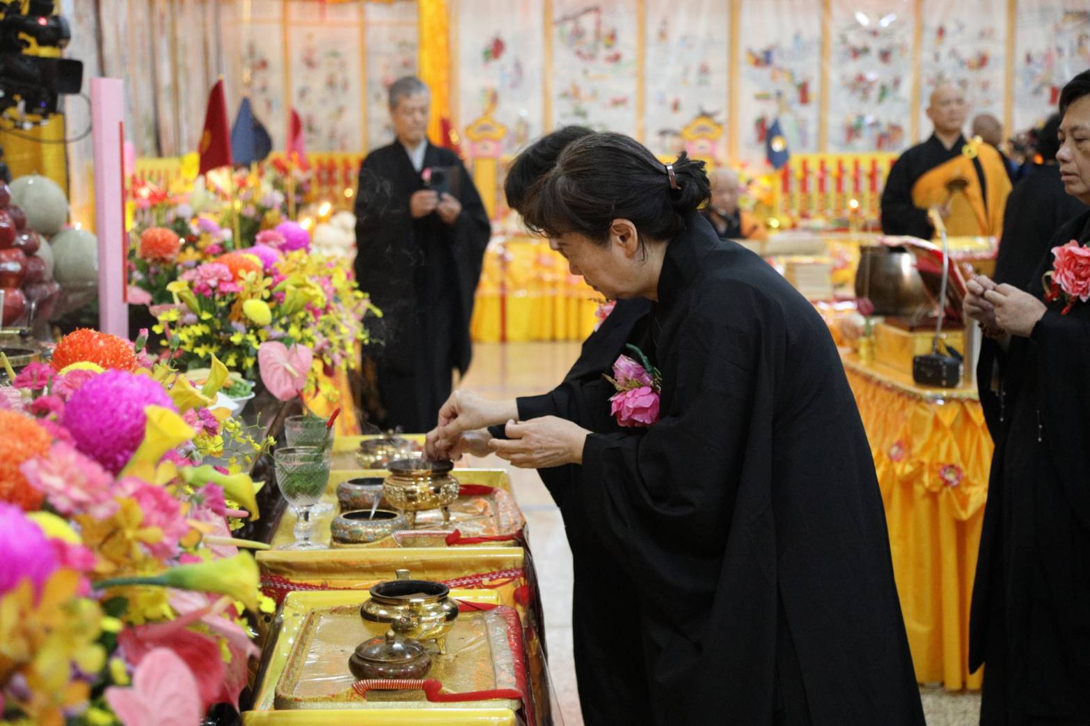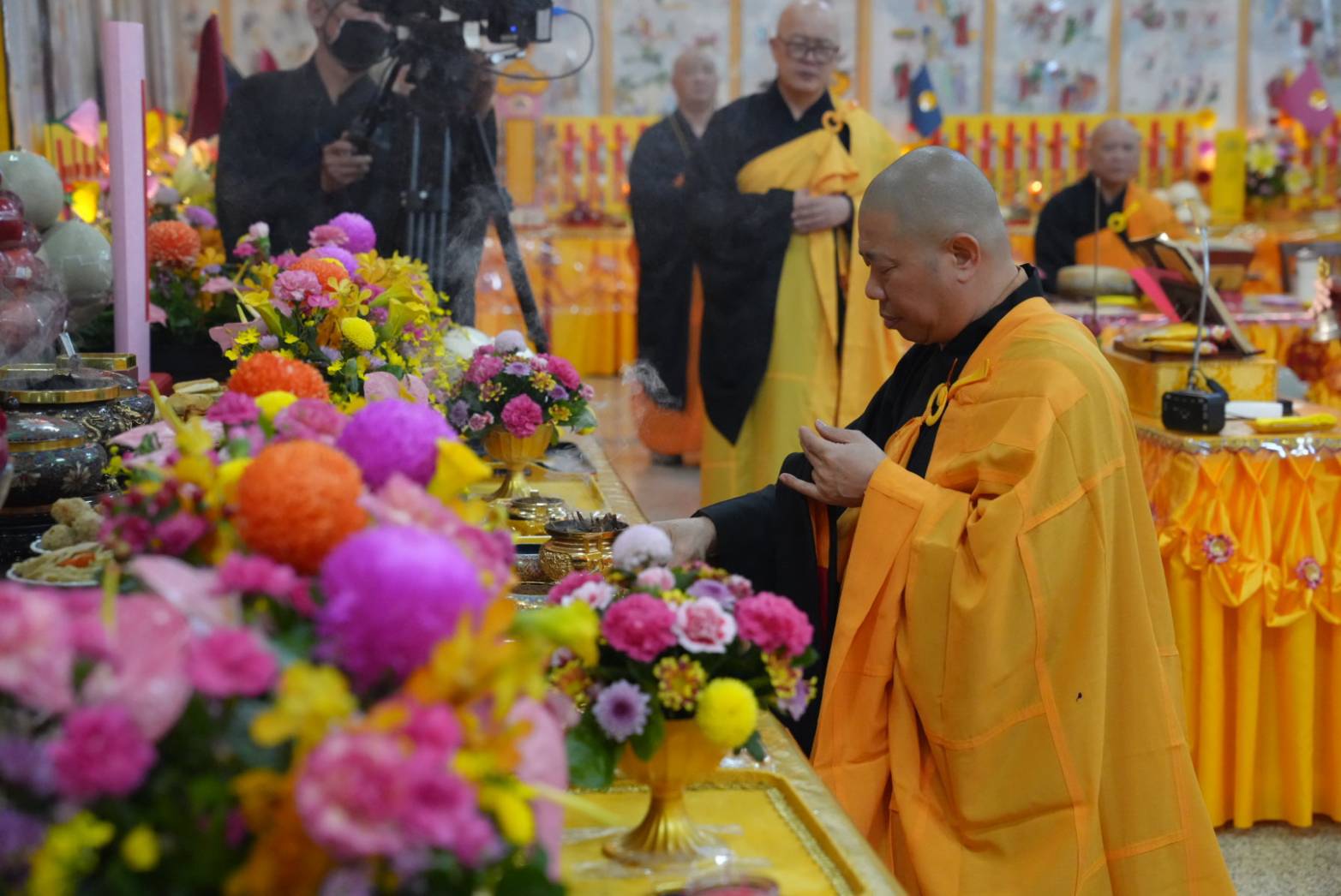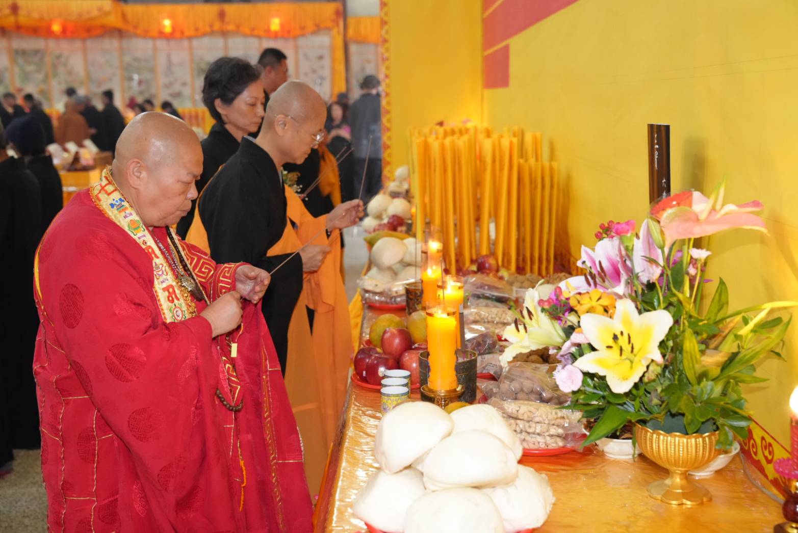 舉讚畢,正表、助表執手爐,領主法至第1〜10席上香。上傳下敦師父和齋主隨後依次各席上香,至韋馱菩薩、伽藍菩薩。