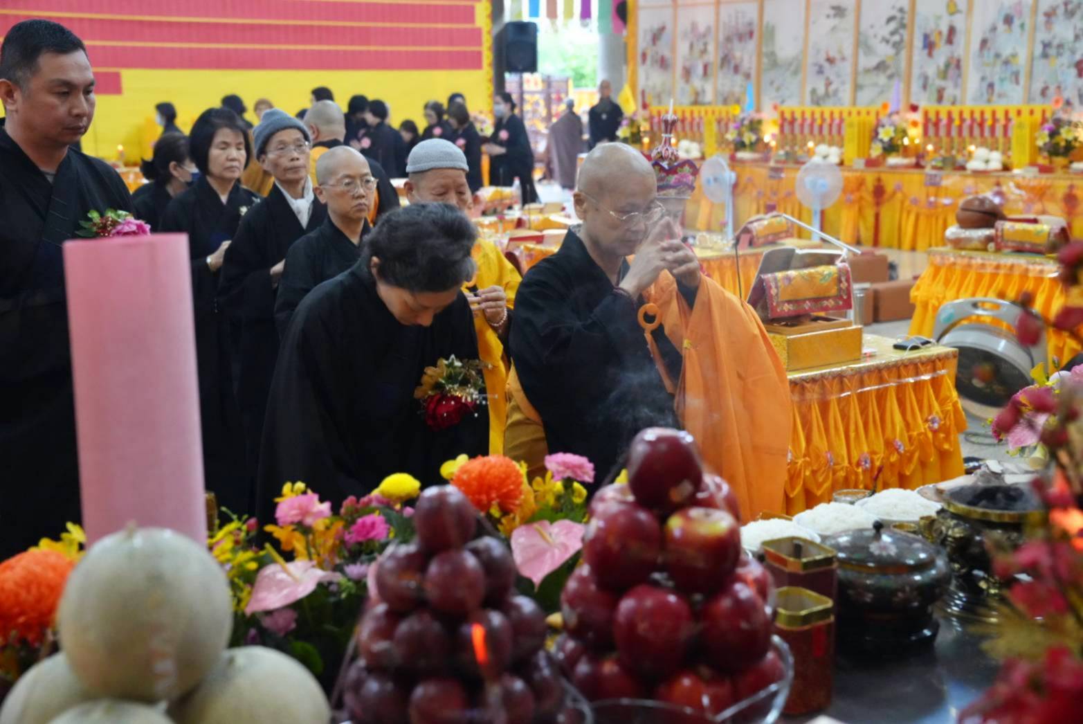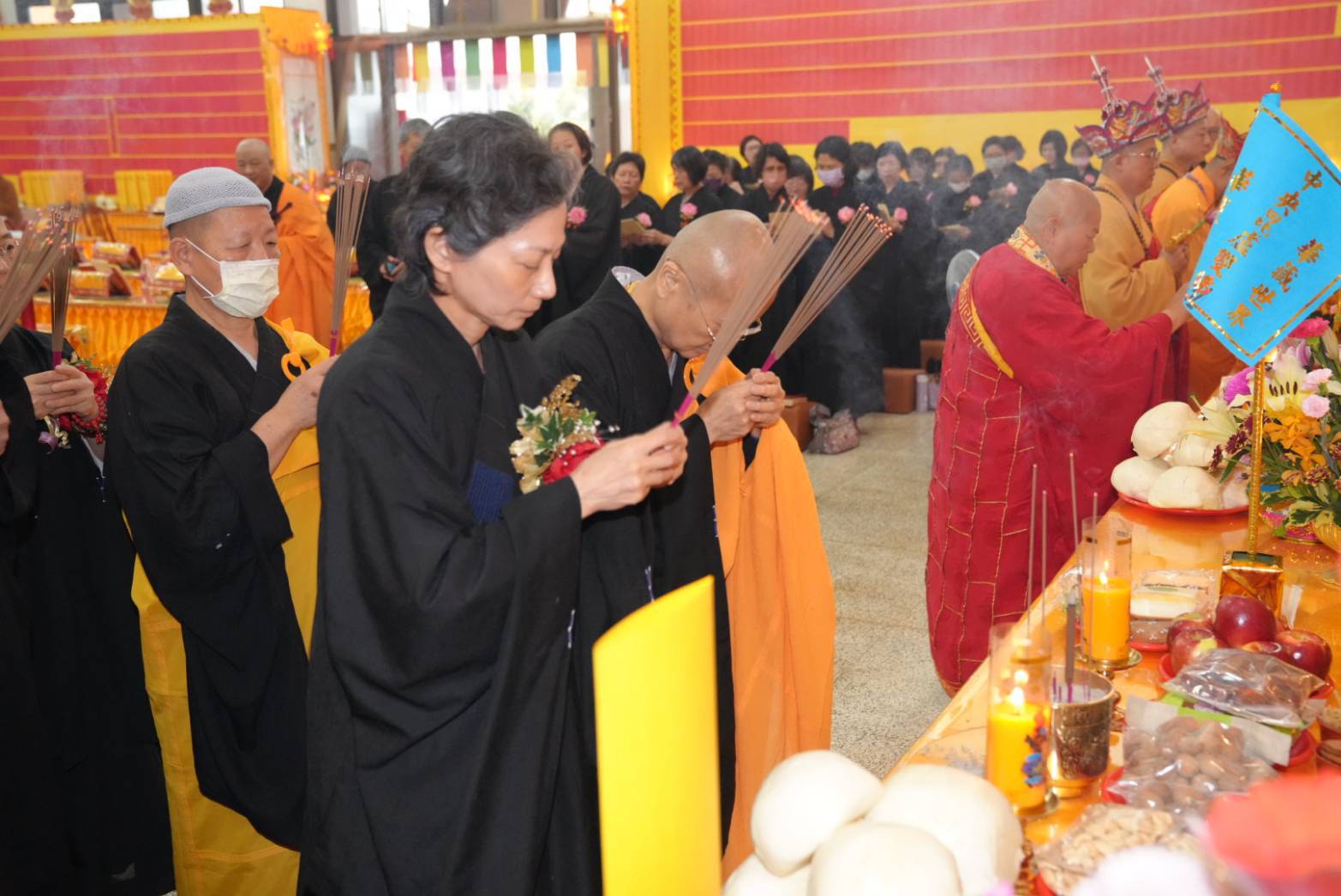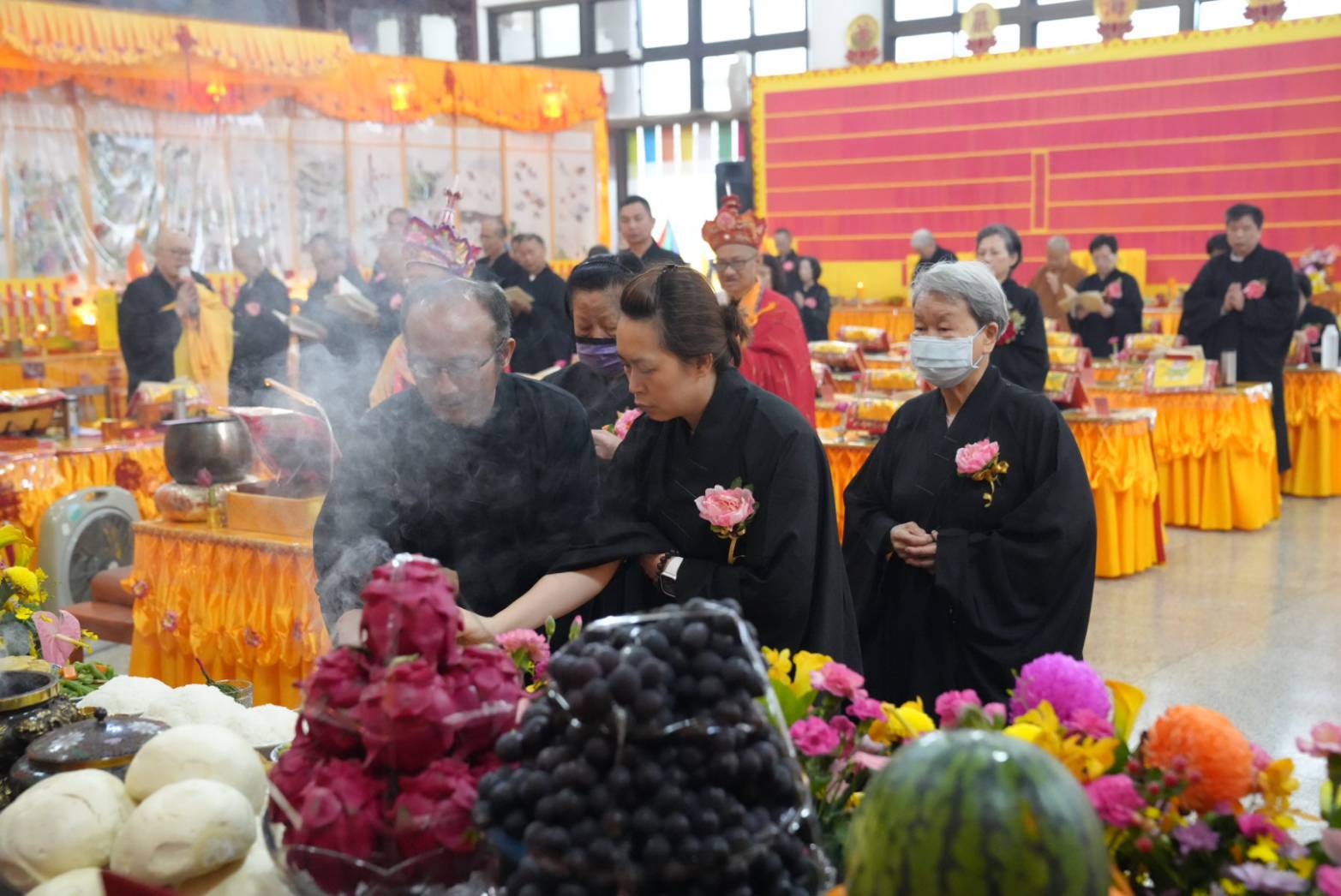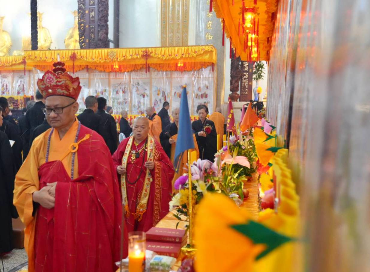 六塵妙供圓滿,誦《佛說阿彌陀經》,正表、助表執手爐,主法、上傳下敦師父、齋主出位下堂14席上香。