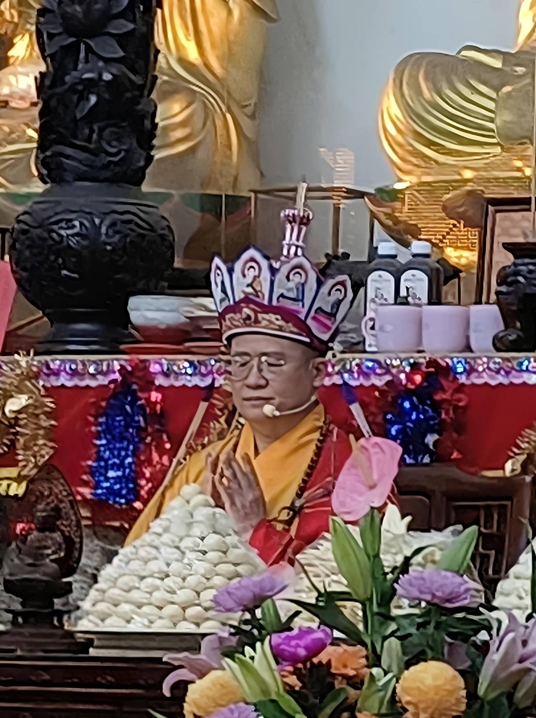 法師宣:「啟建法界聖凡水陸普度大齋勝會道場證盟功德文疏」。齋主專心聆聽金剛上師宣疏。