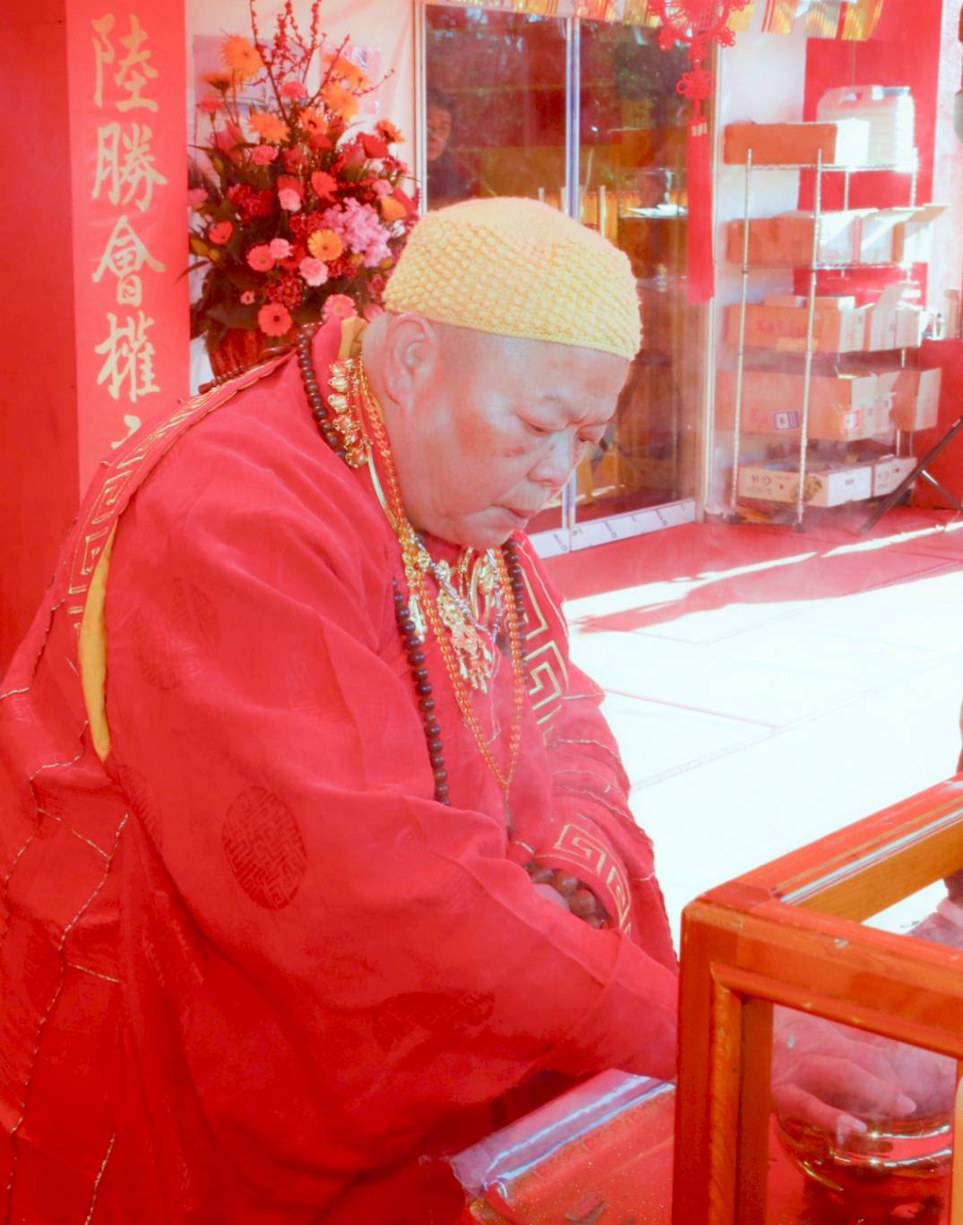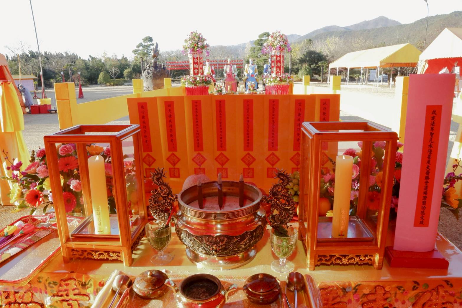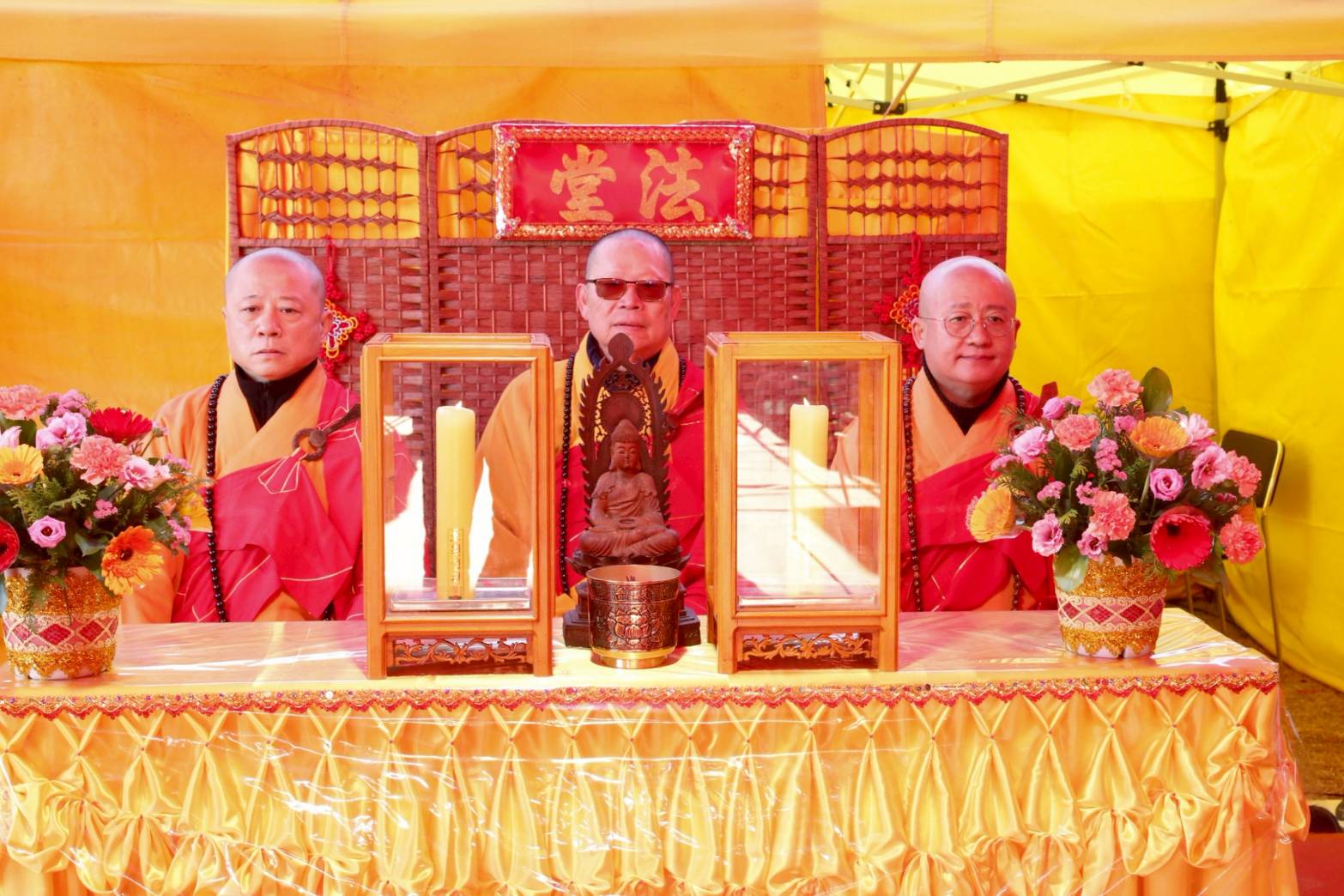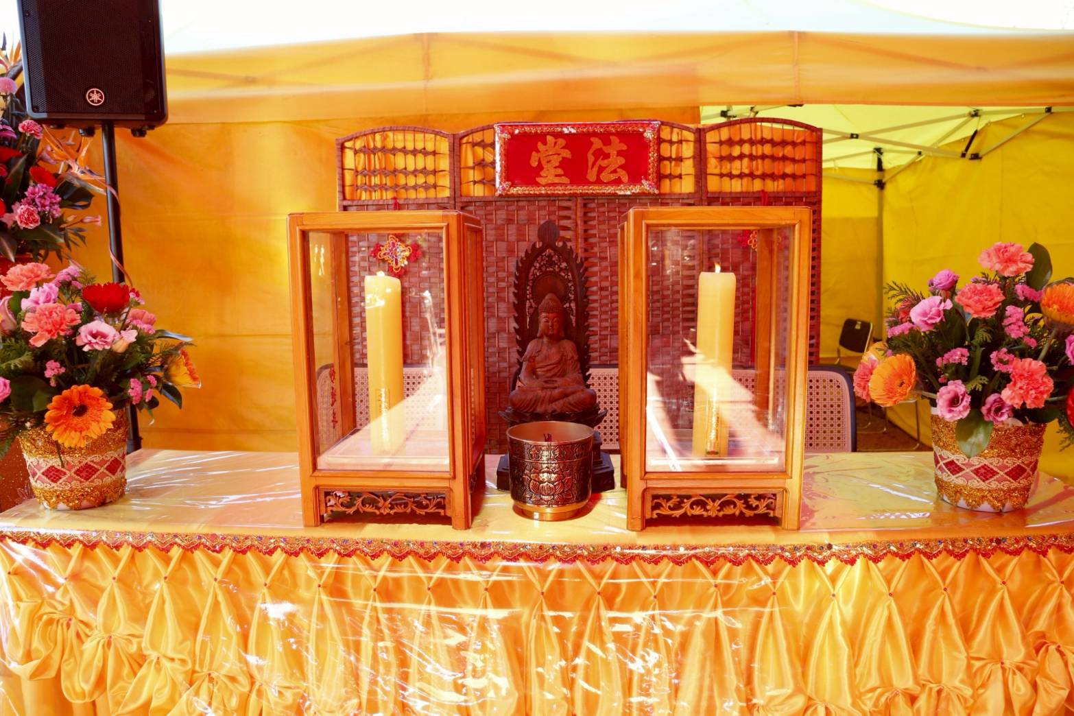 另一長桌準備:黃燭一對、防風玻璃罩一對、鮮花一對、插香爐一個。