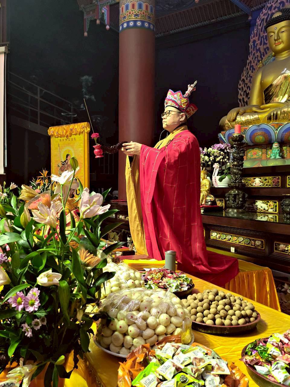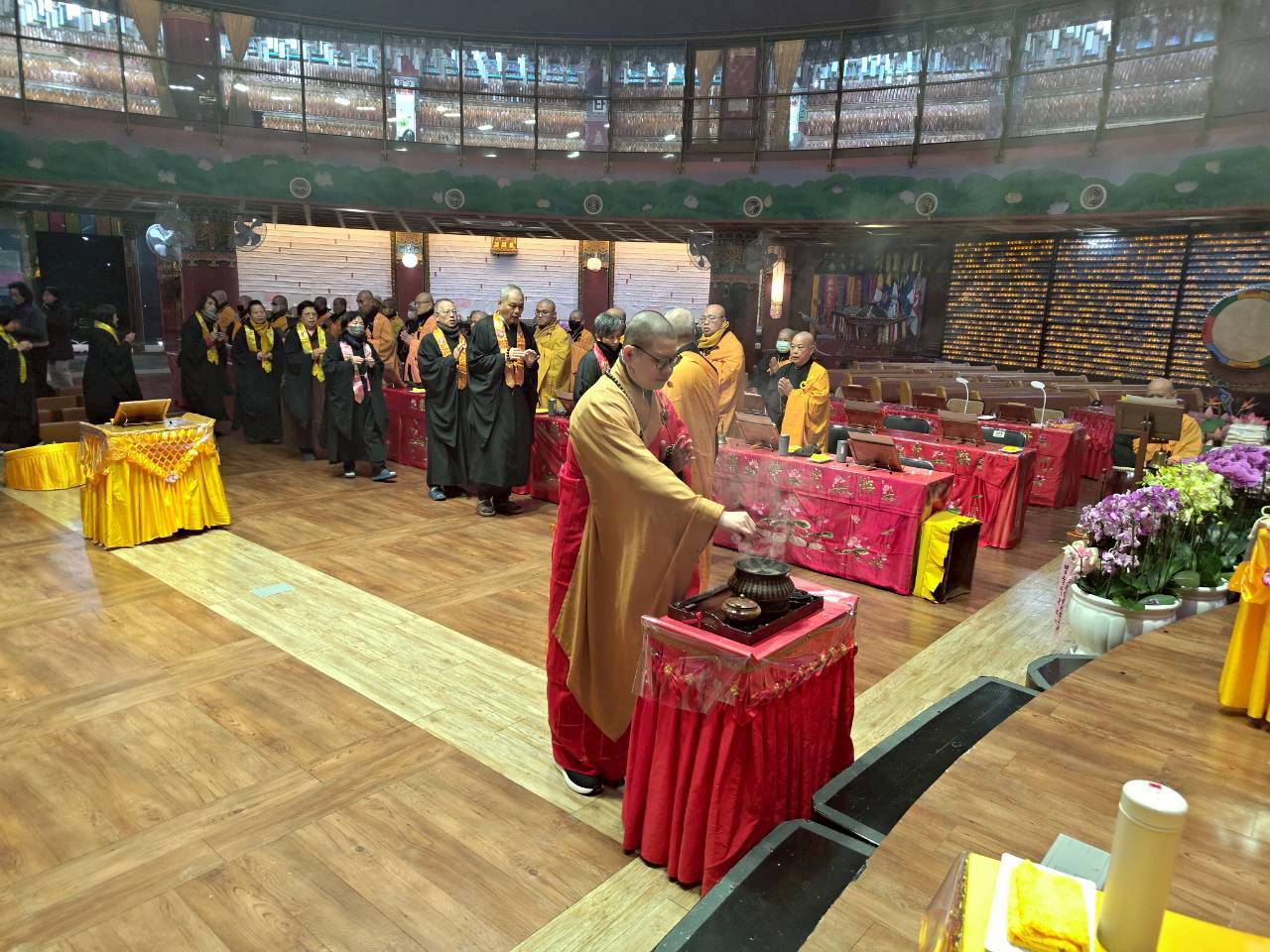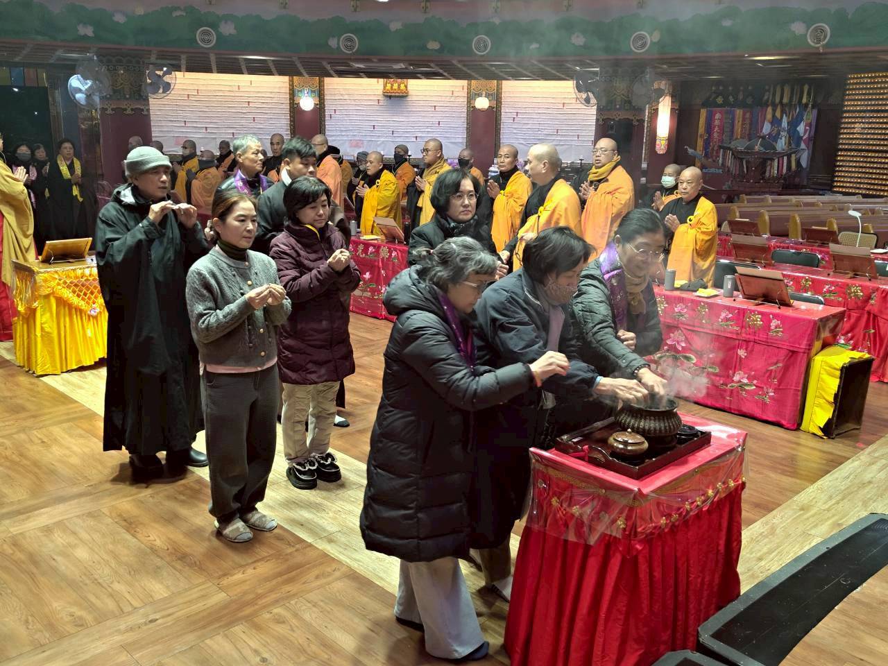 入壇已,三位主法和尚依序禮佛、拈香。上傳下敦師父和齋主依序拈香。