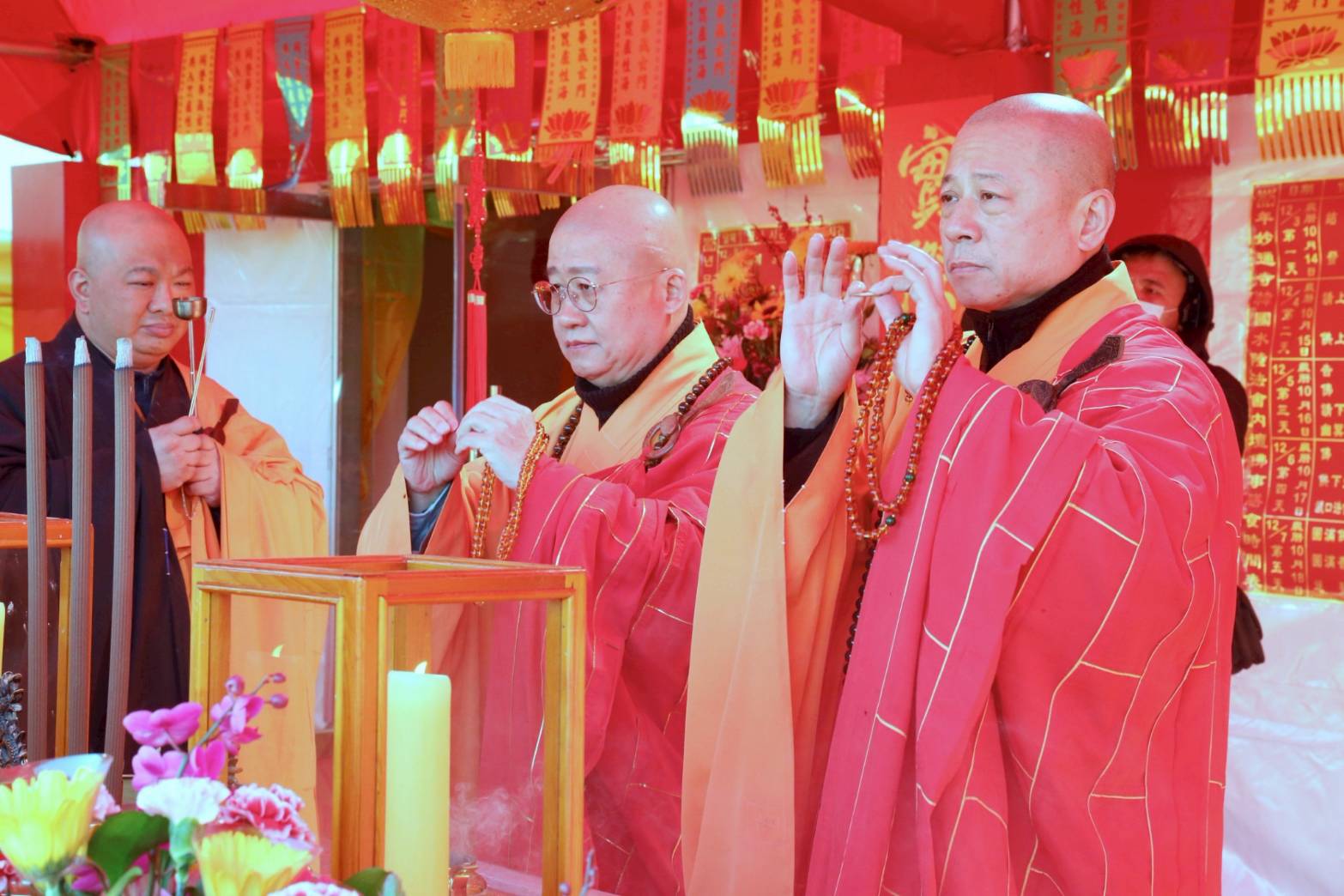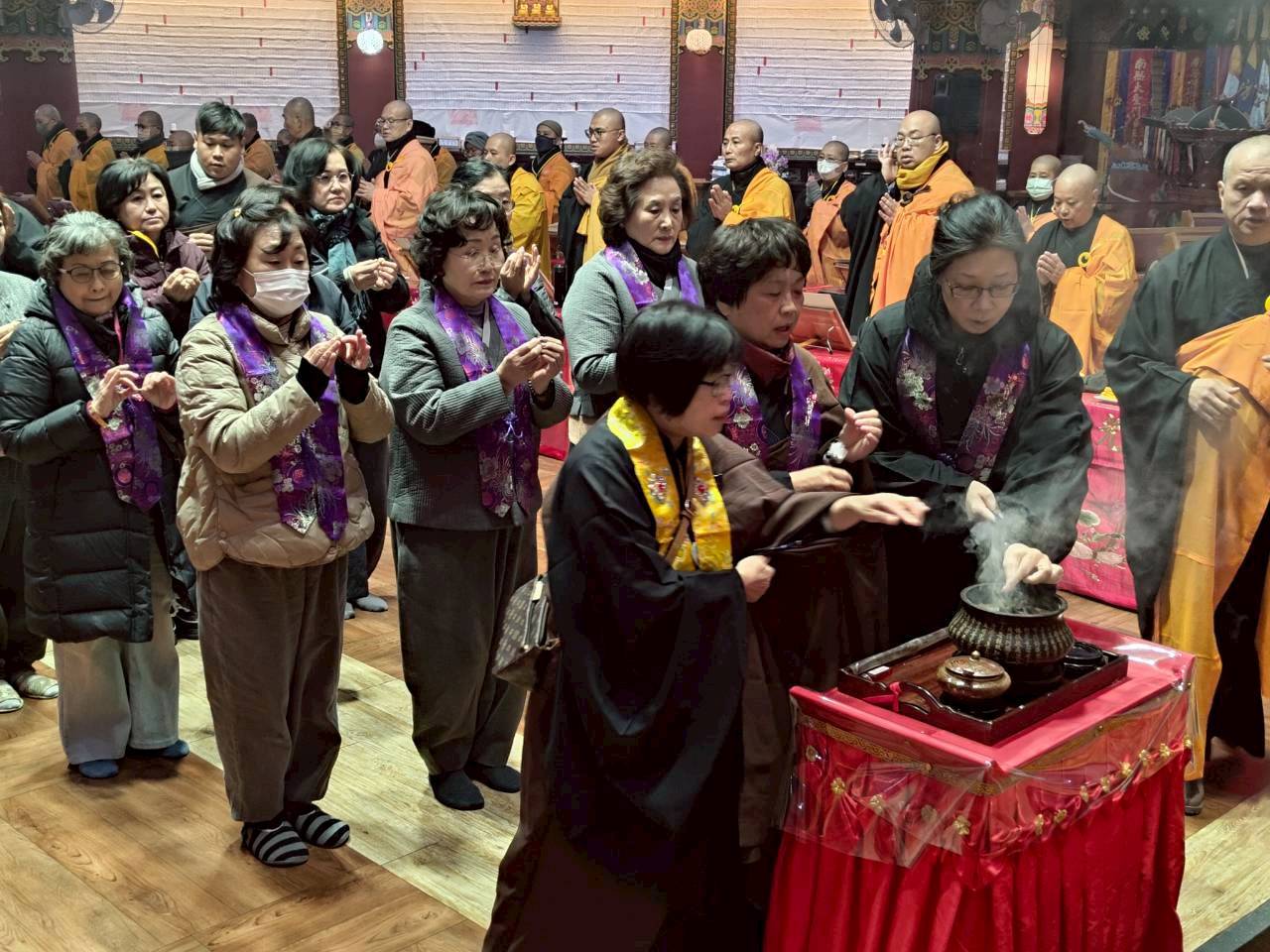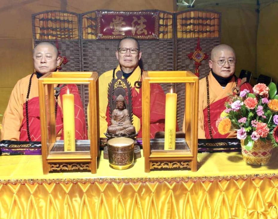 入壇已,三位主法和尚依序禮佛、拈香。上傳下敦師父和齋主依序拈香。