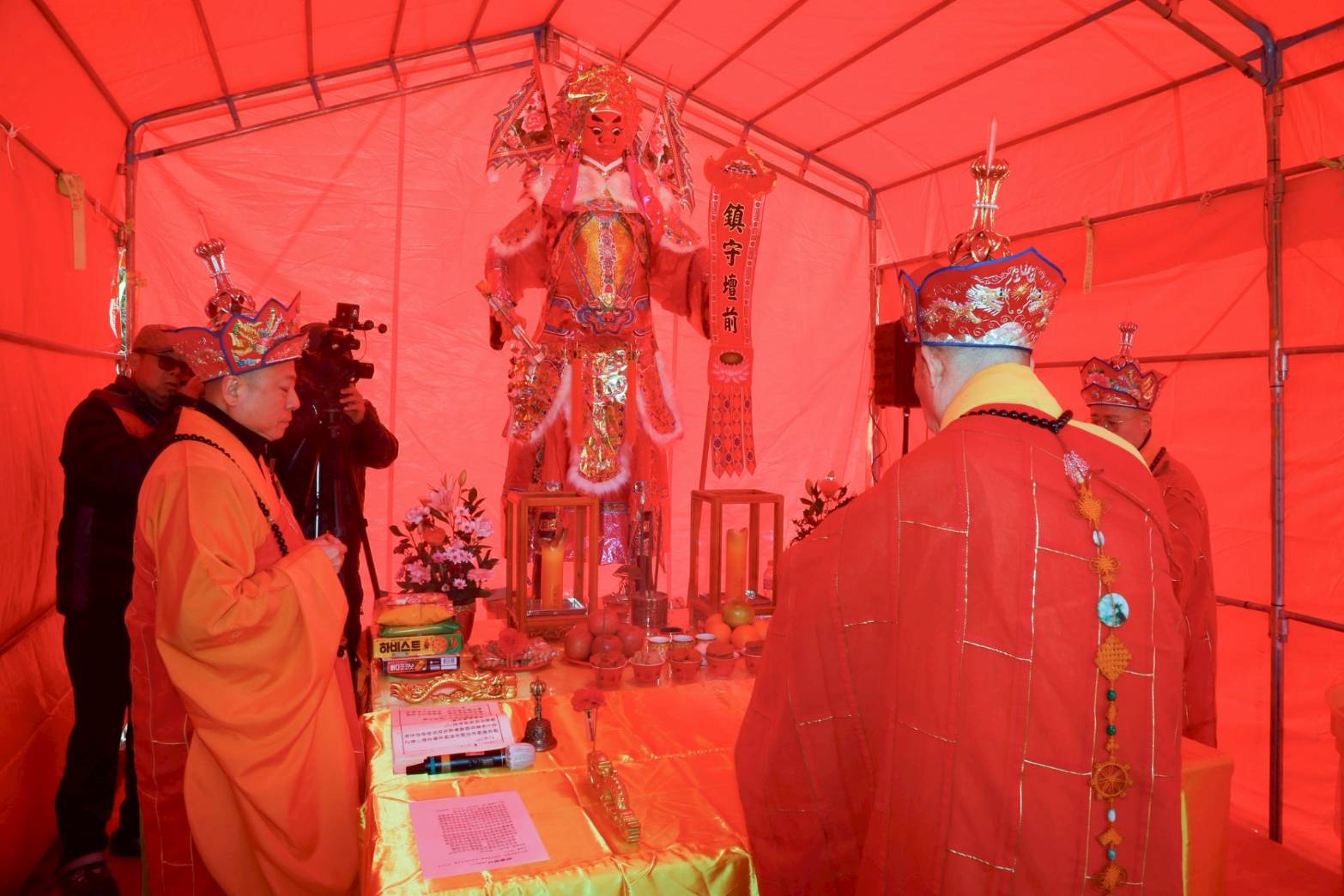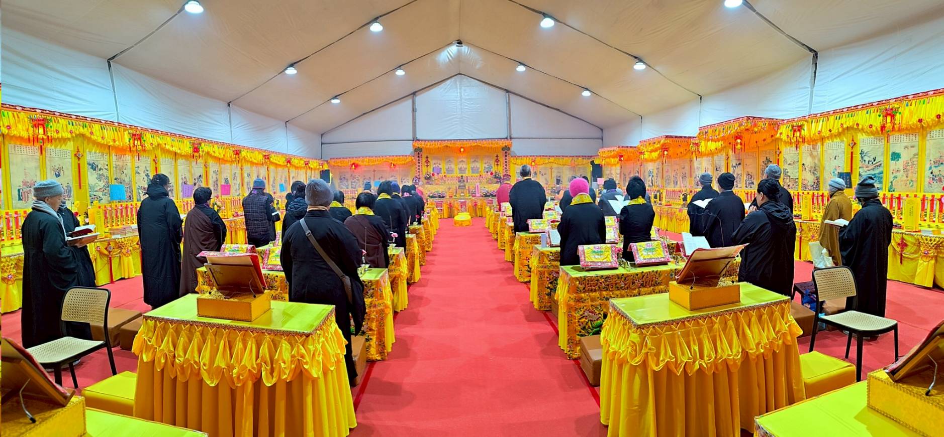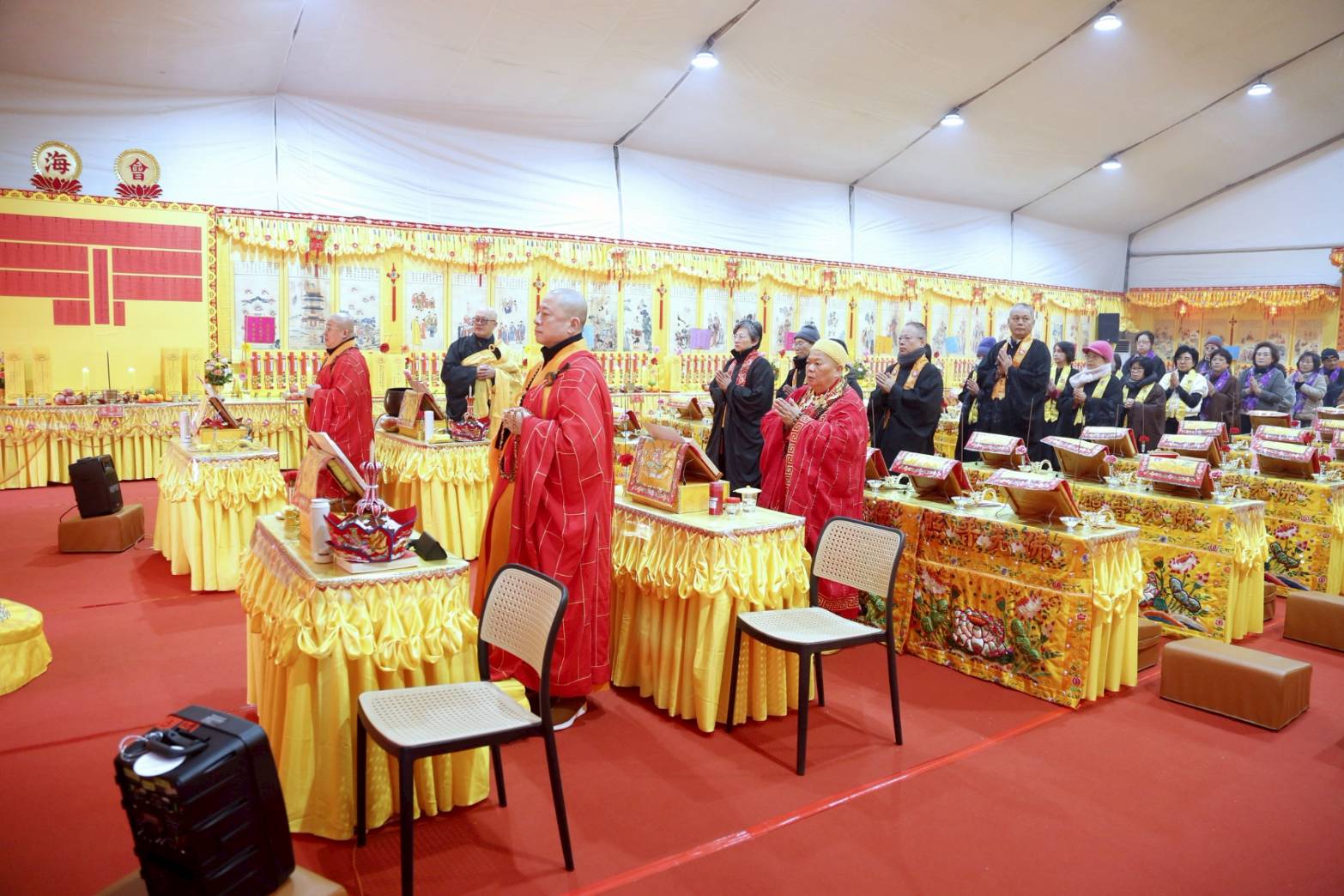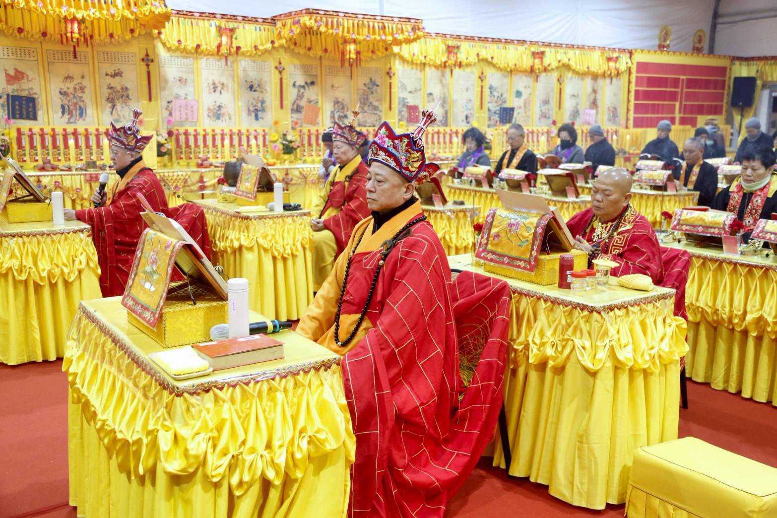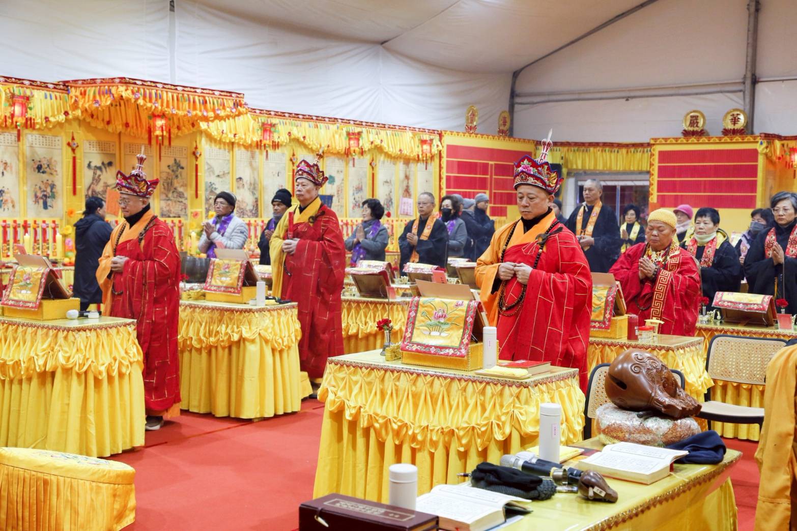 壇內香燈將法師桌椅、科儀、法器及齋主的科儀和拜墊,均向內安置。
