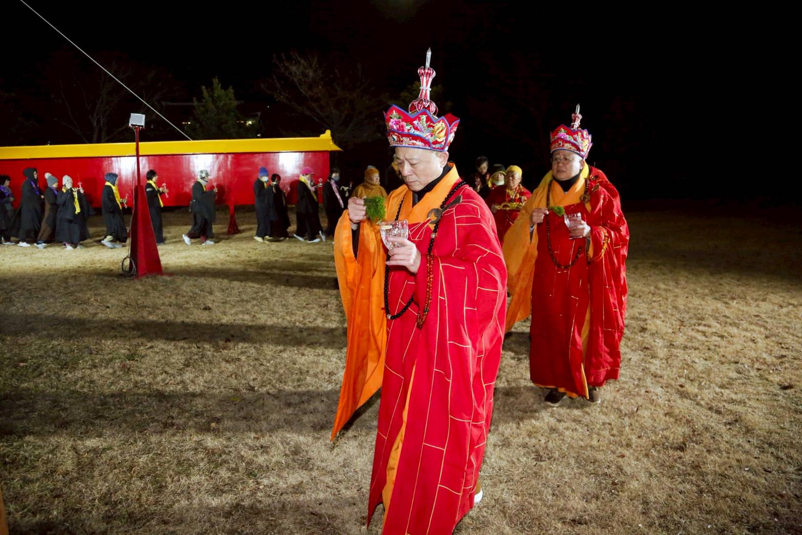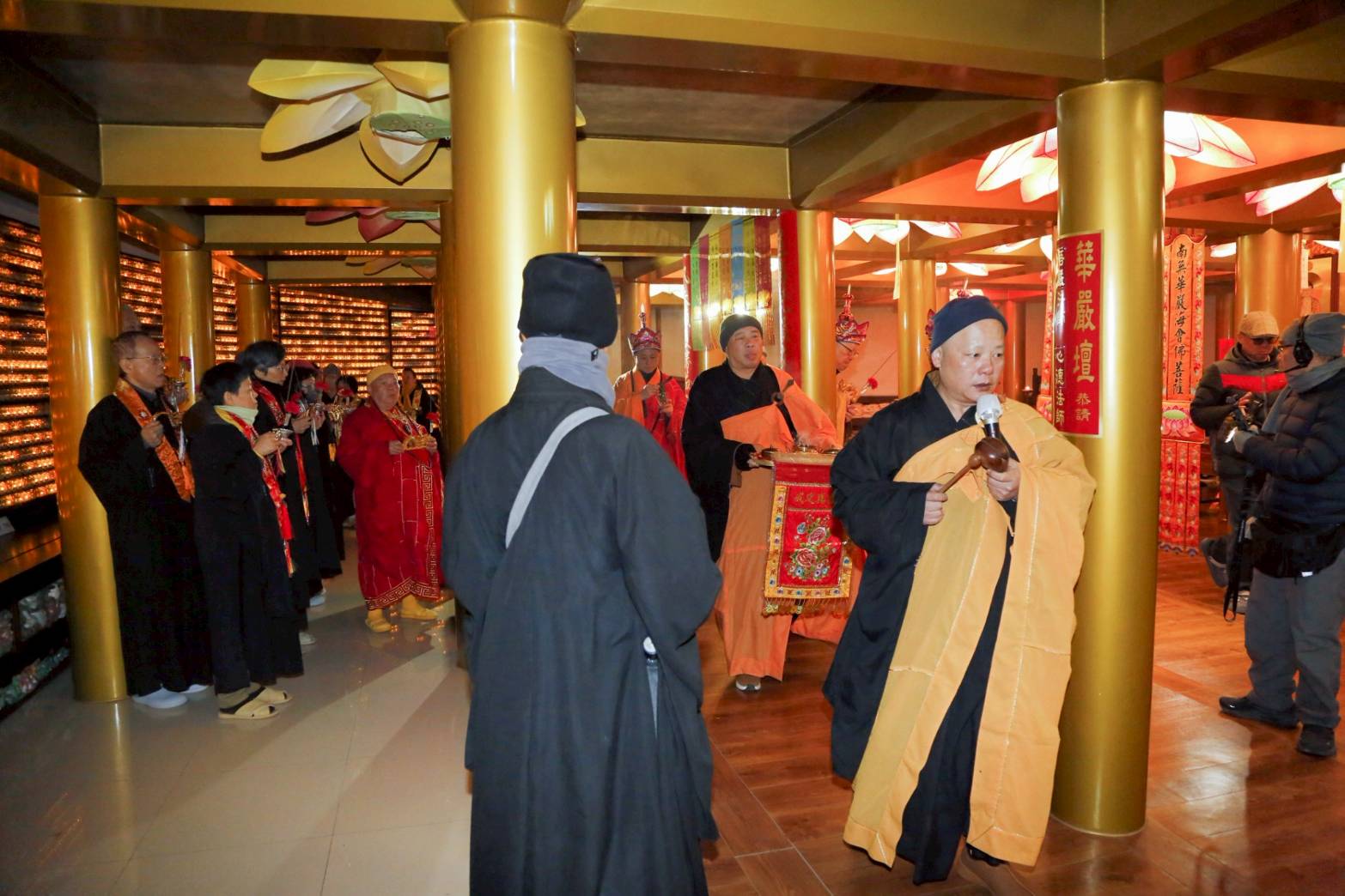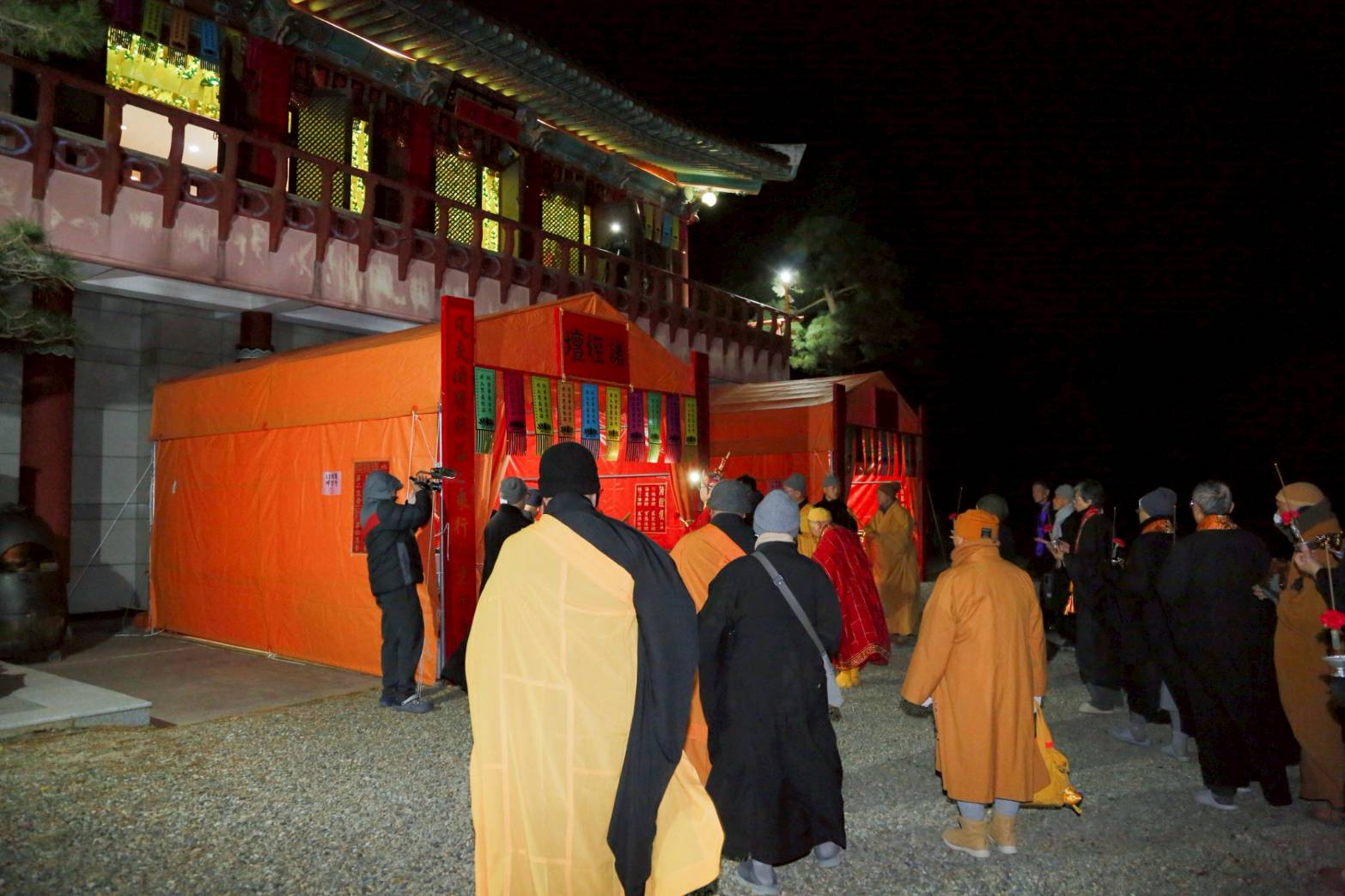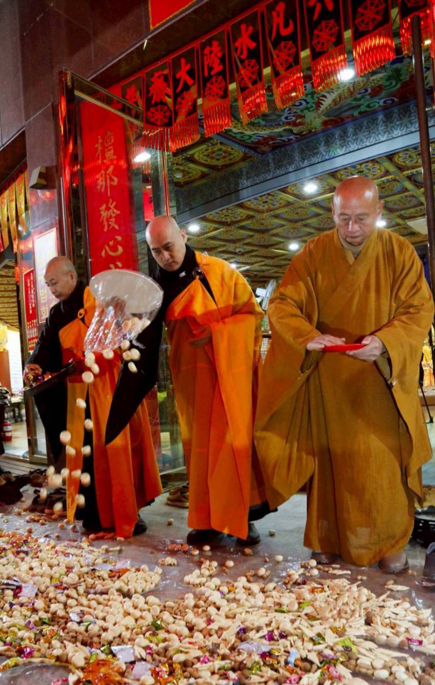 清晨3點,香燈引領上傳下敦師父與齋主前往法堂恭請三位和尚。