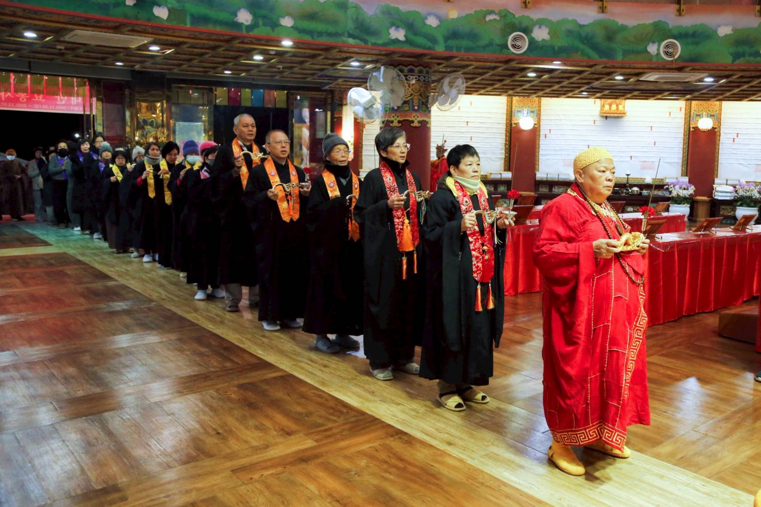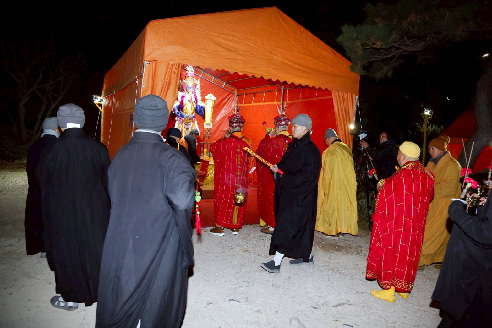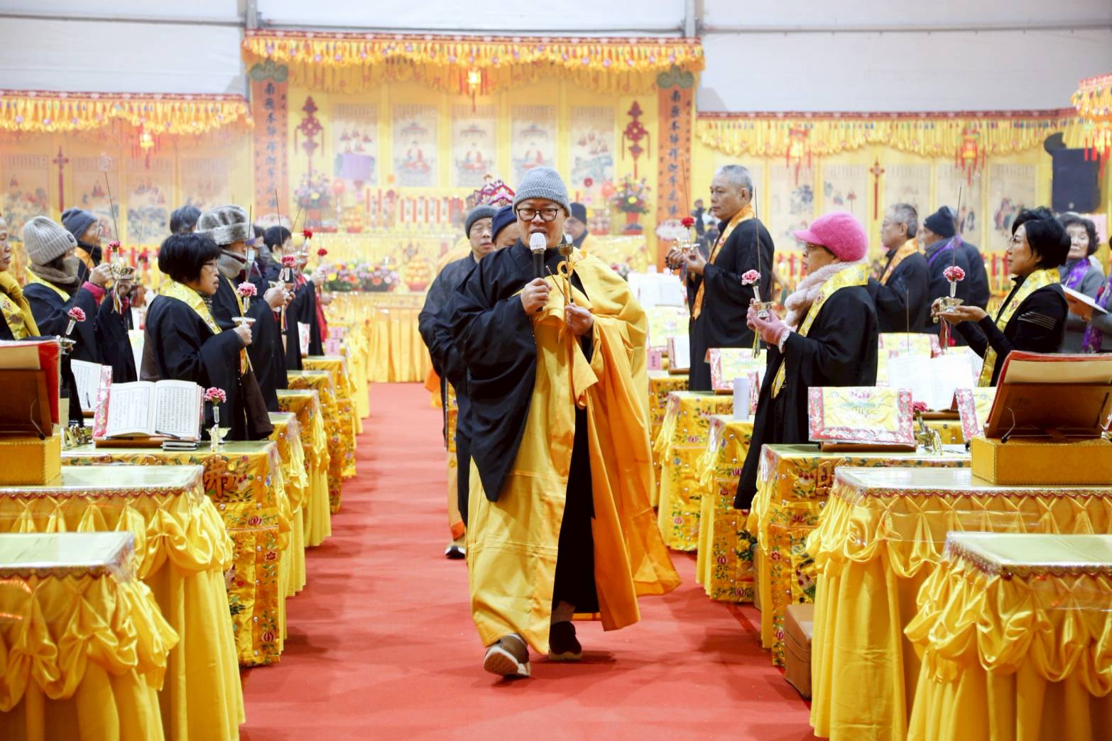 清晨3點,香燈引領上傳下敦師父與齋主前往法堂恭請三位和尚。