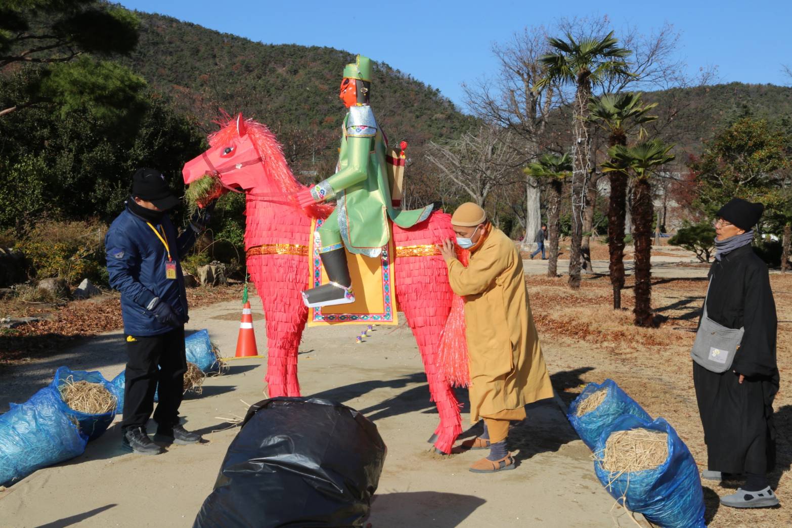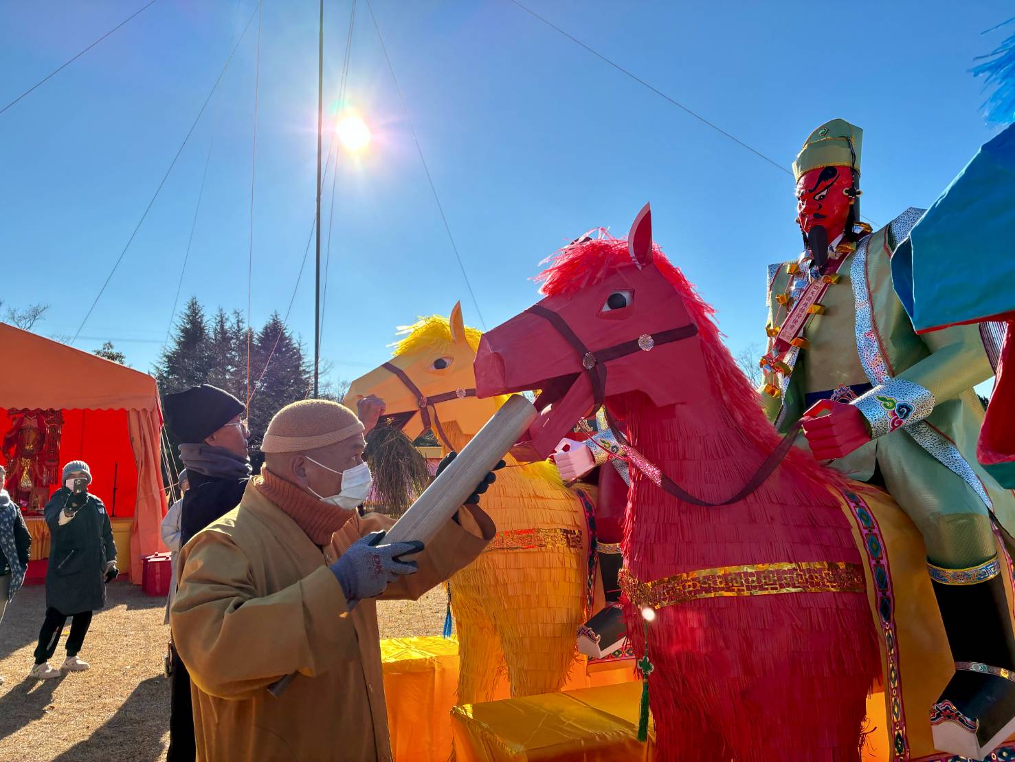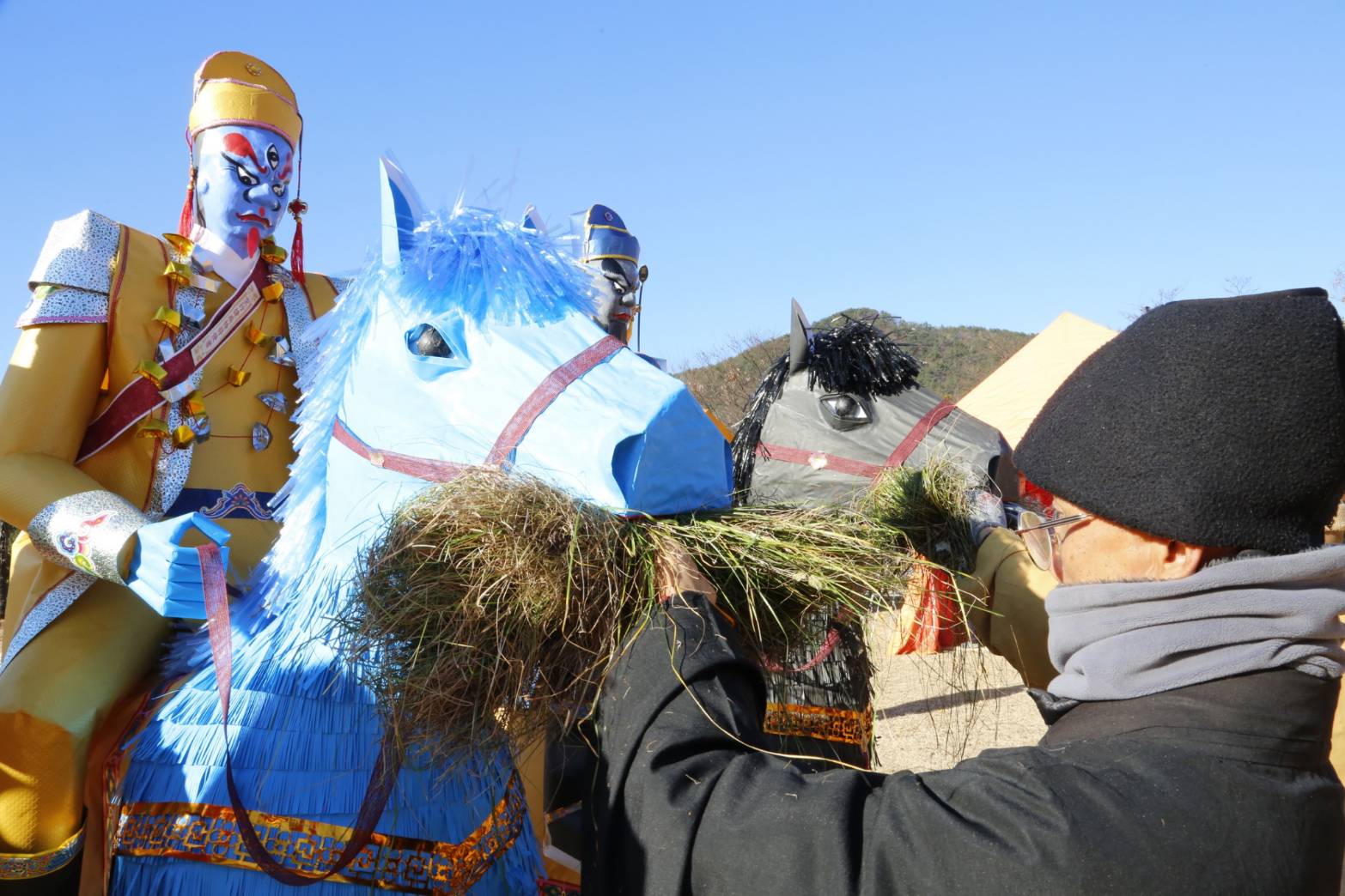 灑淨畢,工作人員餵馬吃黃豆之後口含一把牧草。