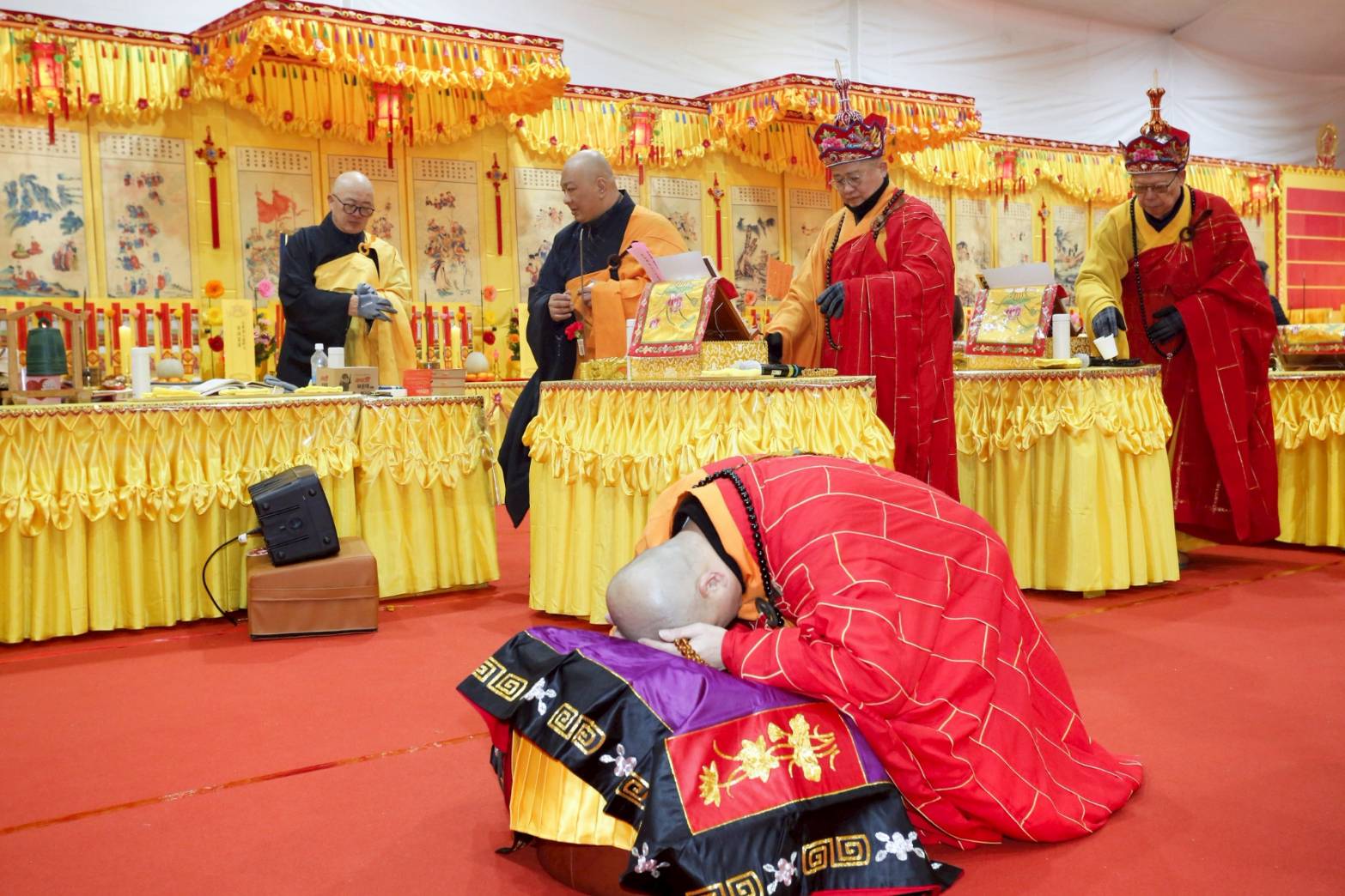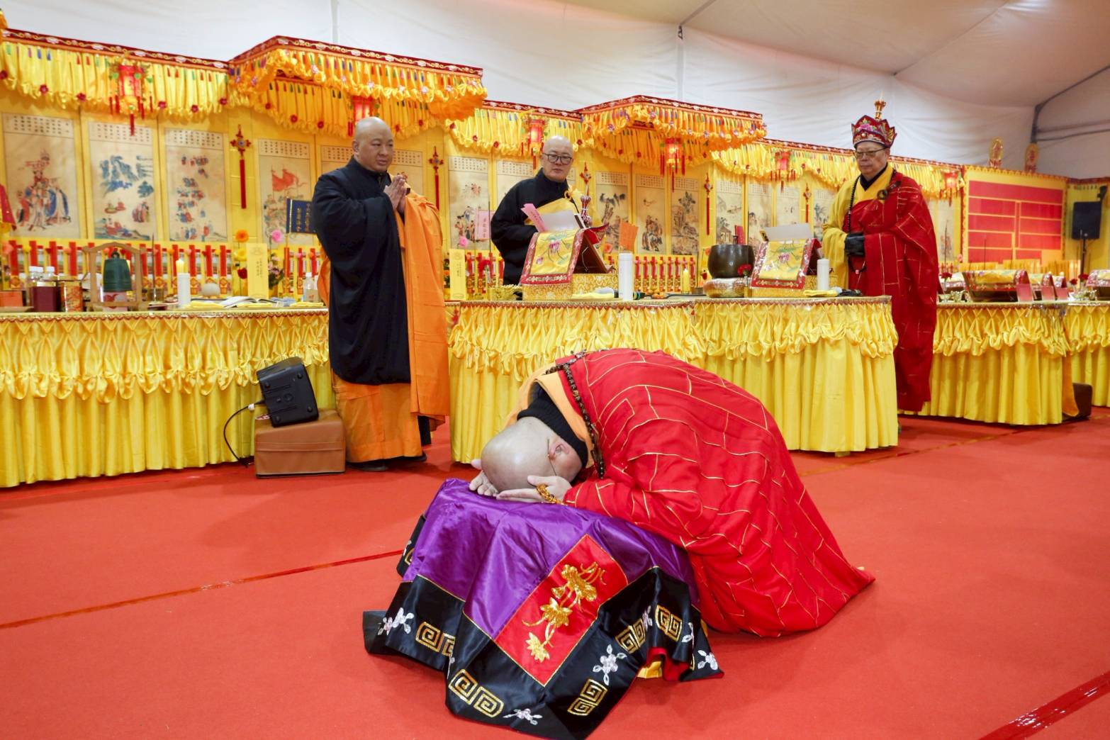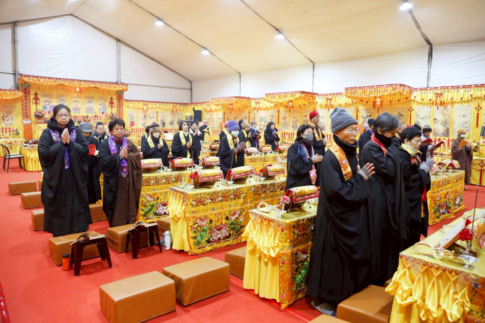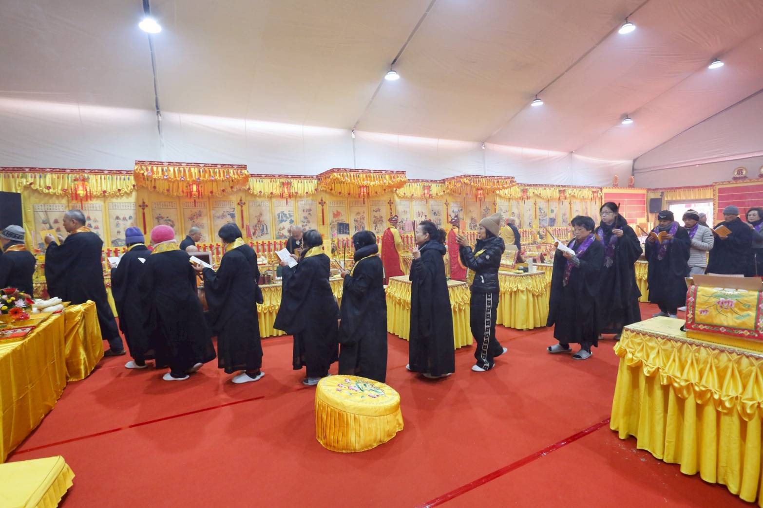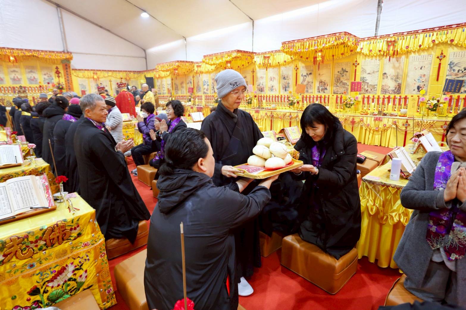 內檀香燈與工作人員調整拜墊方向,中央排兩行齋主拜墊,東西單面對面,留出一人可走的寬度,獻寶時讓捧寶物的出家眾穿越。