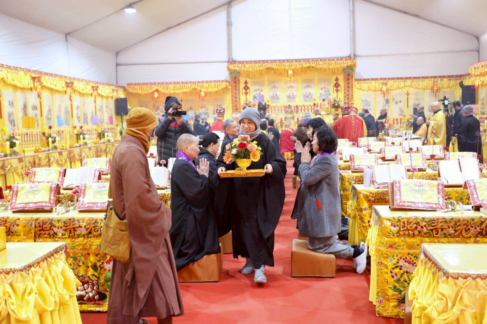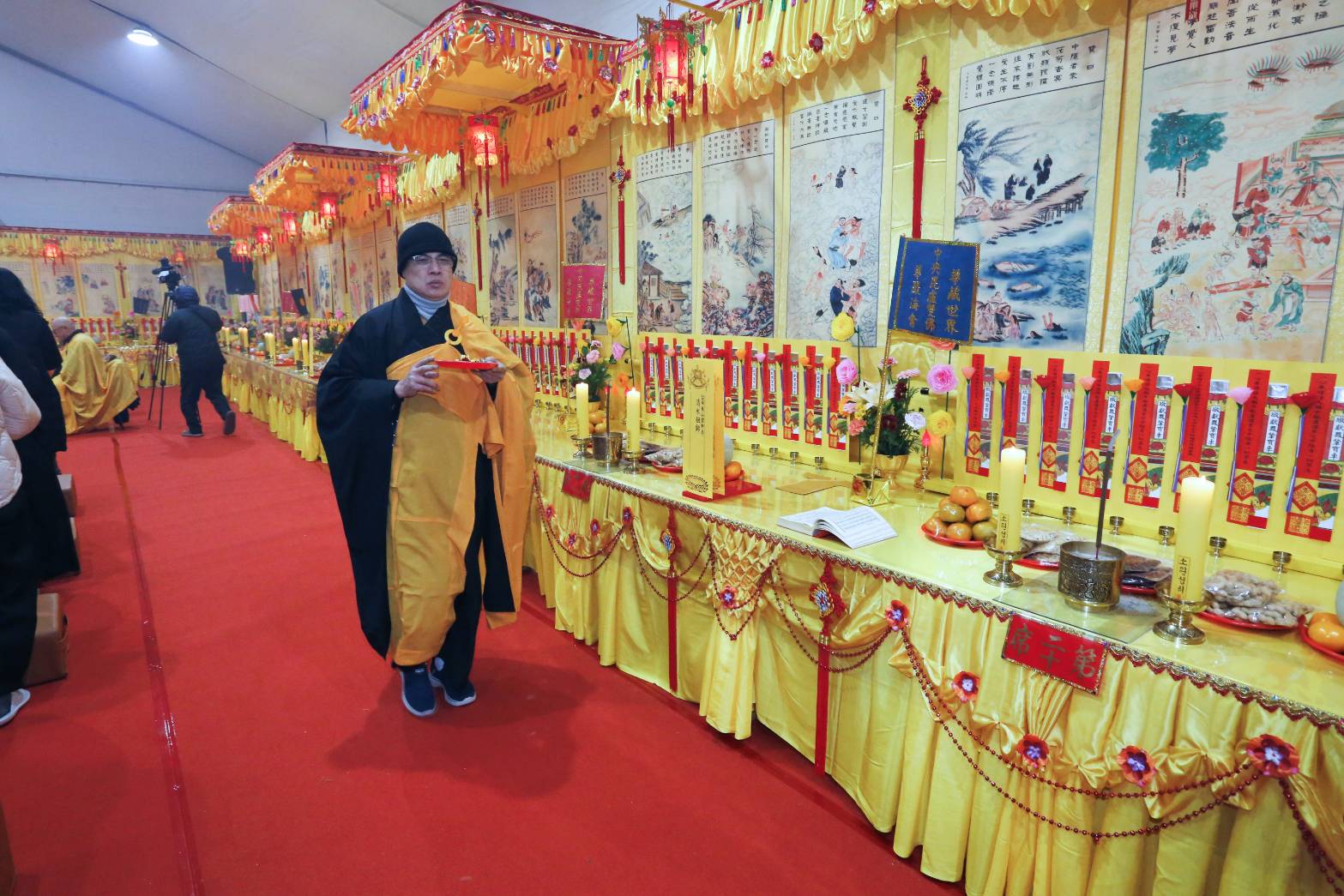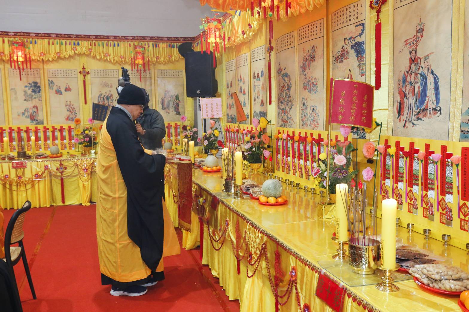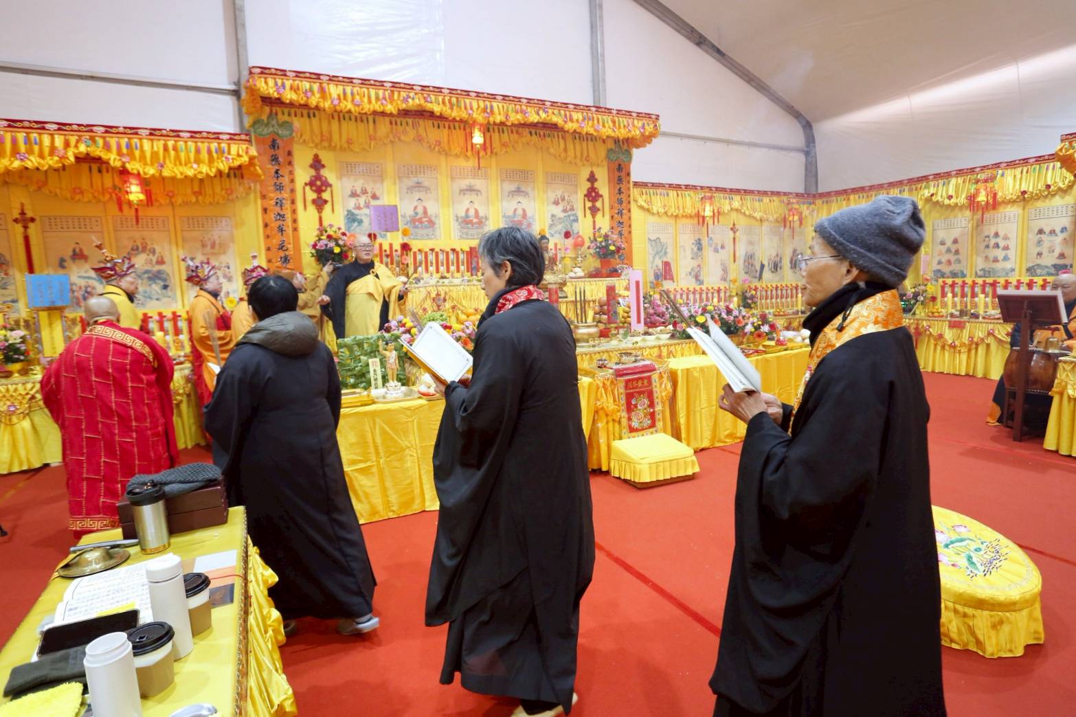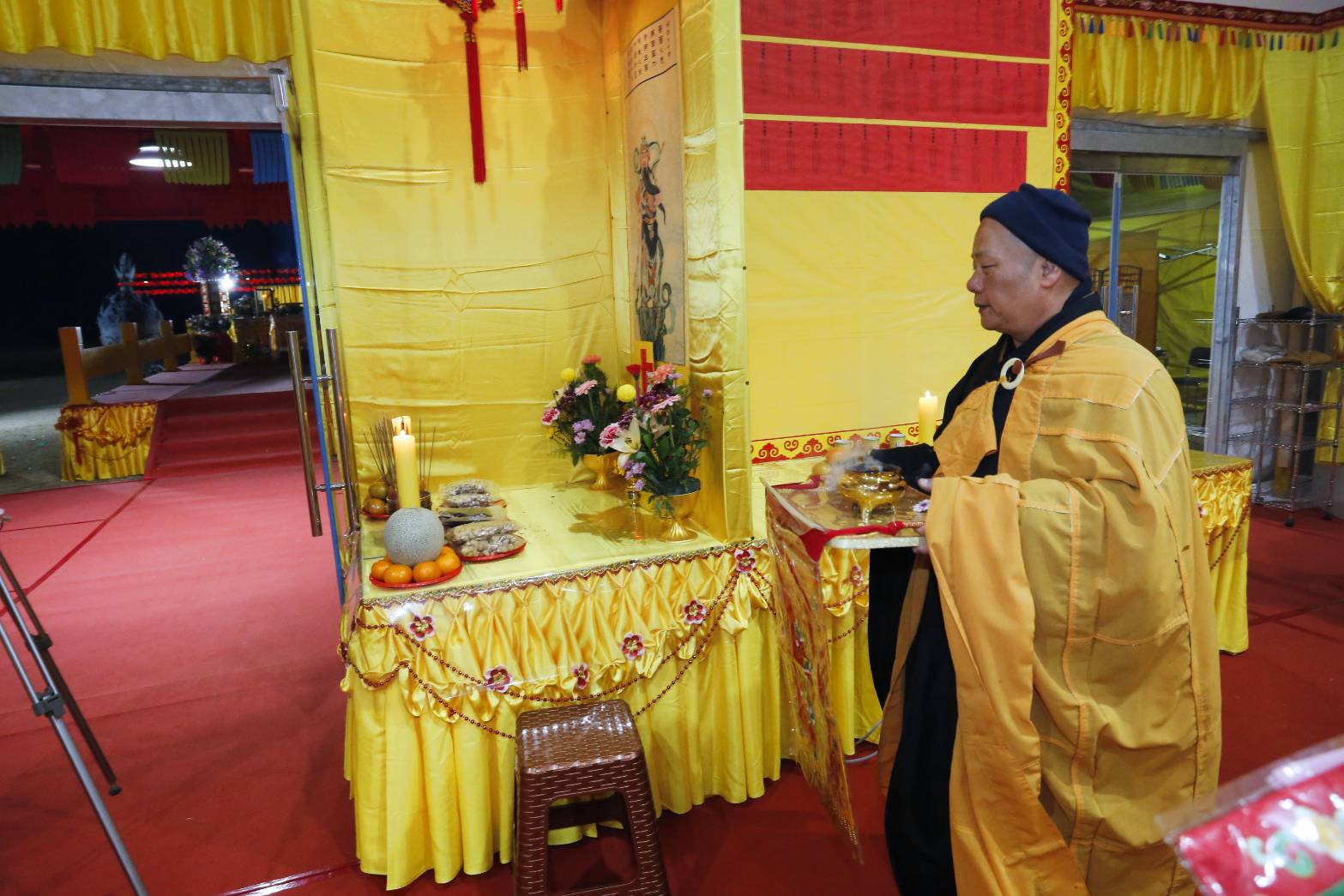 內檀香燈與工作人員調整拜墊方向,中央排兩行齋主拜墊,東西單面對面,留出一人可走的寬度,獻寶時讓捧寶物的出家眾穿越。