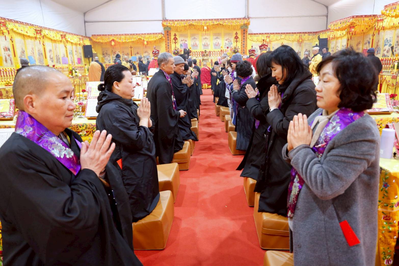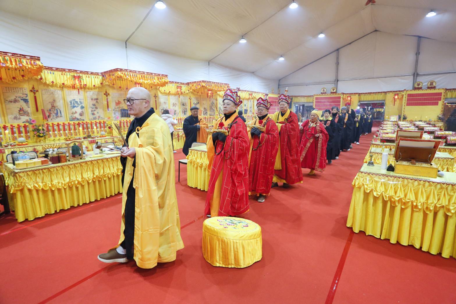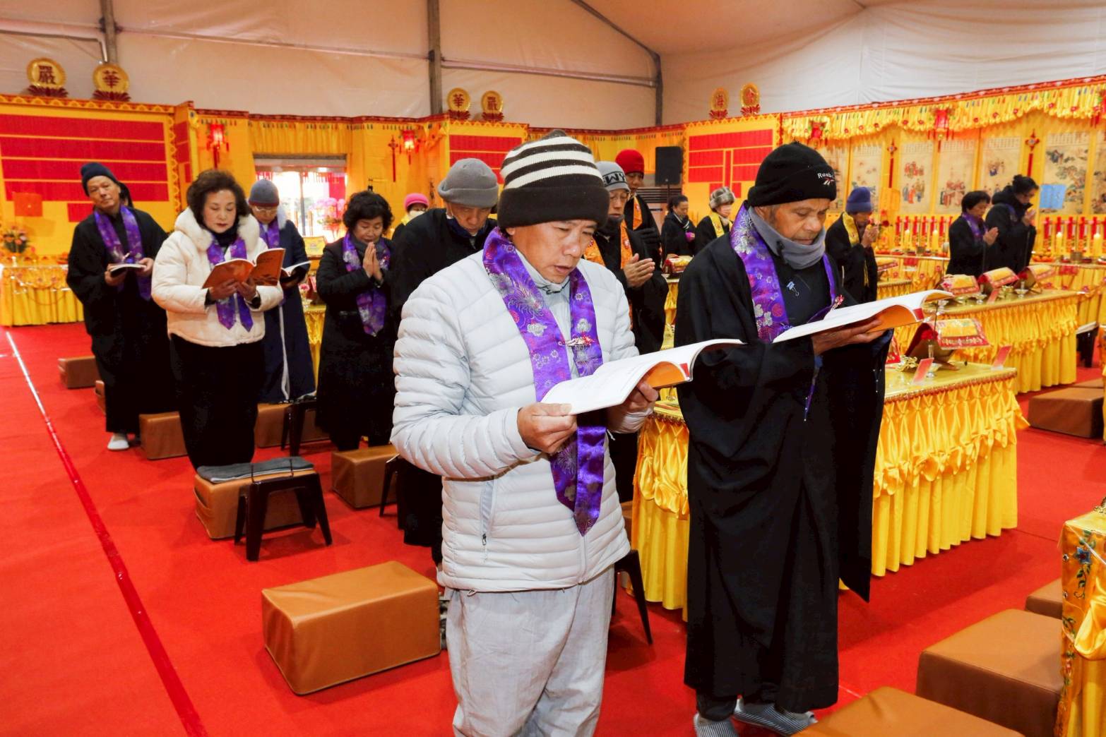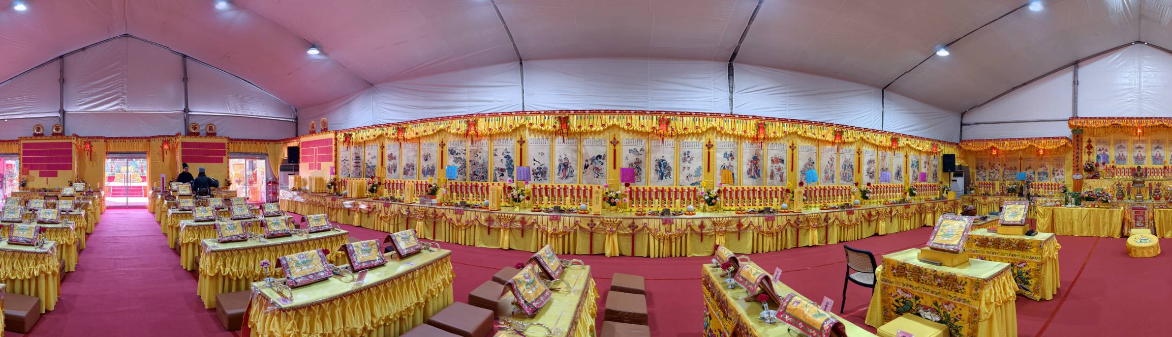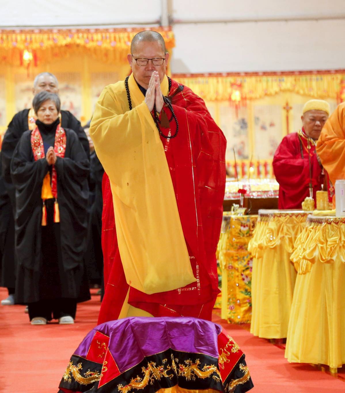 內檀香燈與工作人員調整拜墊方向,中央排兩行齋主拜墊,東西單面對面,留出一人可走的寬度,獻寶時讓捧寶物的出家眾穿越。