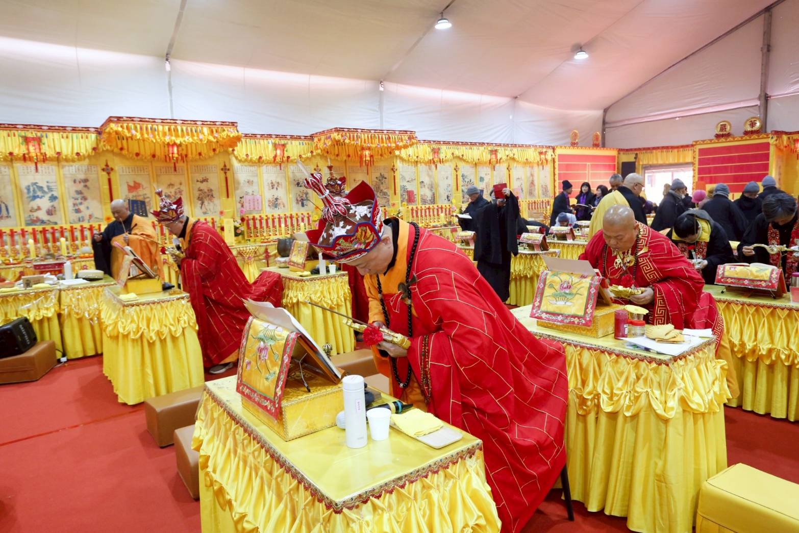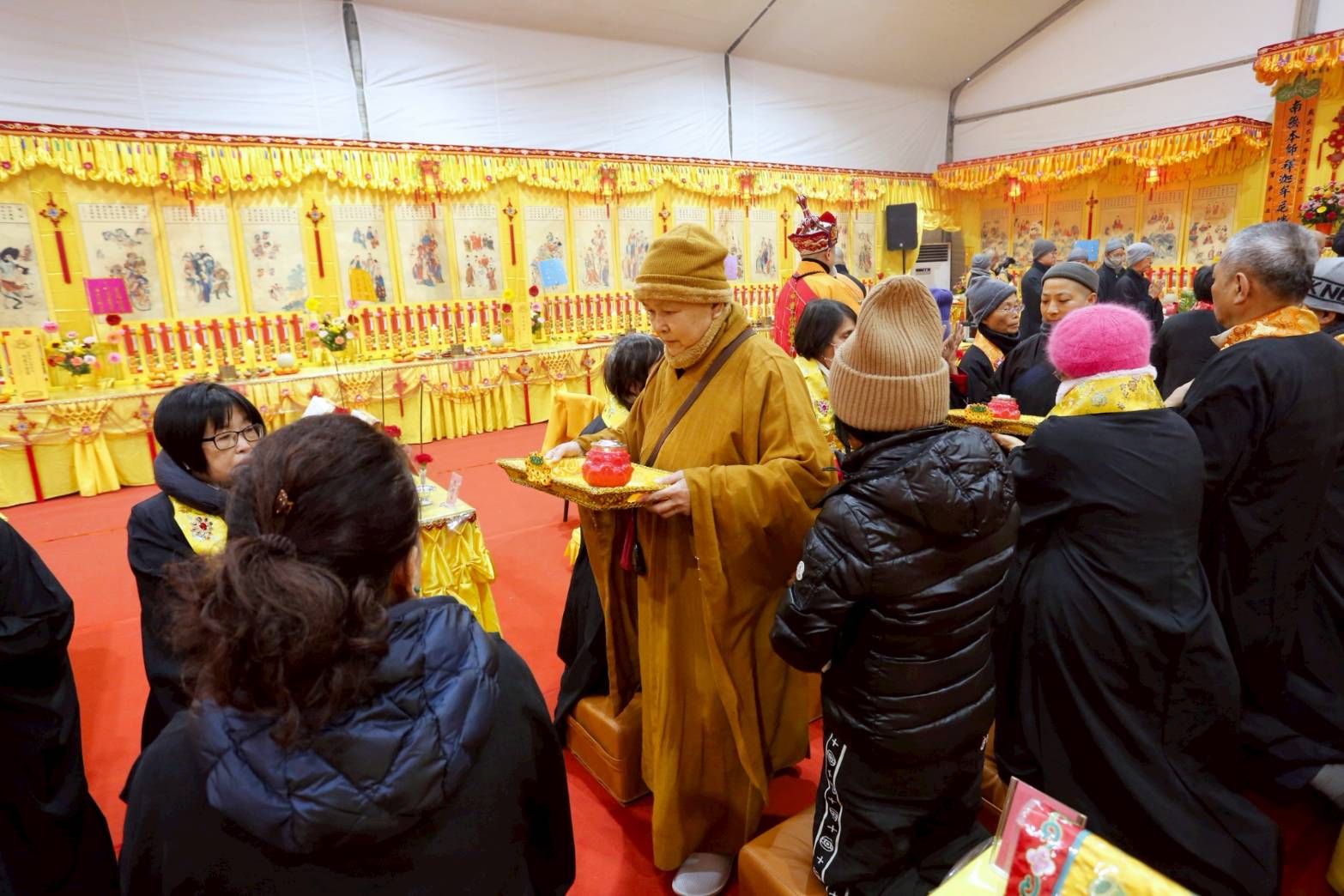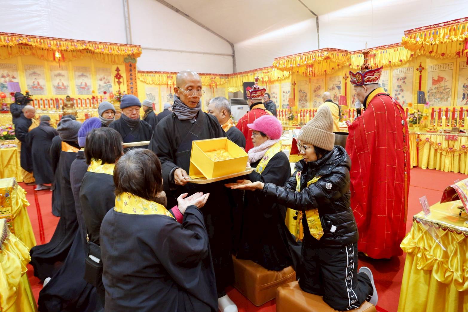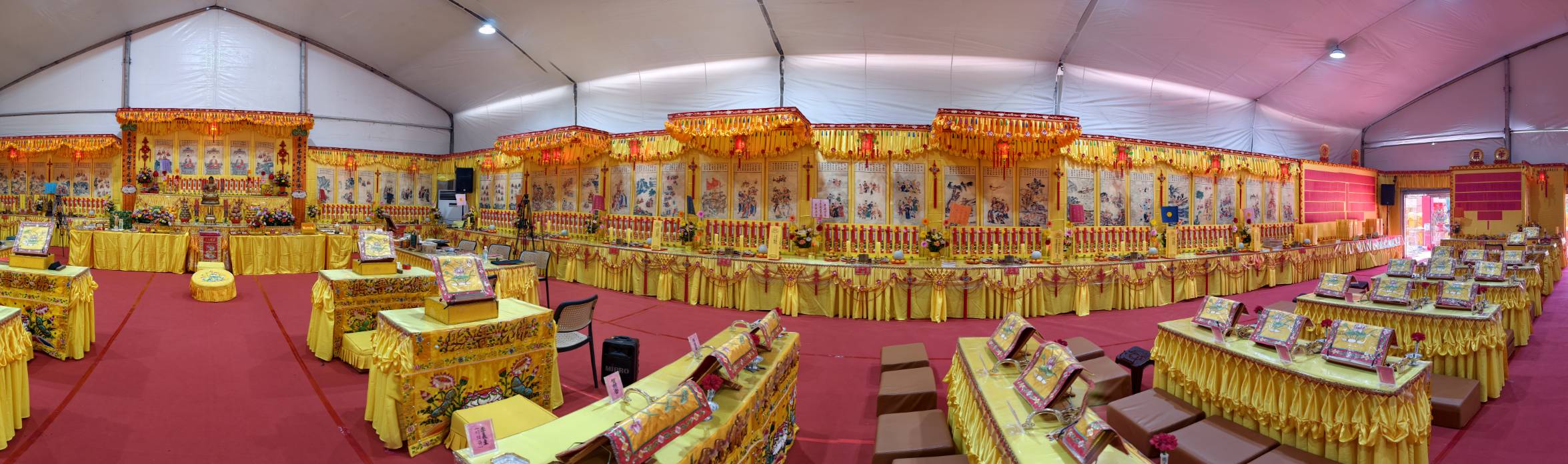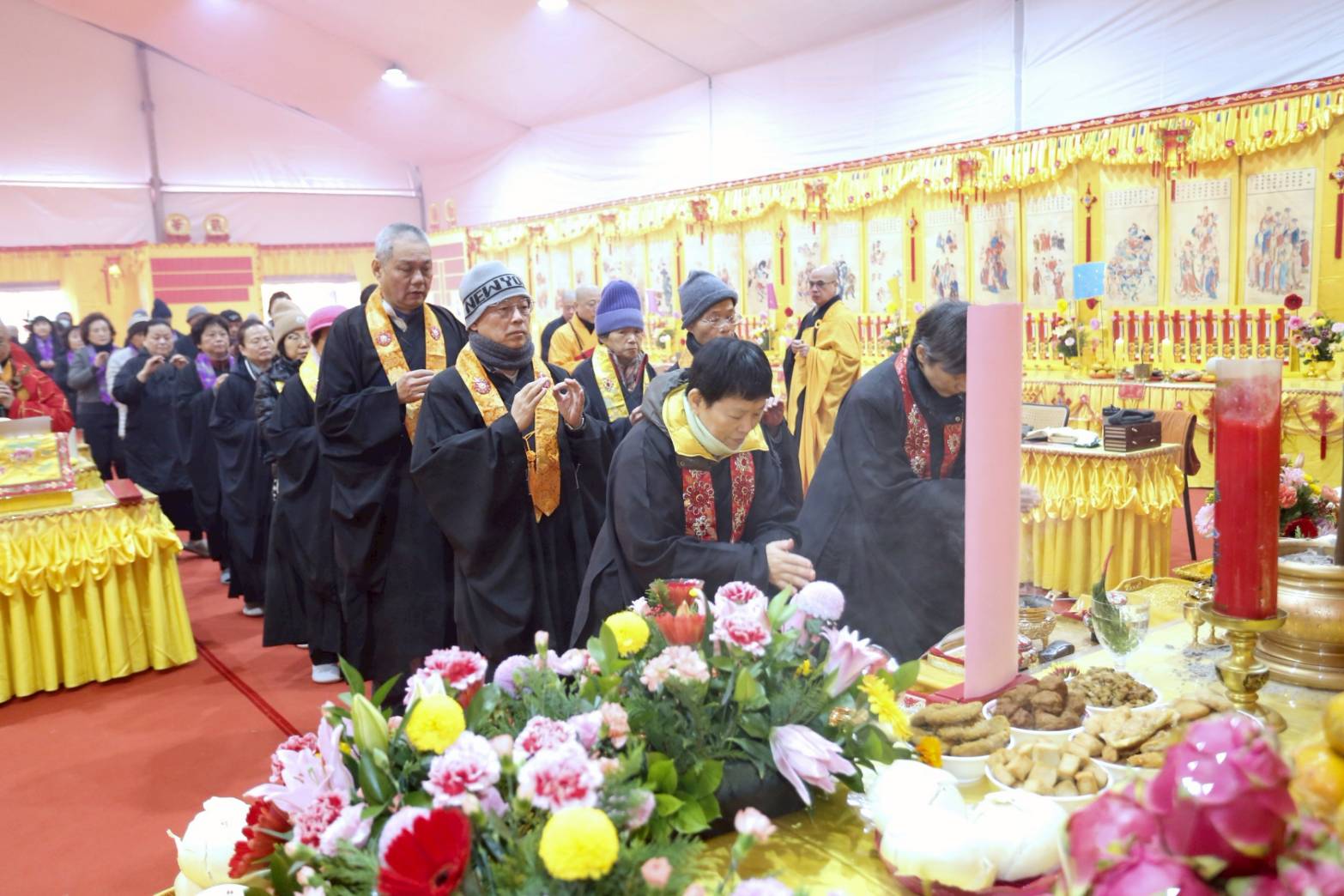 內檀香燈與工作人員調整拜墊方向,中央排兩行齋主拜墊,東西單面對面,留出一人可走的寬度,獻寶時讓捧寶物的出家眾穿越。