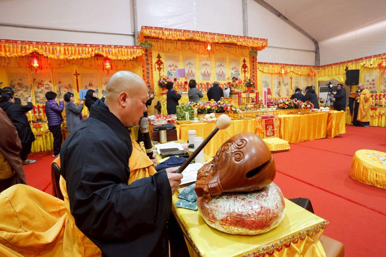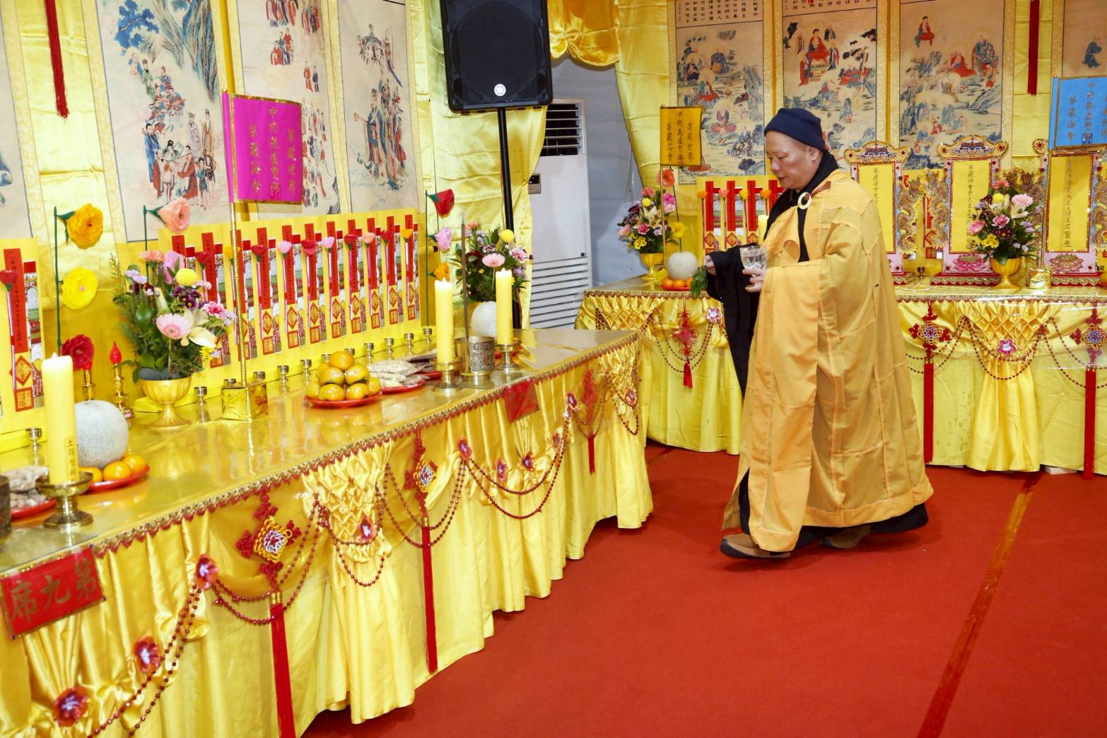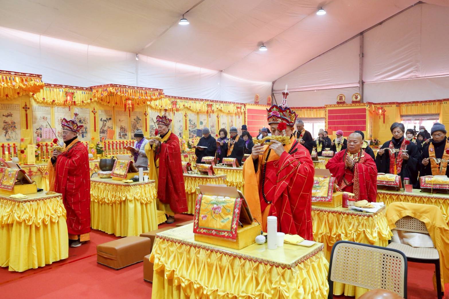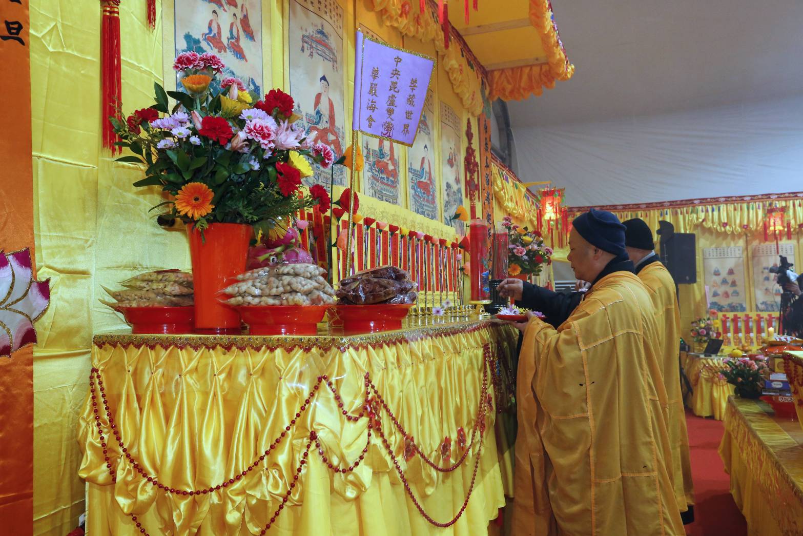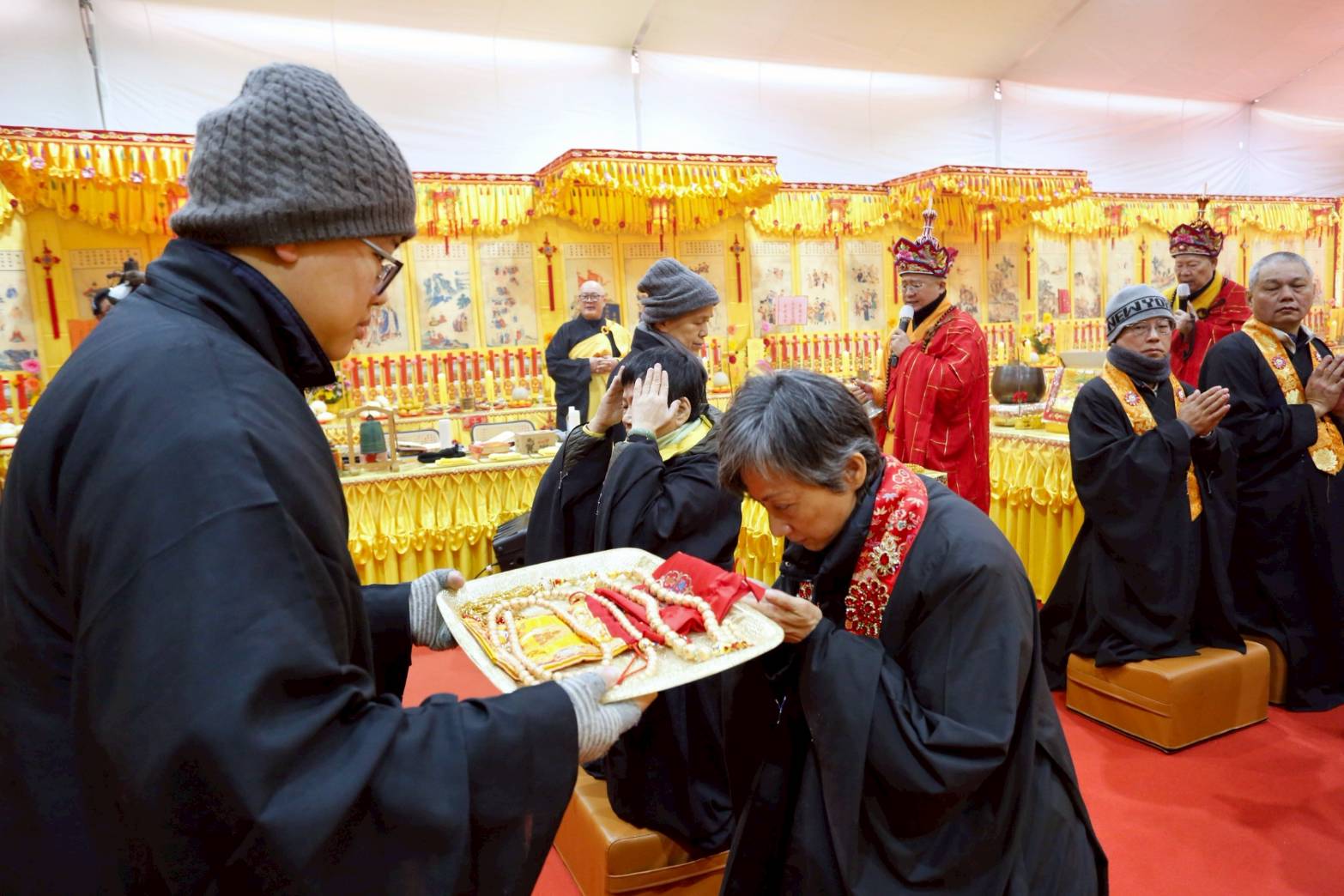 內檀香燈與工作人員調整拜墊方向,中央排兩行齋主拜墊,東西單面對面,留出一人可走的寬度,獻寶時讓捧寶物的出家眾穿越。