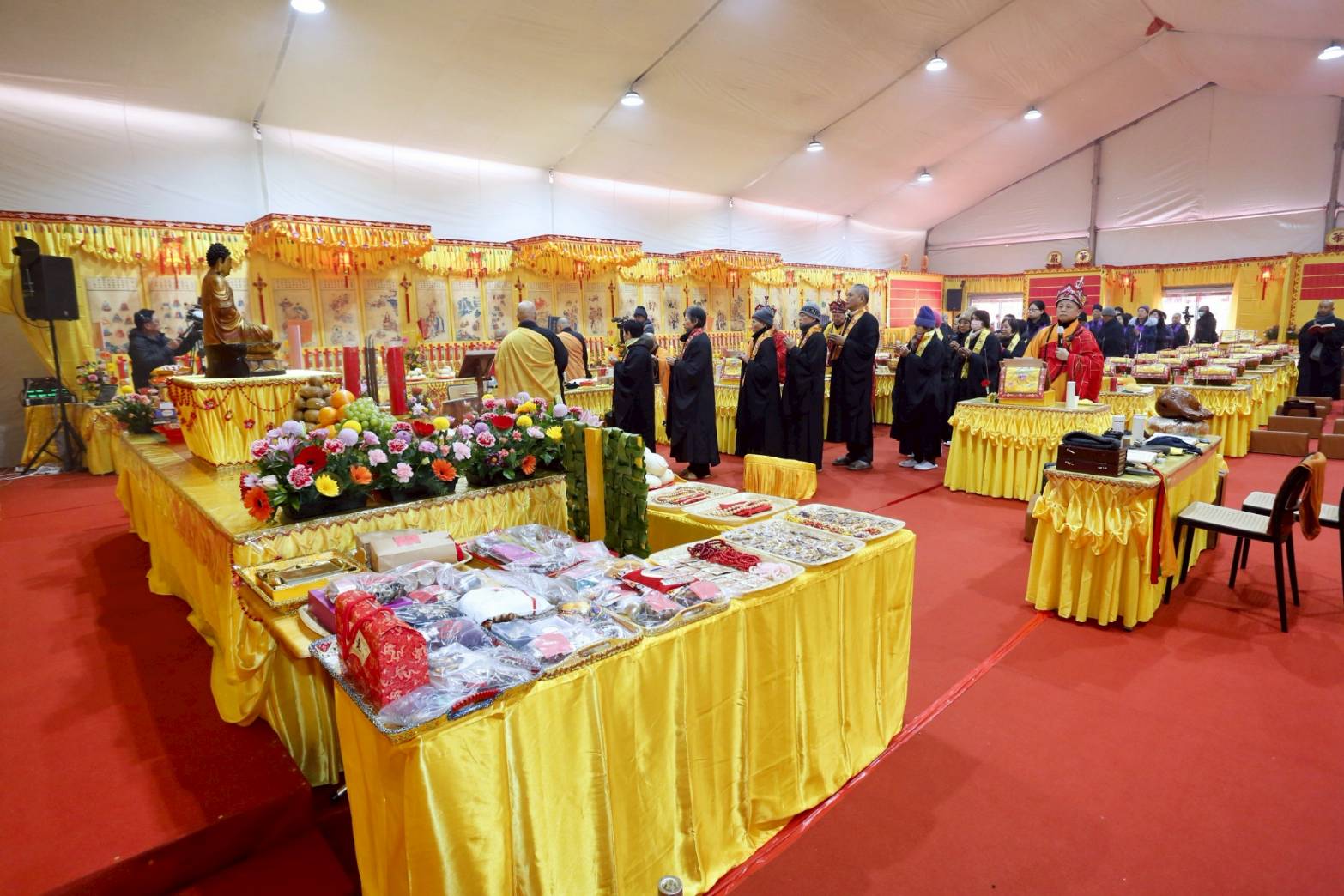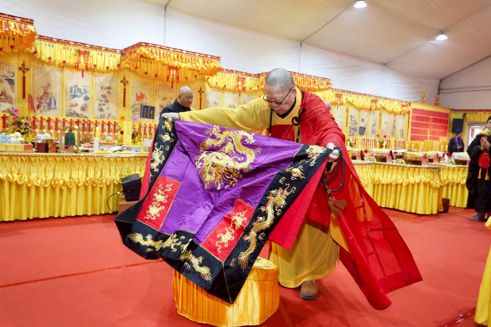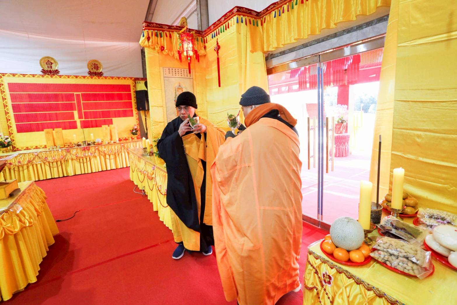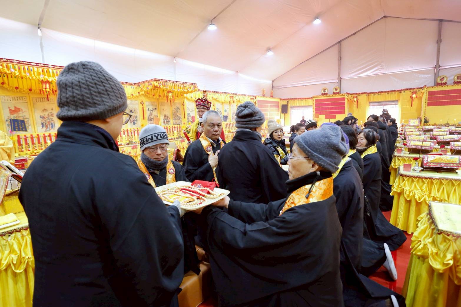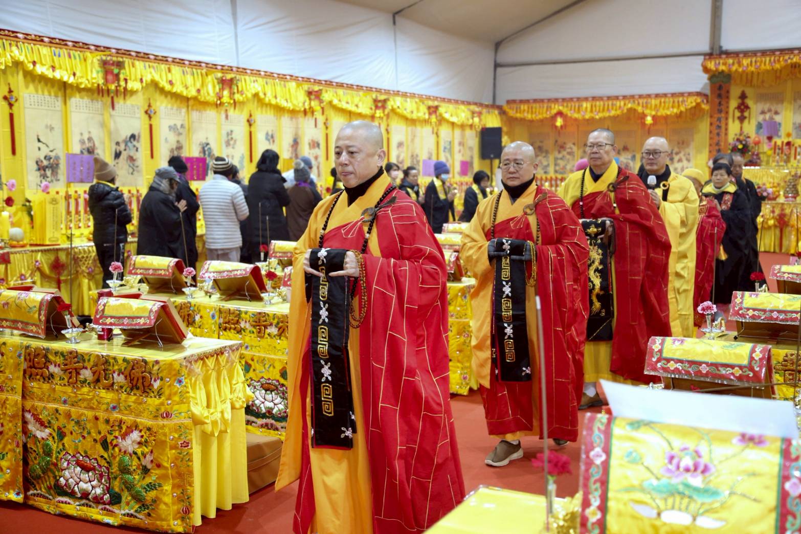 內檀香燈與工作人員調整拜墊方向,中央排兩行齋主拜墊,東西單面對面,留出一人可走的寬度,獻寶時讓捧寶物的出家眾穿越。