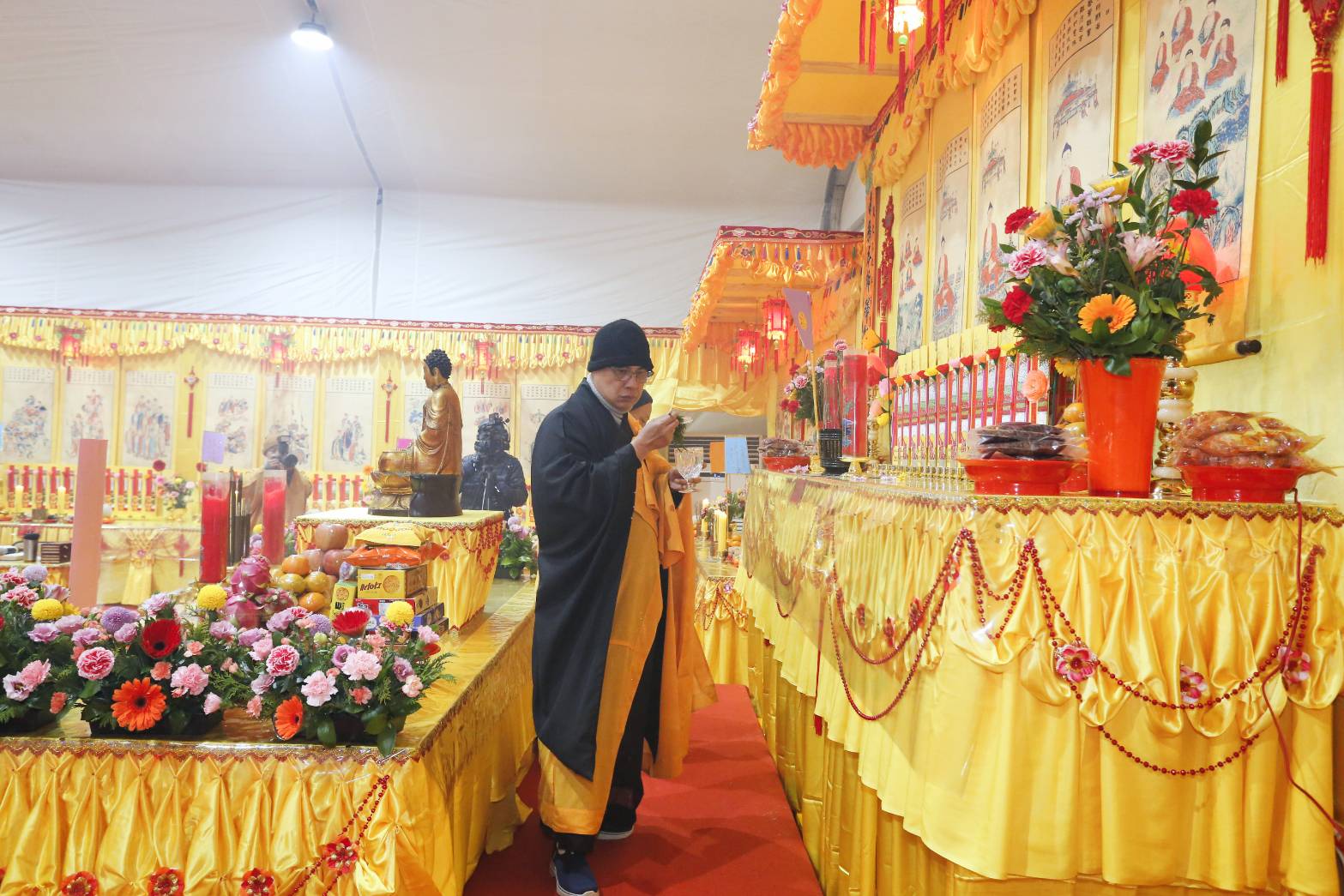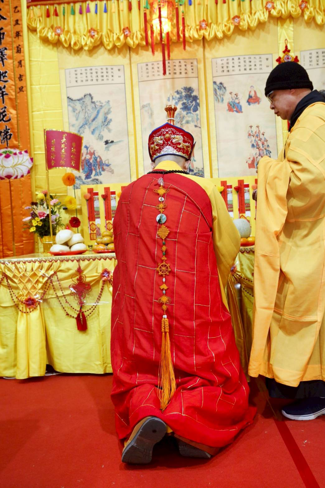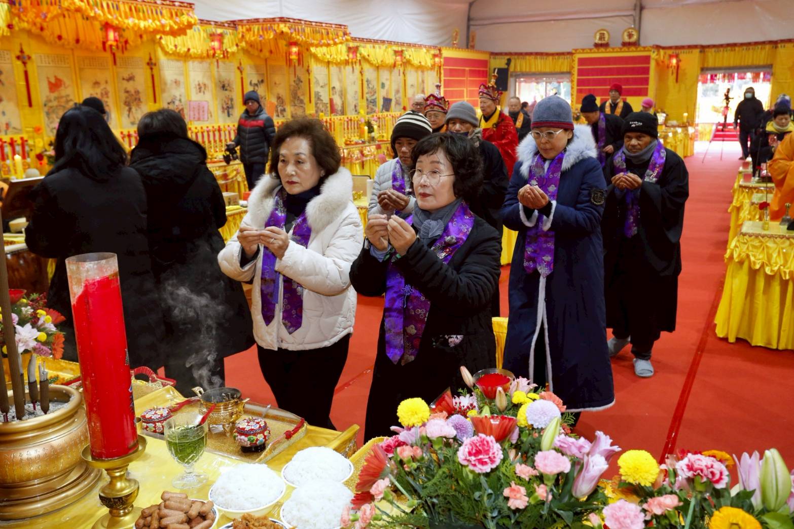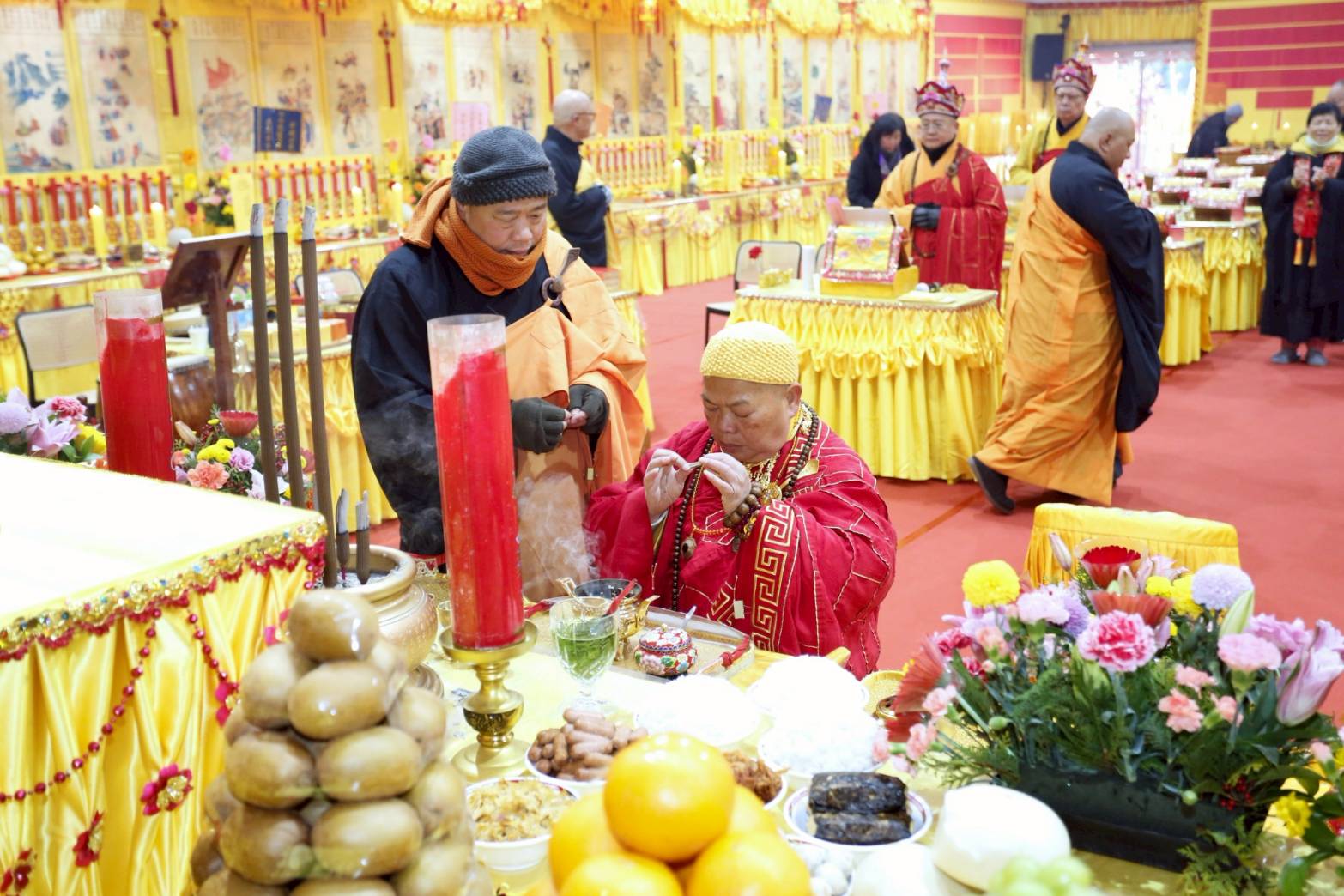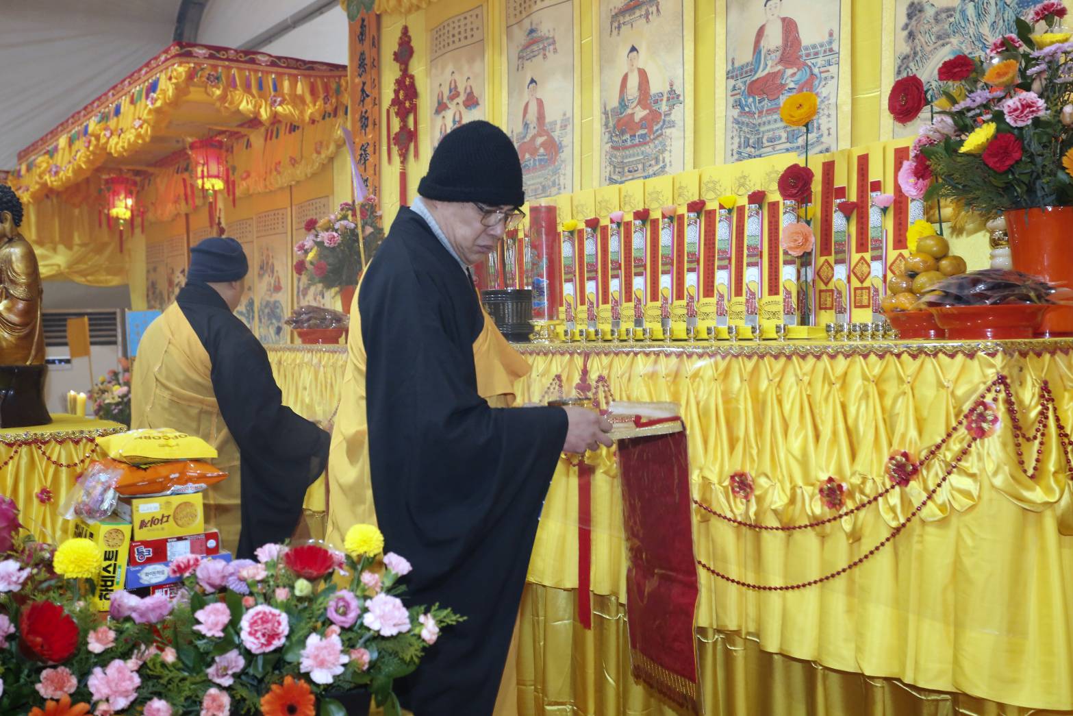 內檀香燈與工作人員調整拜墊方向,中央排兩行齋主拜墊,東西單面對面,留出一人可走的寬度,獻寶時讓捧寶物的出家眾穿越。