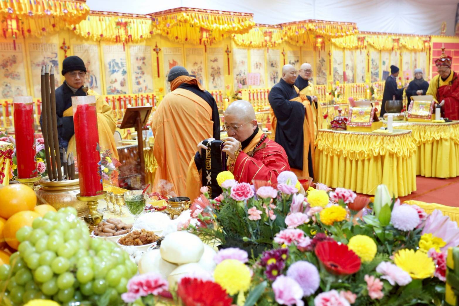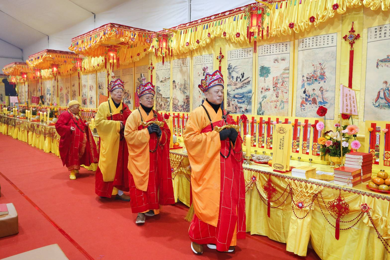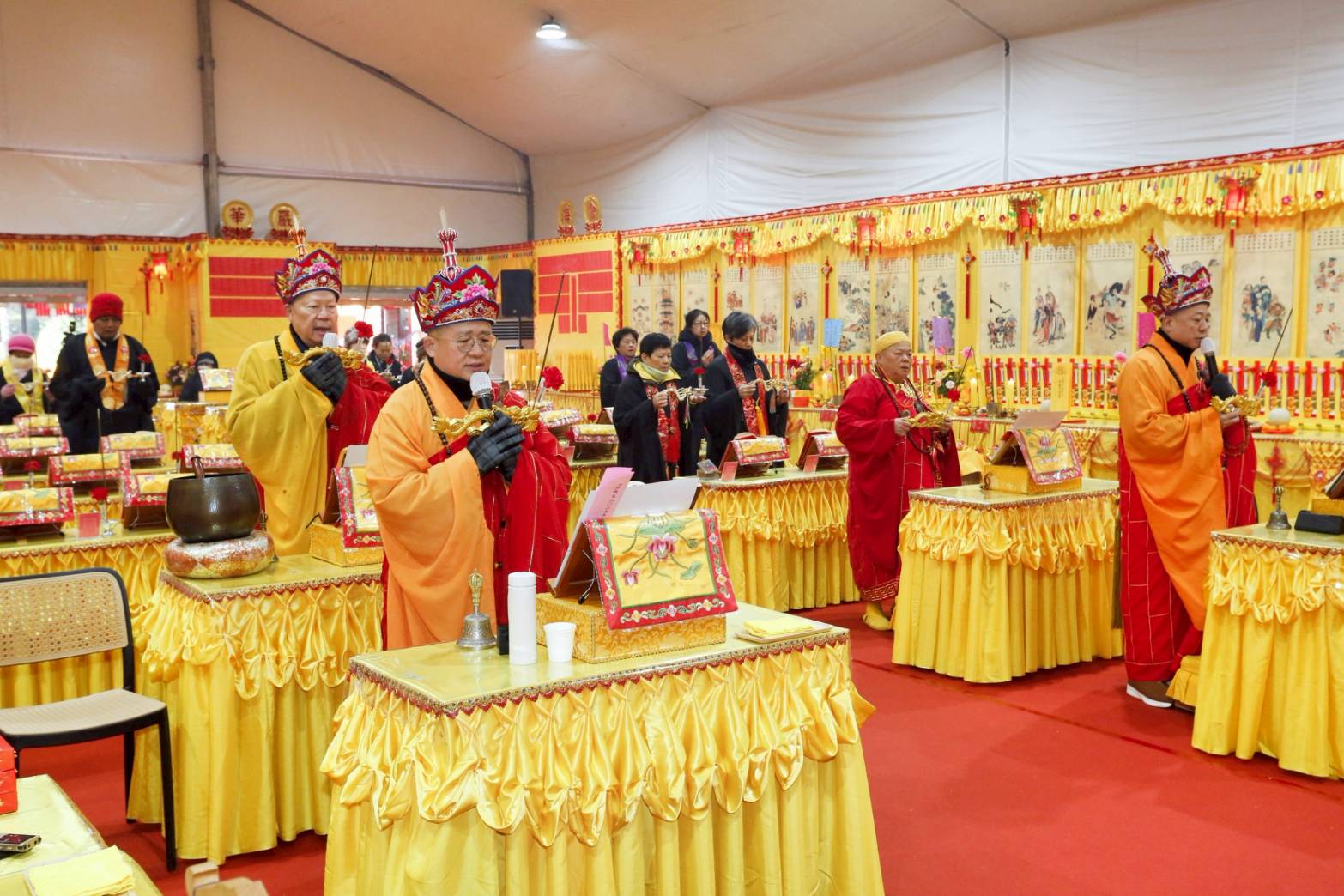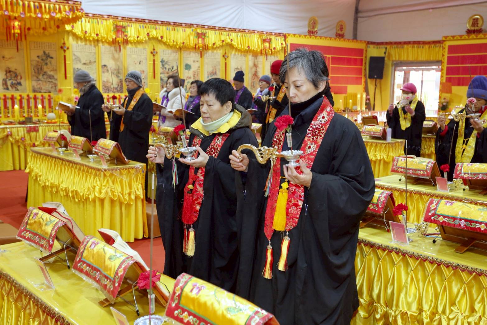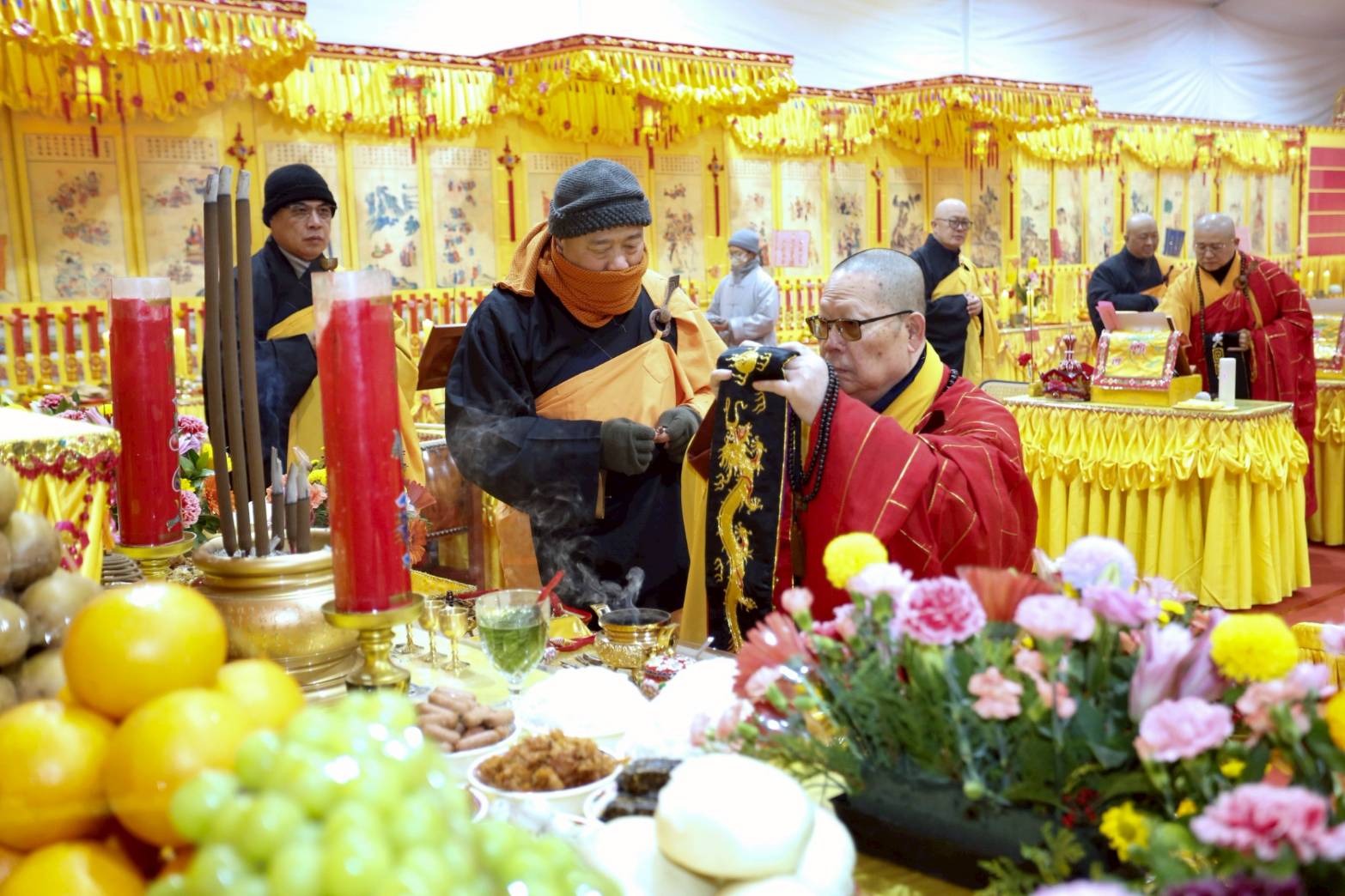 內檀香燈與工作人員調整拜墊方向,中央排兩行齋主拜墊,東西單面對面,留出一人可走的寬度,獻寶時讓捧寶物的出家眾穿越。