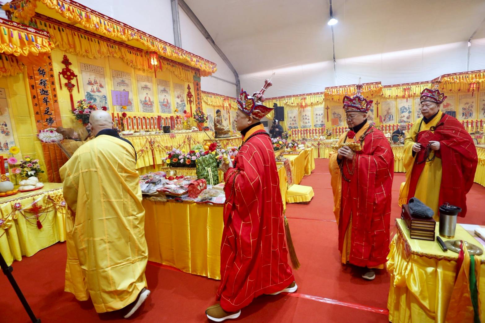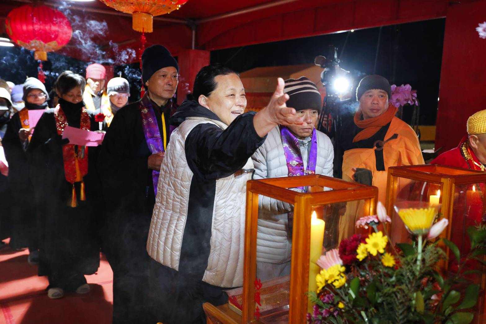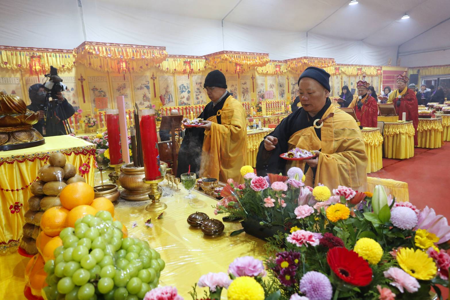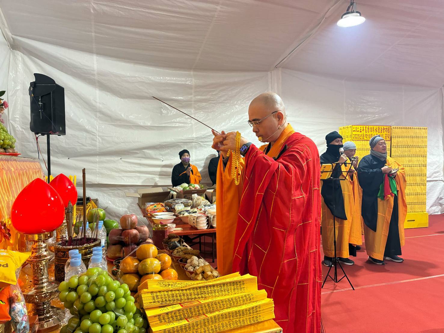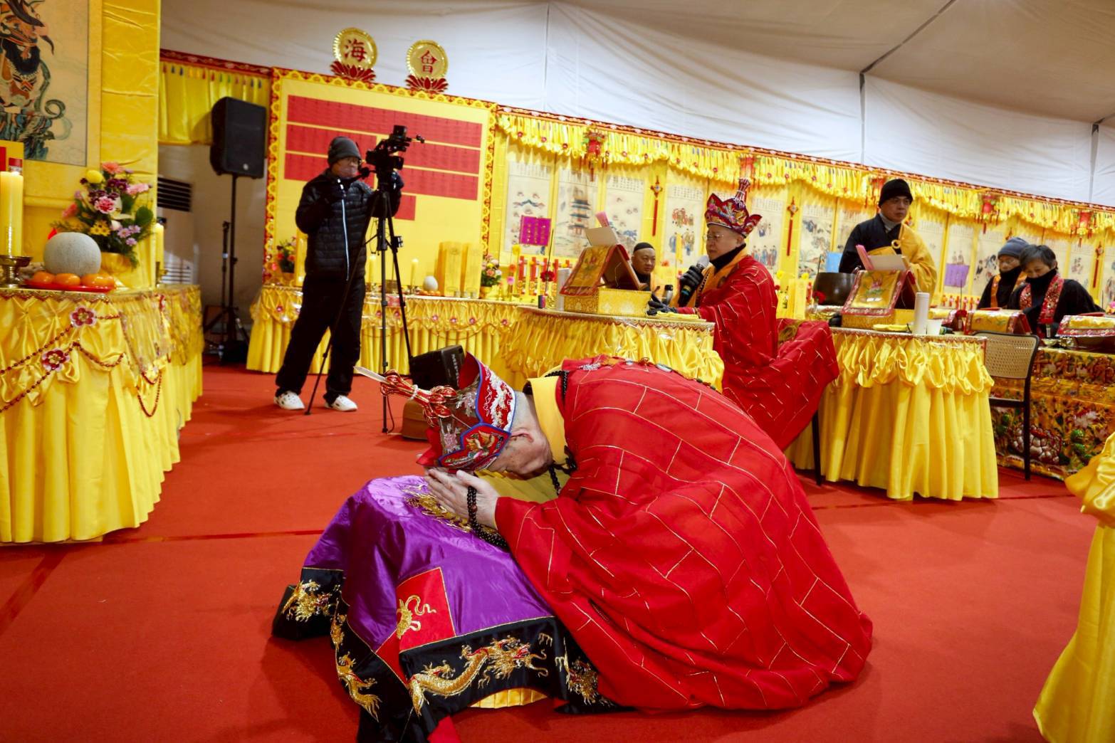 內檀香燈與工作人員調整拜墊方向,中央排兩行齋主拜墊,東西單面對面,留出一人可走的寬度,獻寶時讓捧寶物的出家眾穿越。