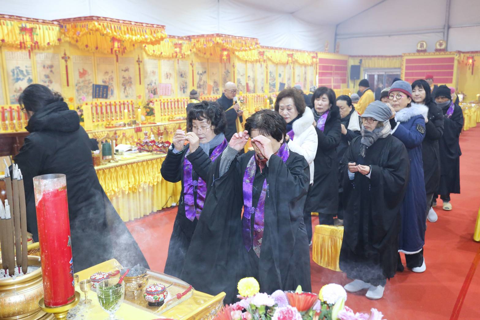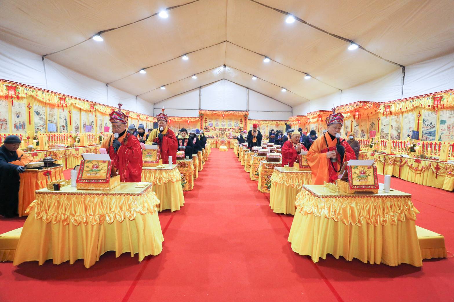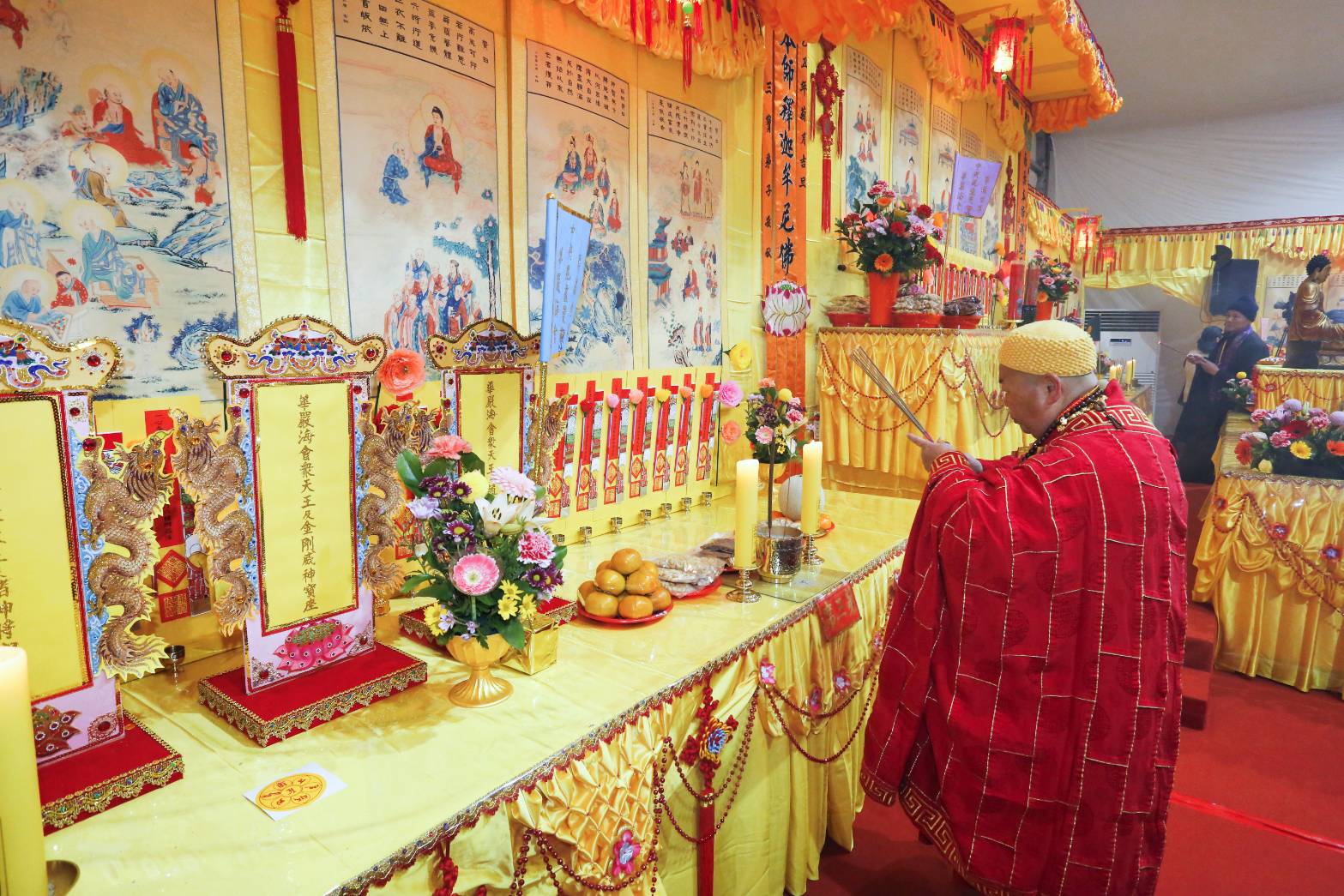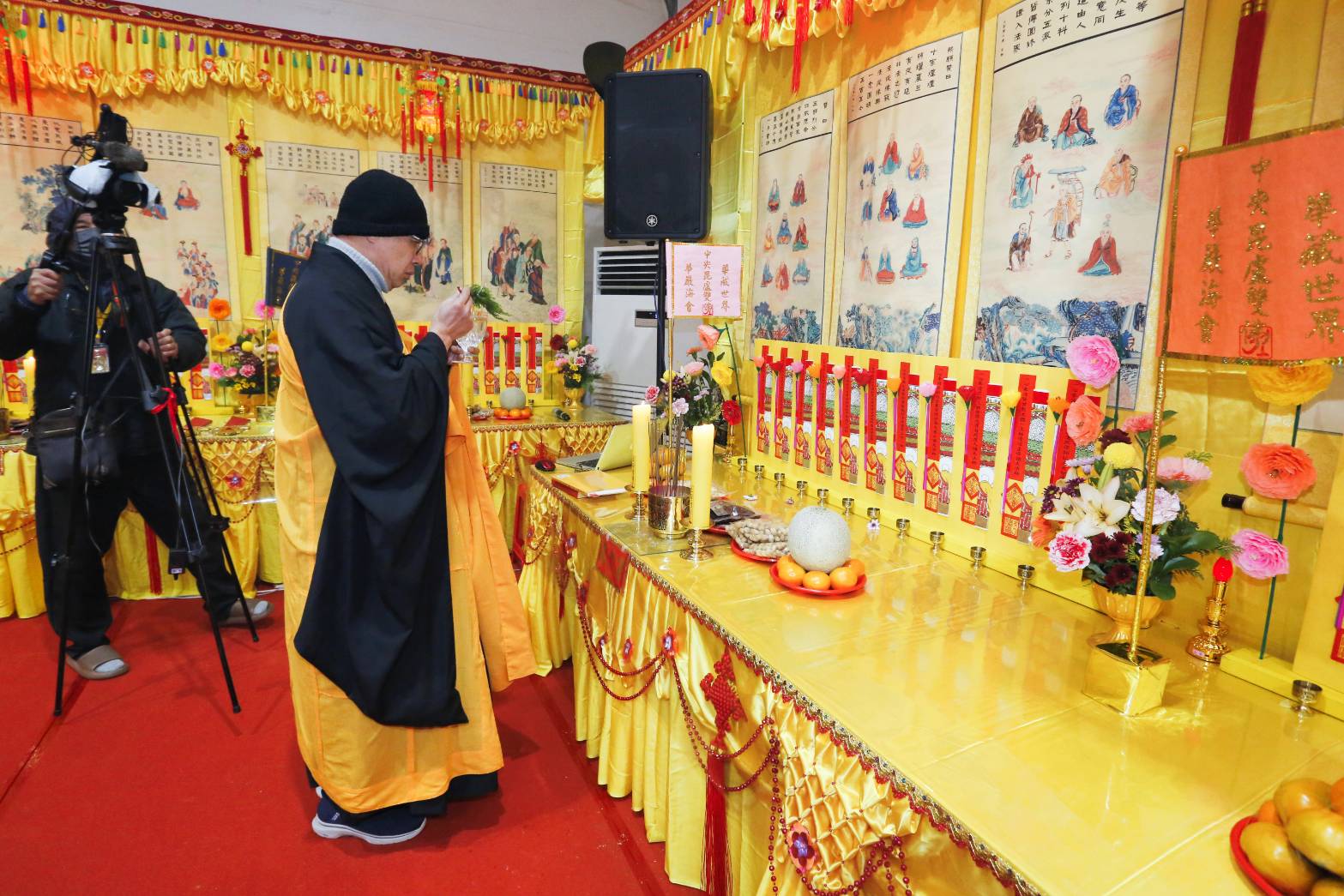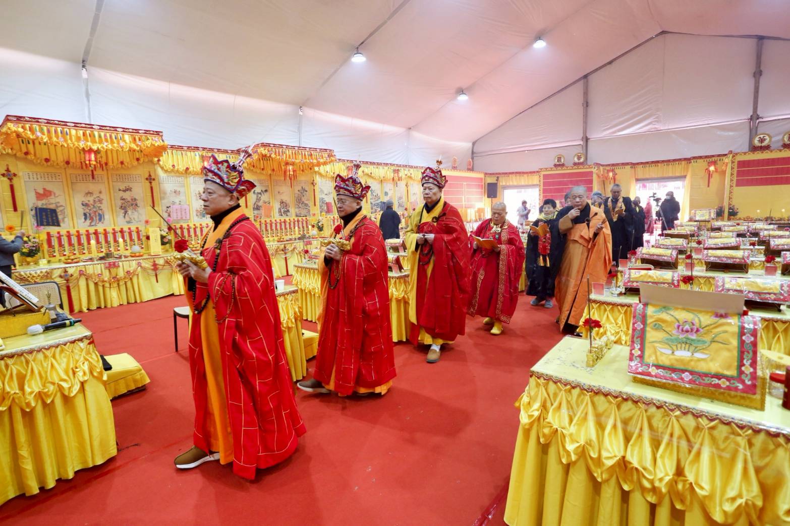 內檀香燈與工作人員調整拜墊方向,中央排兩行齋主拜墊,東西單面對面,留出一人可走的寬度,獻寶時讓捧寶物的出家眾穿越。