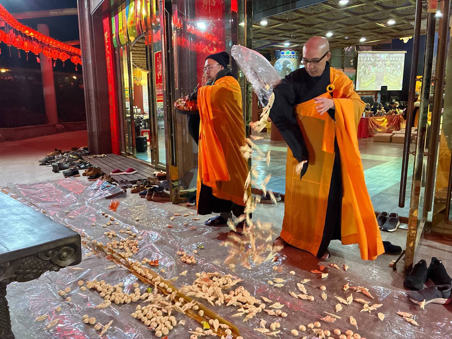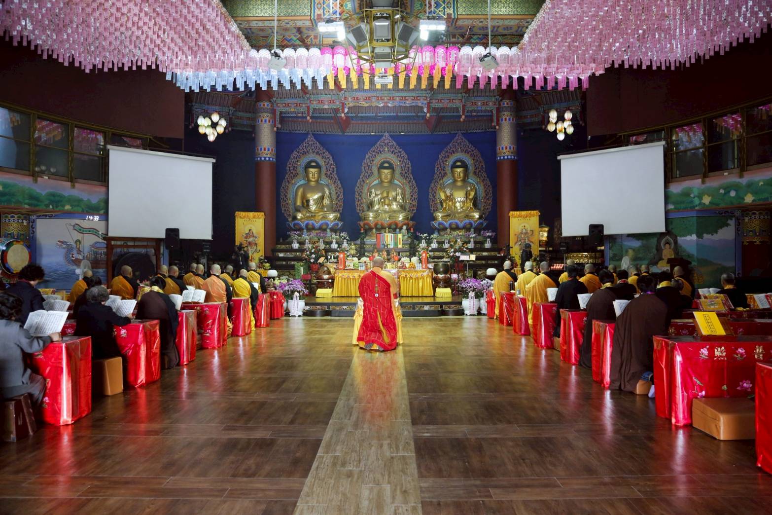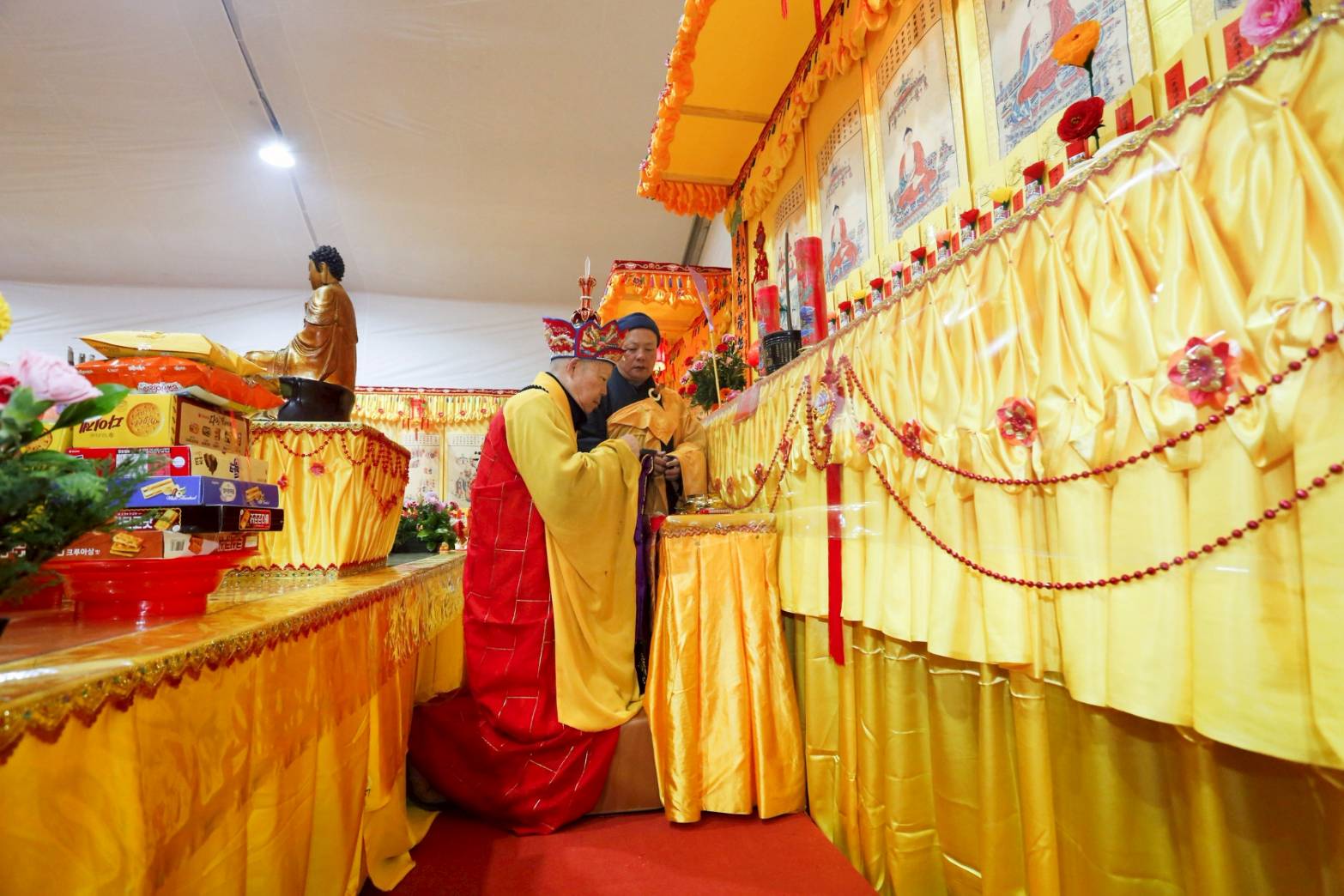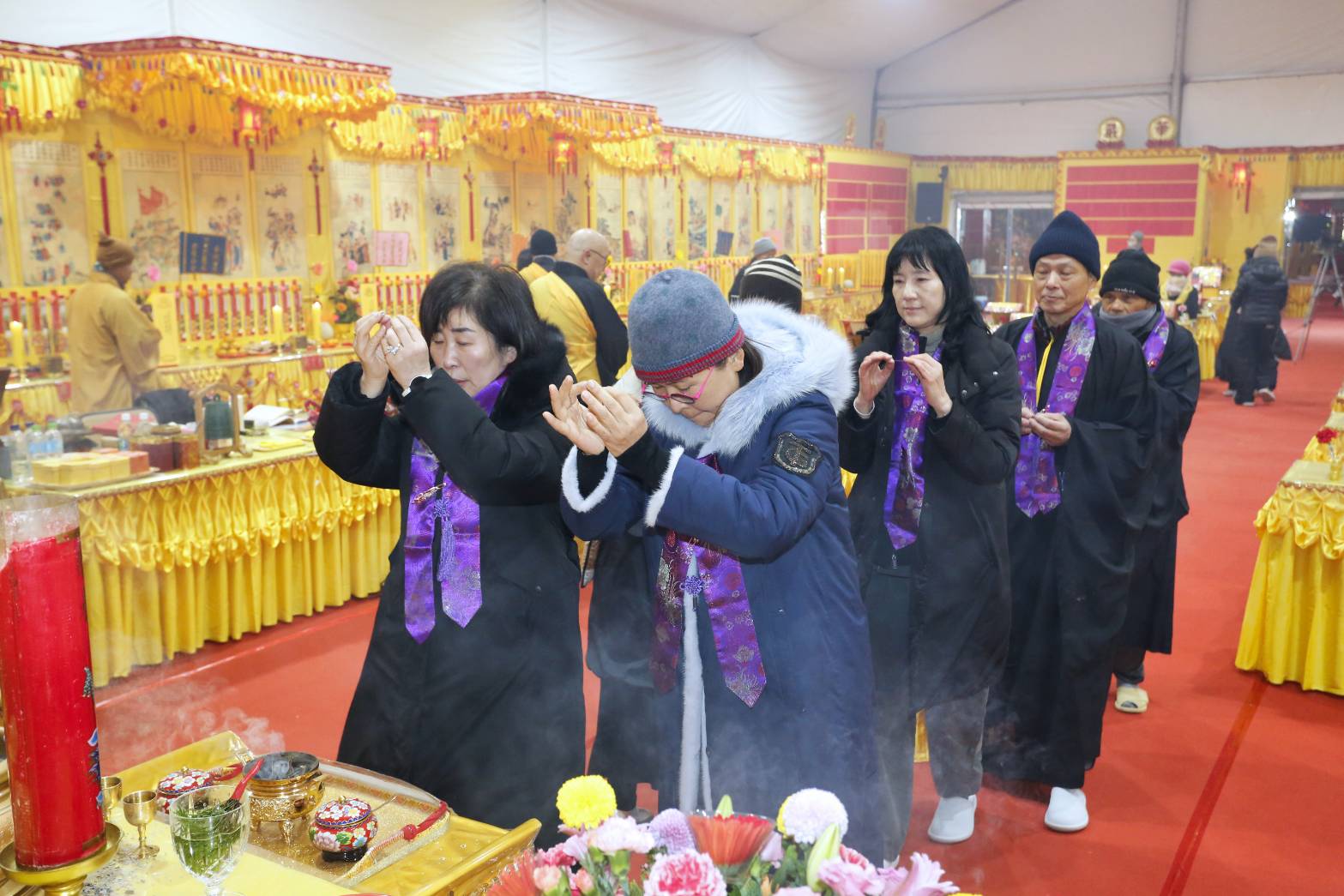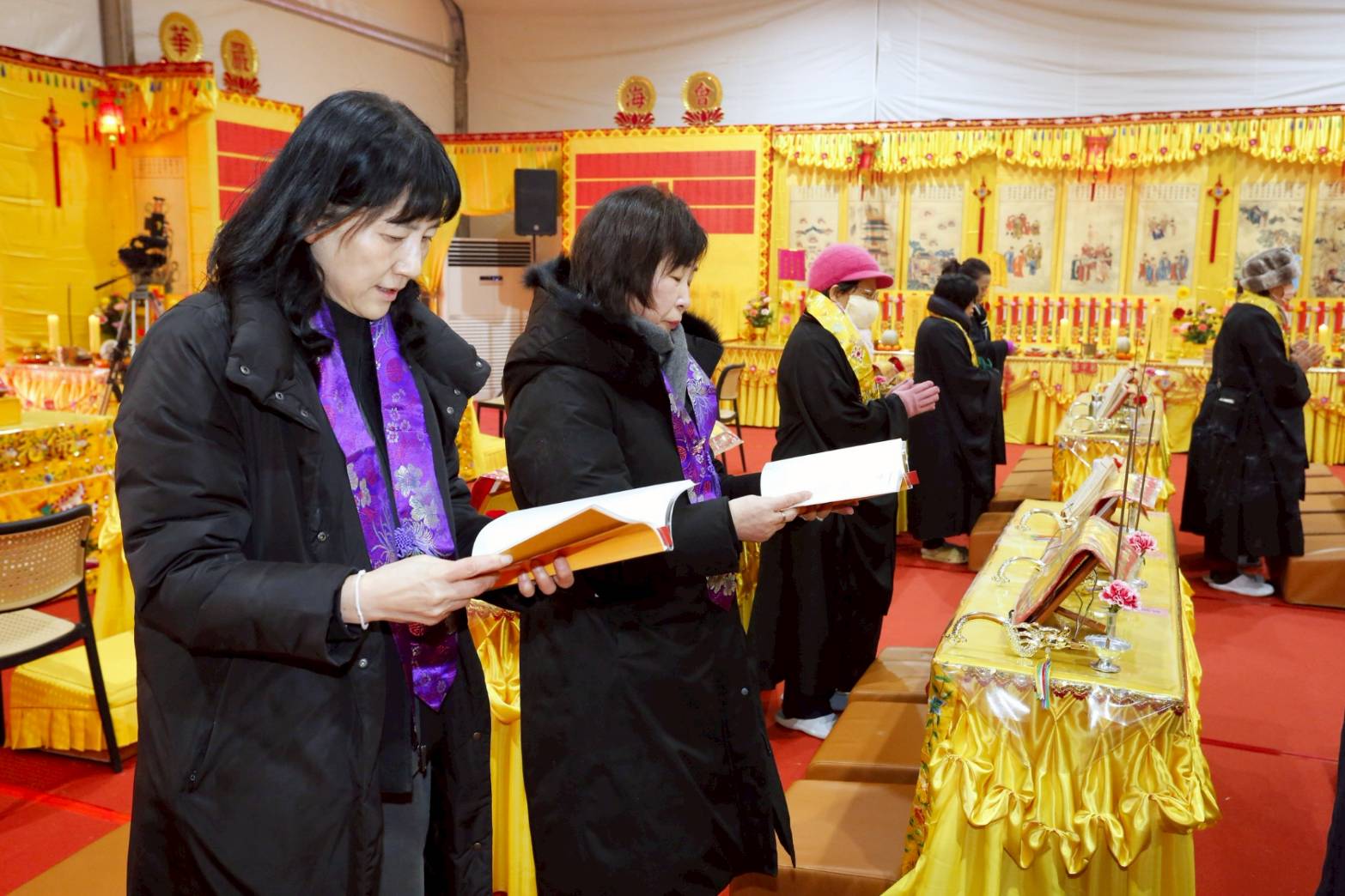 內檀香燈與工作人員調整拜墊方向,中央排兩行齋主拜墊,東西單面對面,留出一人可走的寬度,獻寶時讓捧寶物的出家眾穿越。