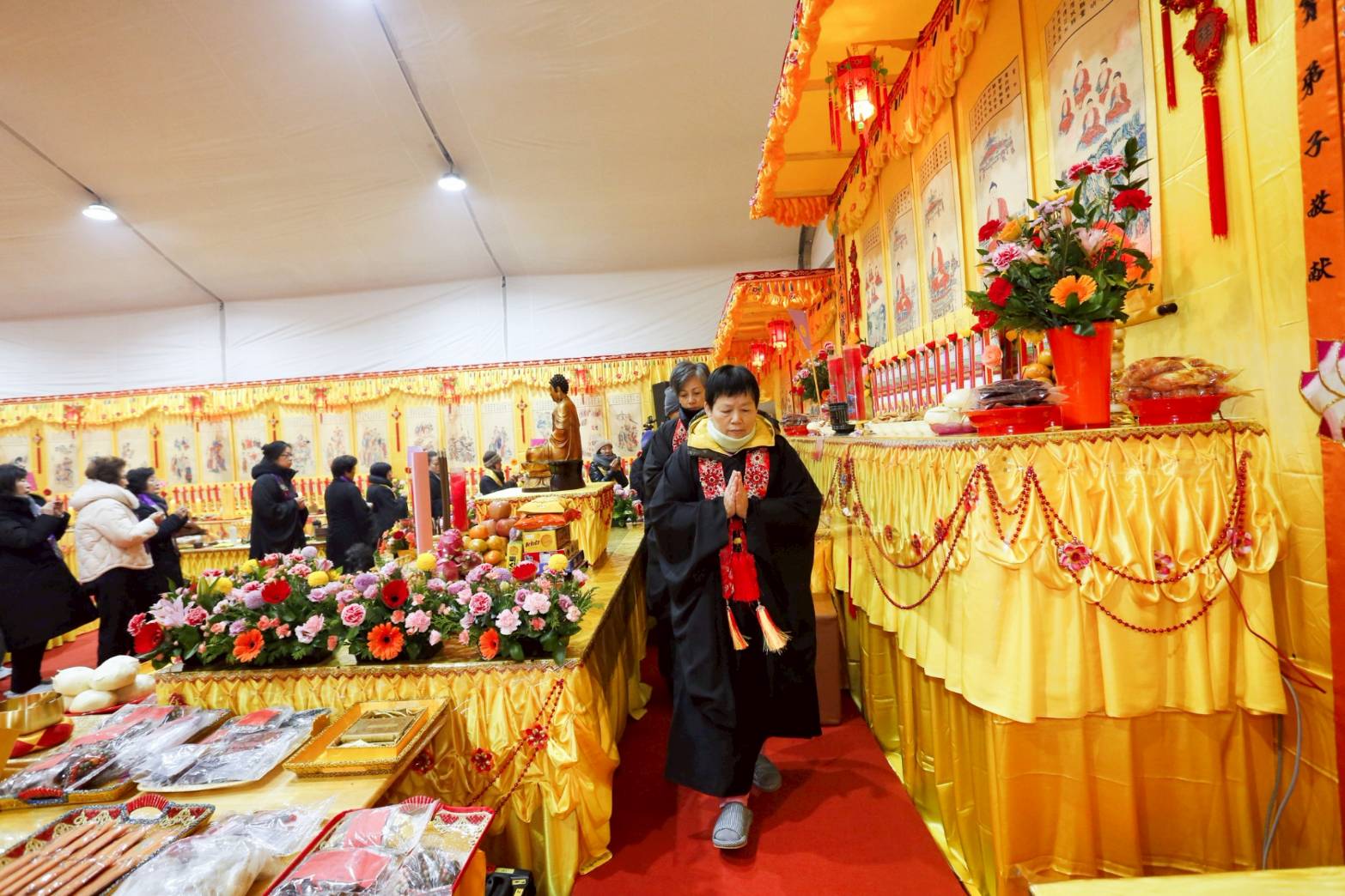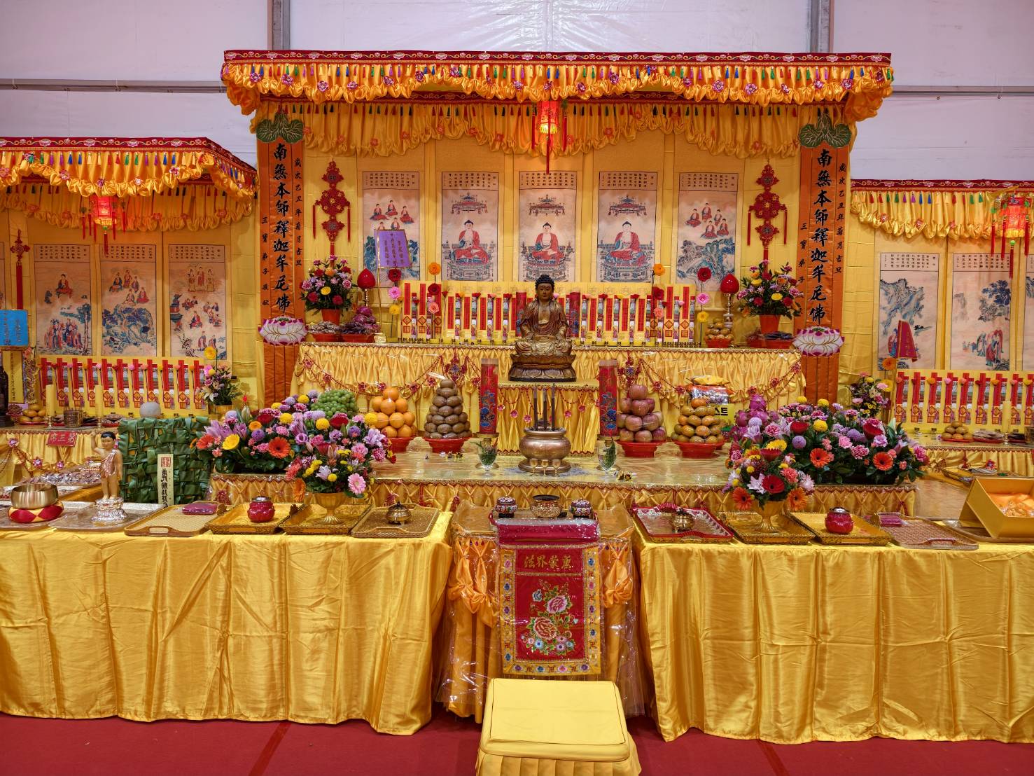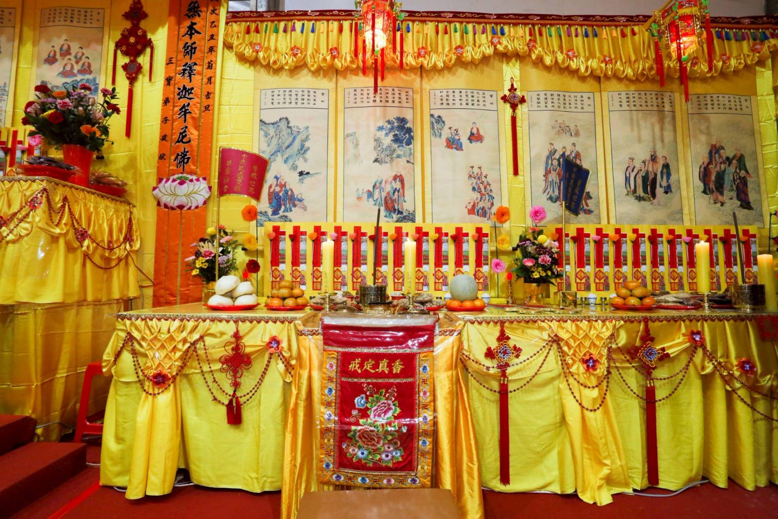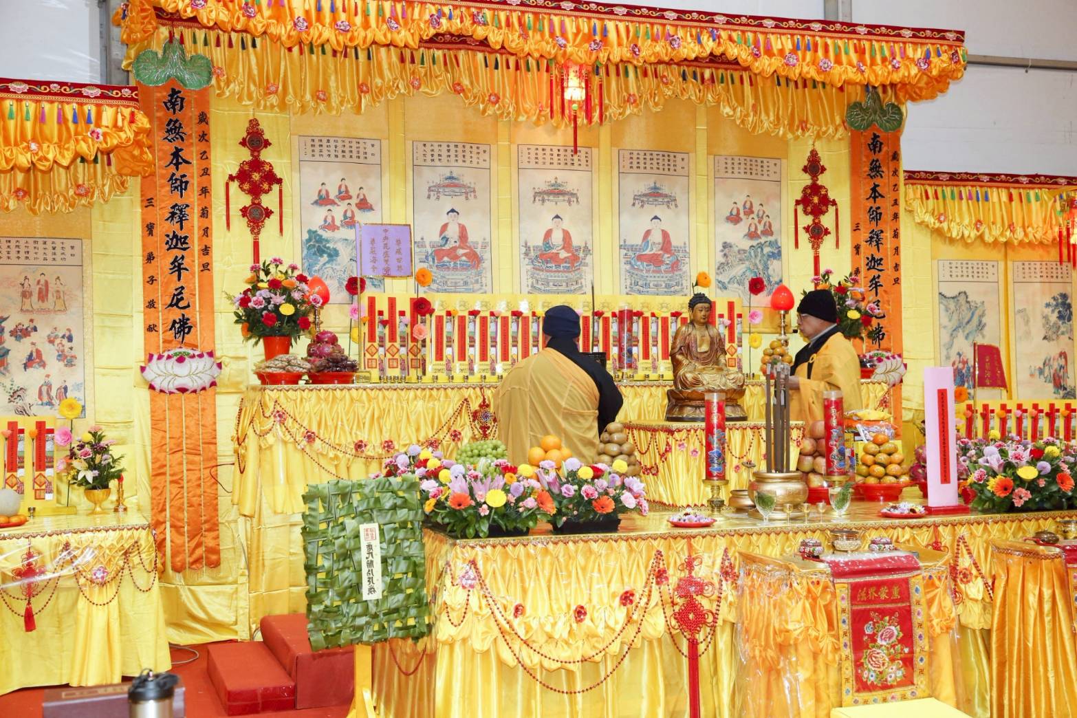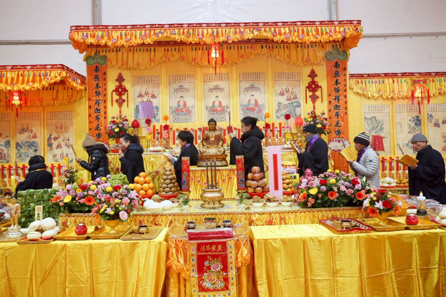 內檀香燈與工作人員調整拜墊方向,中央排兩行齋主拜墊,東西單面對面,留出一人可走的寬度,獻寶時讓捧寶物的出家眾穿越。