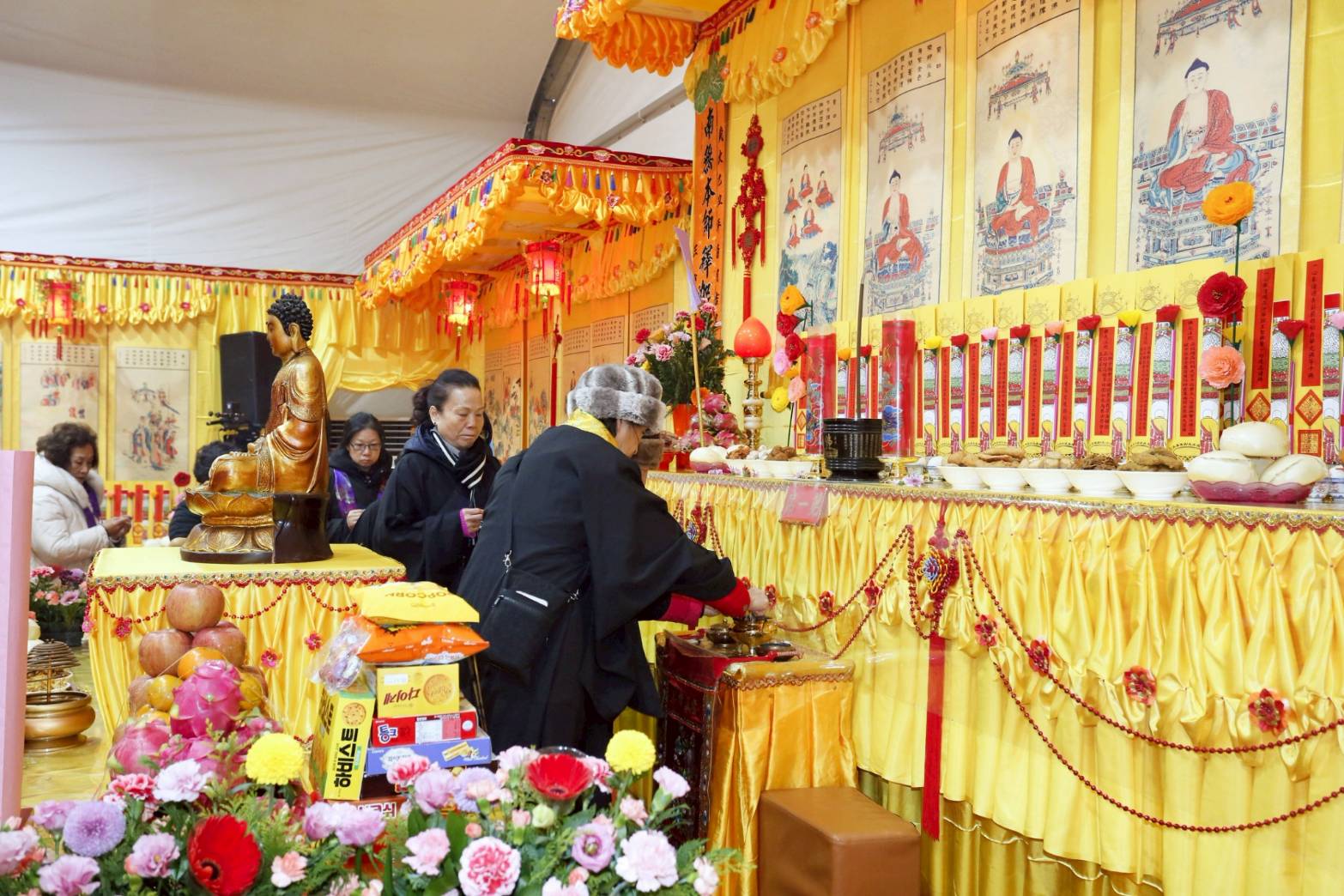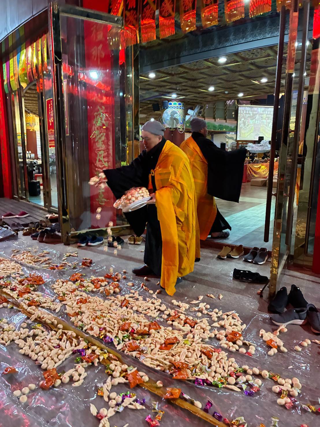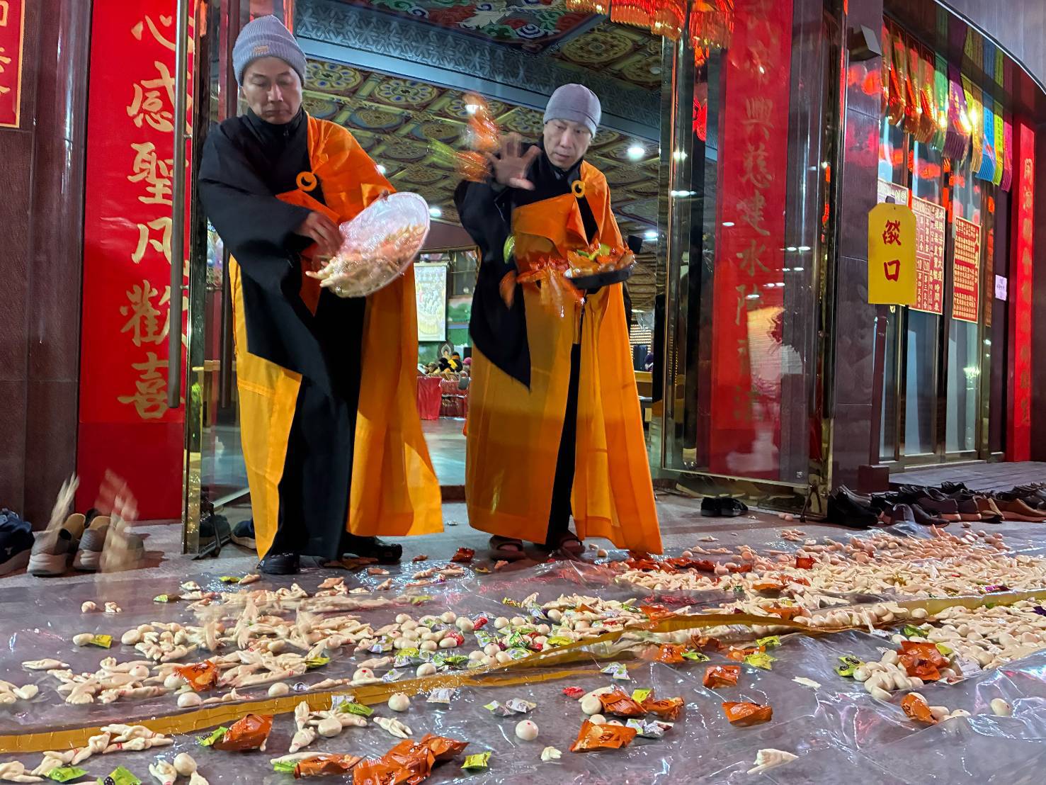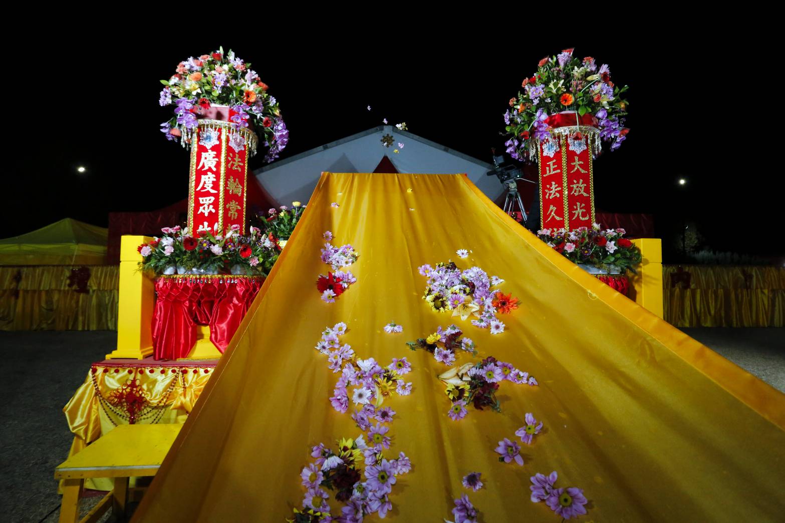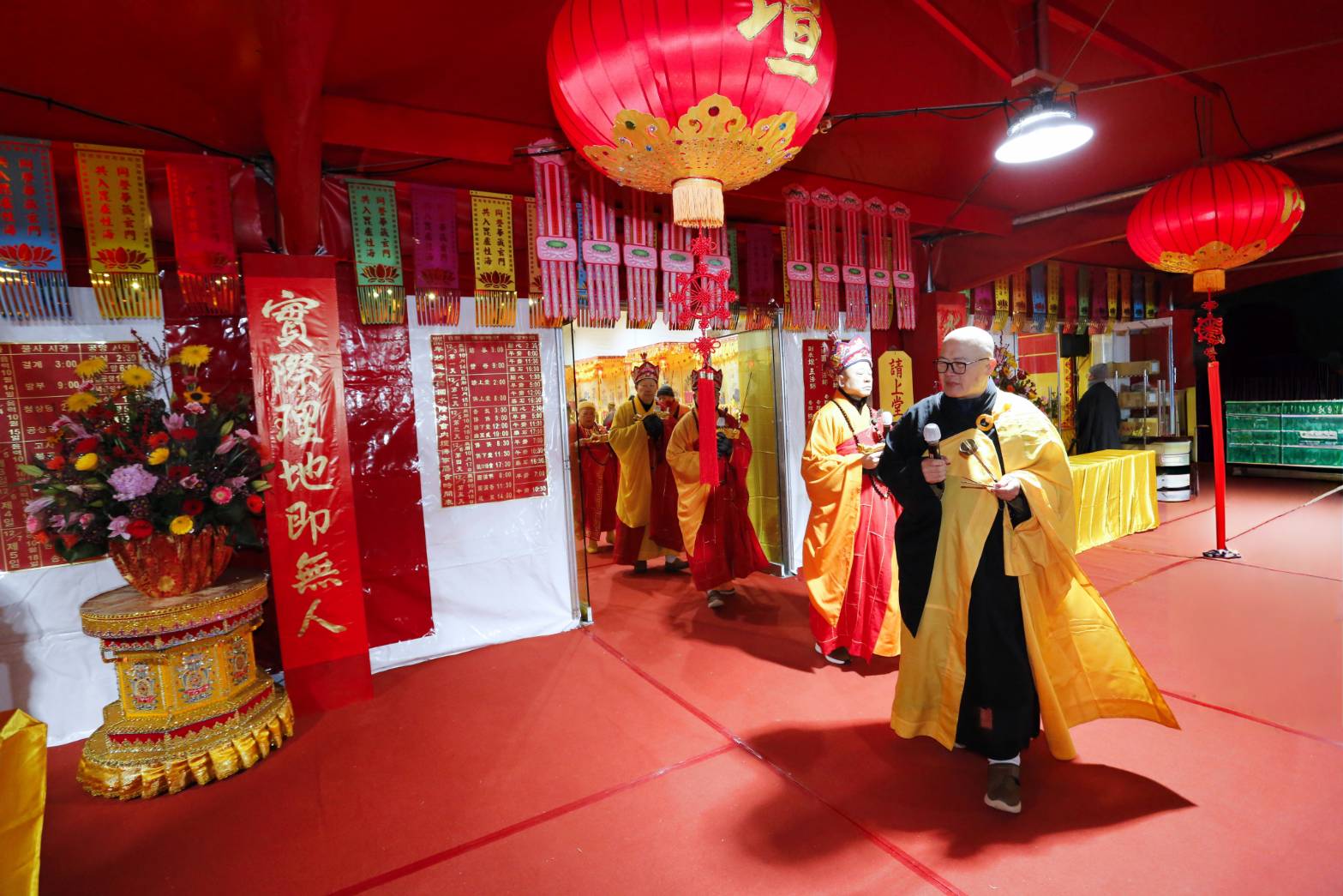 內檀香燈與工作人員調整拜墊方向,中央排兩行齋主拜墊,東西單面對面,留出一人可走的寬度,獻寶時讓捧寶物的出家眾穿越。