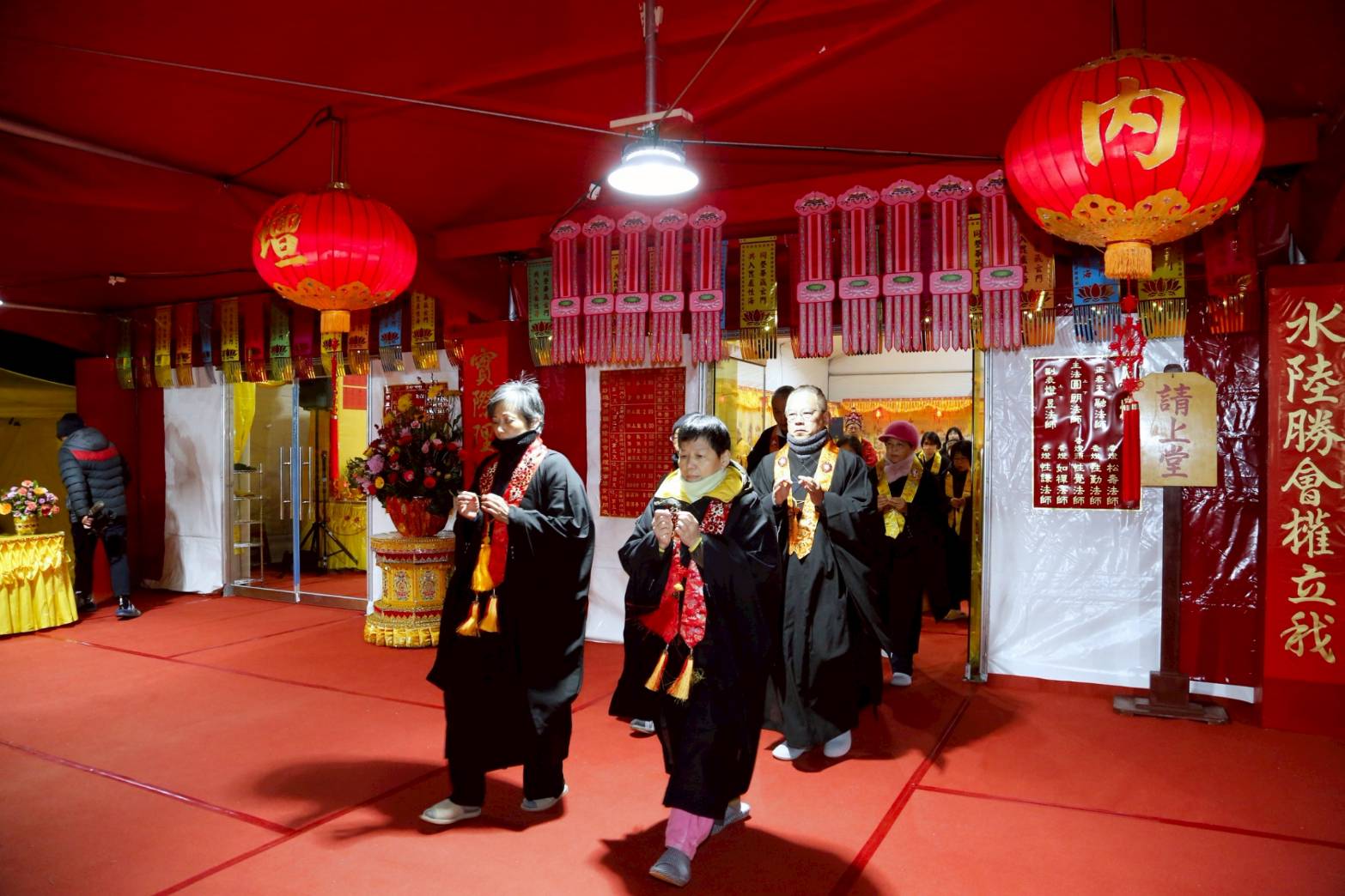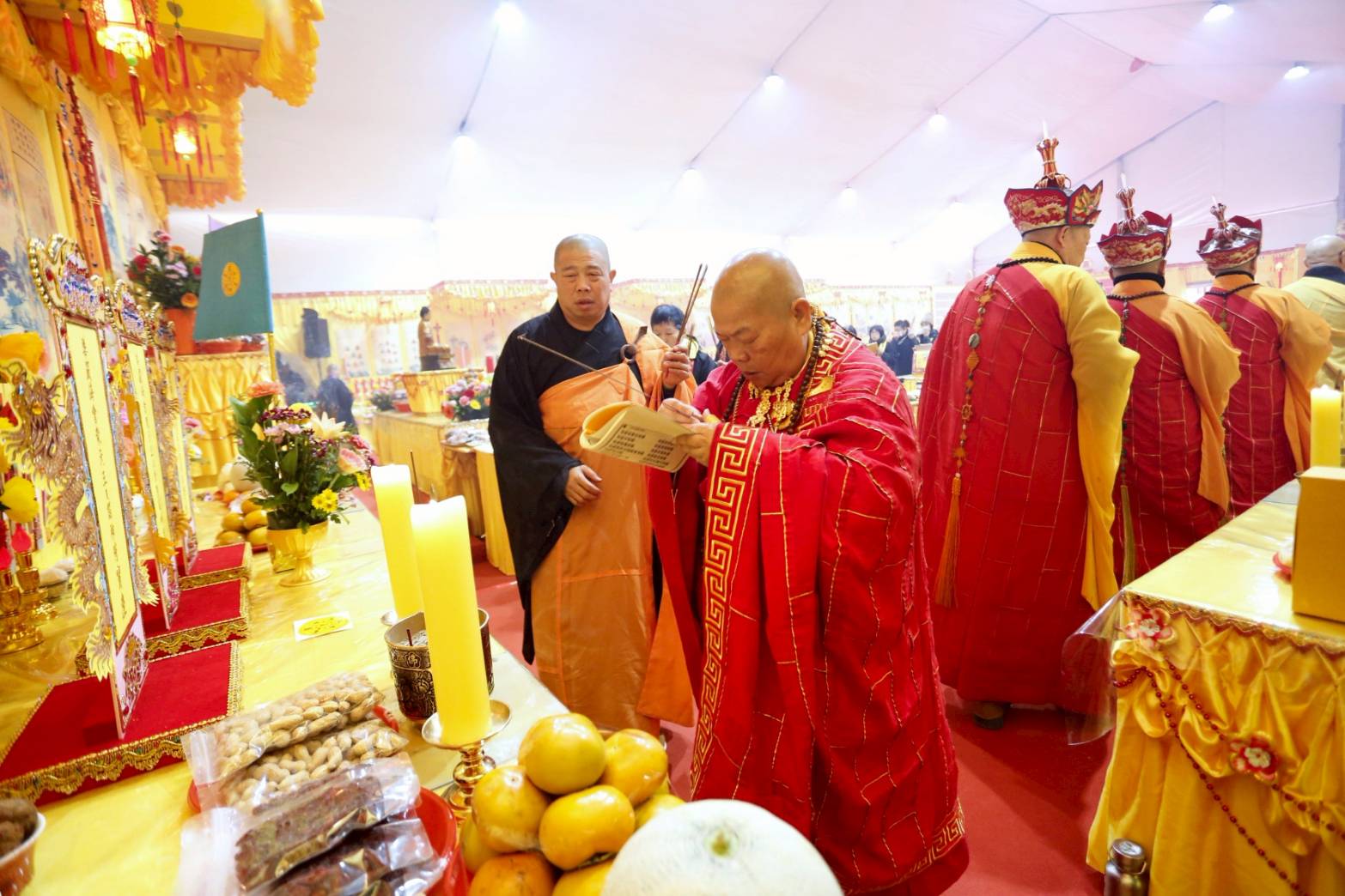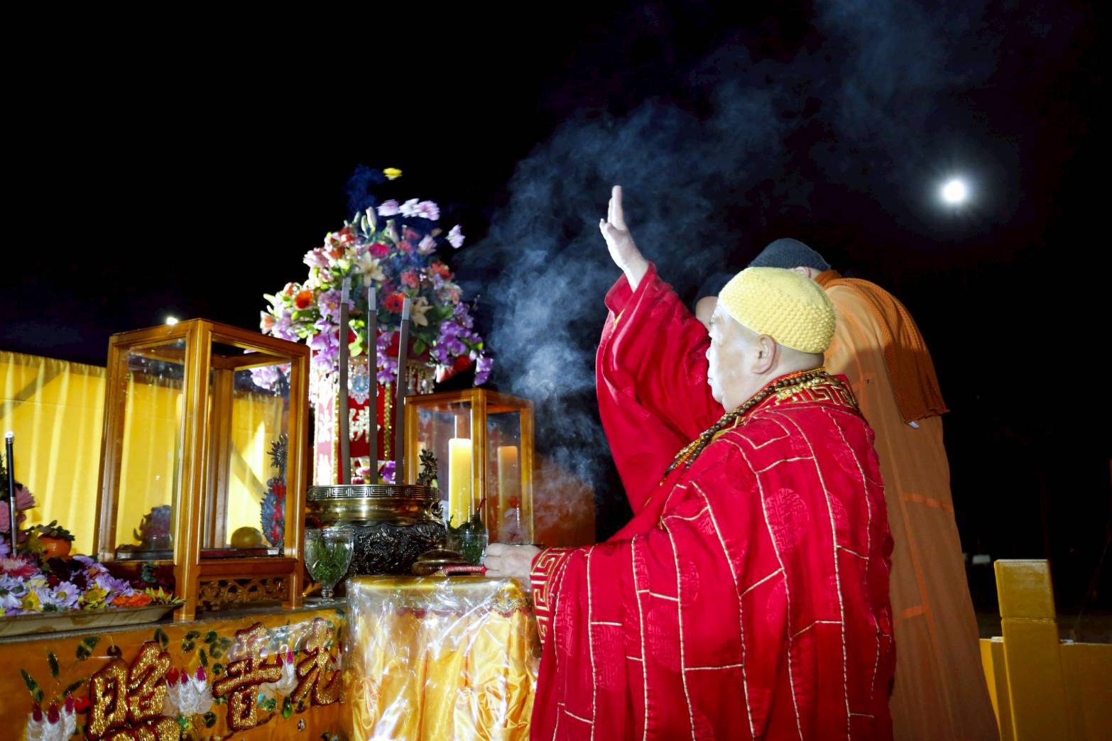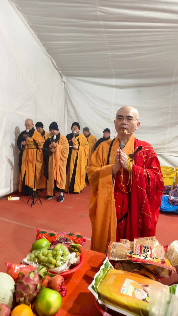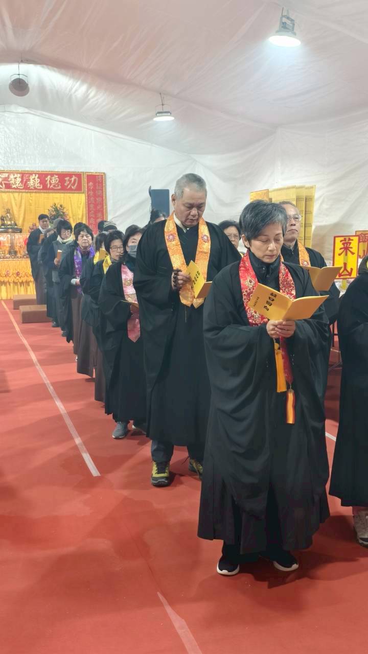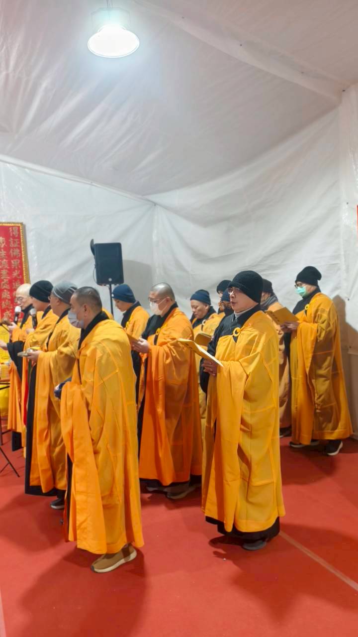 凌晨2點,齋主入壇禮佛三拜,香燈鳴引磬,引領上傳下敦師父、齋主,恭請三位主法和尚。