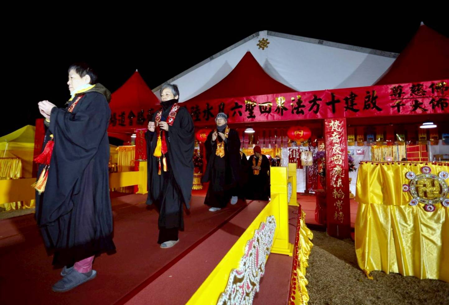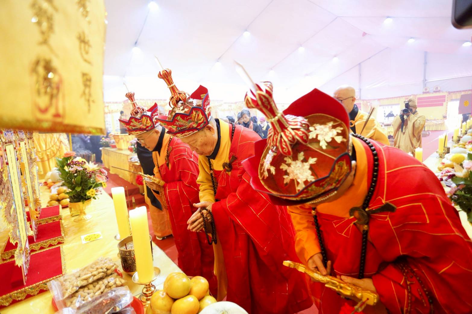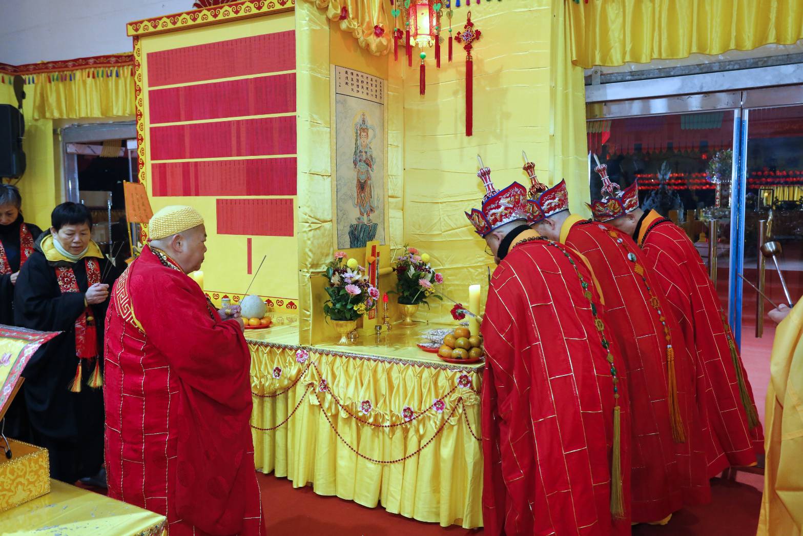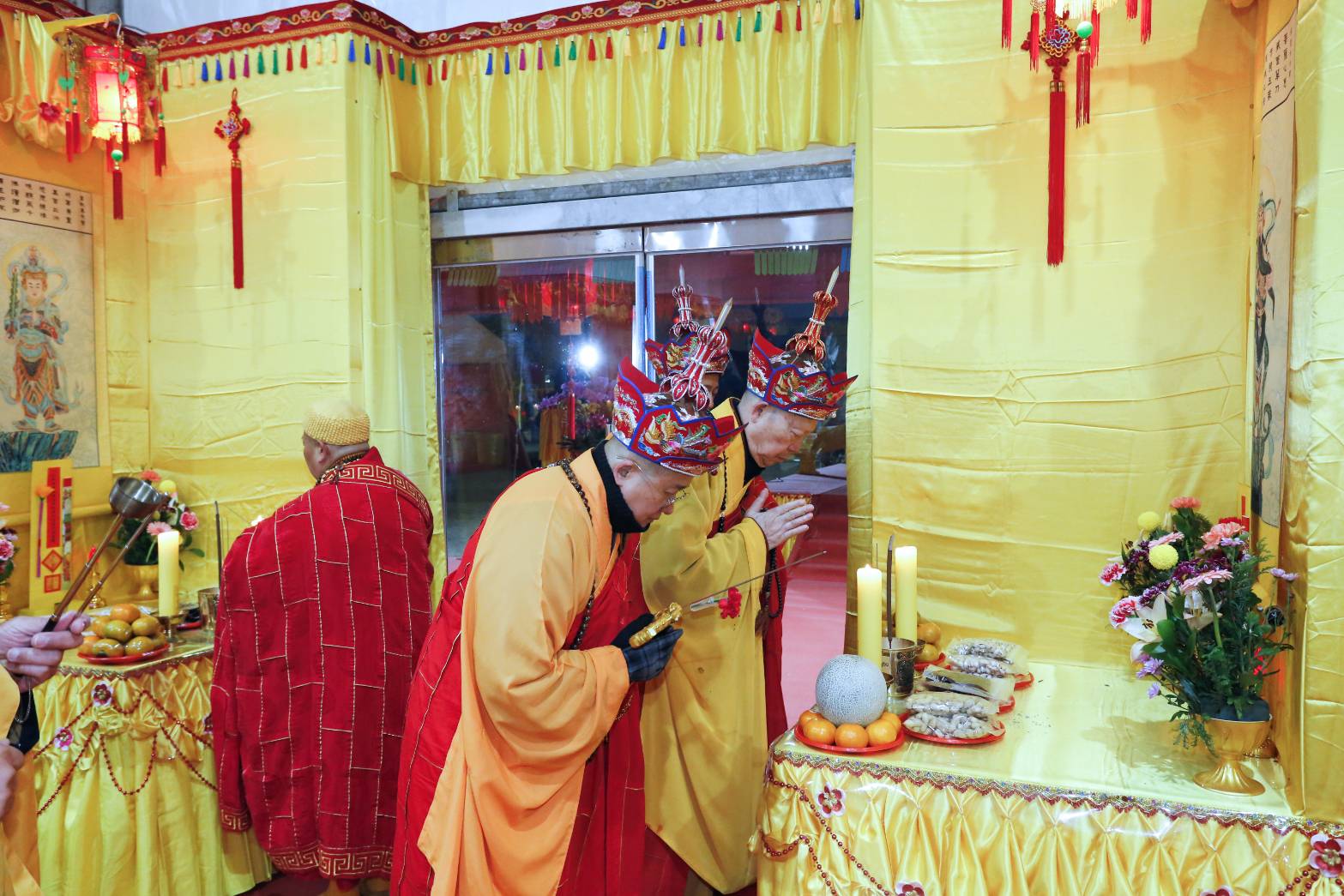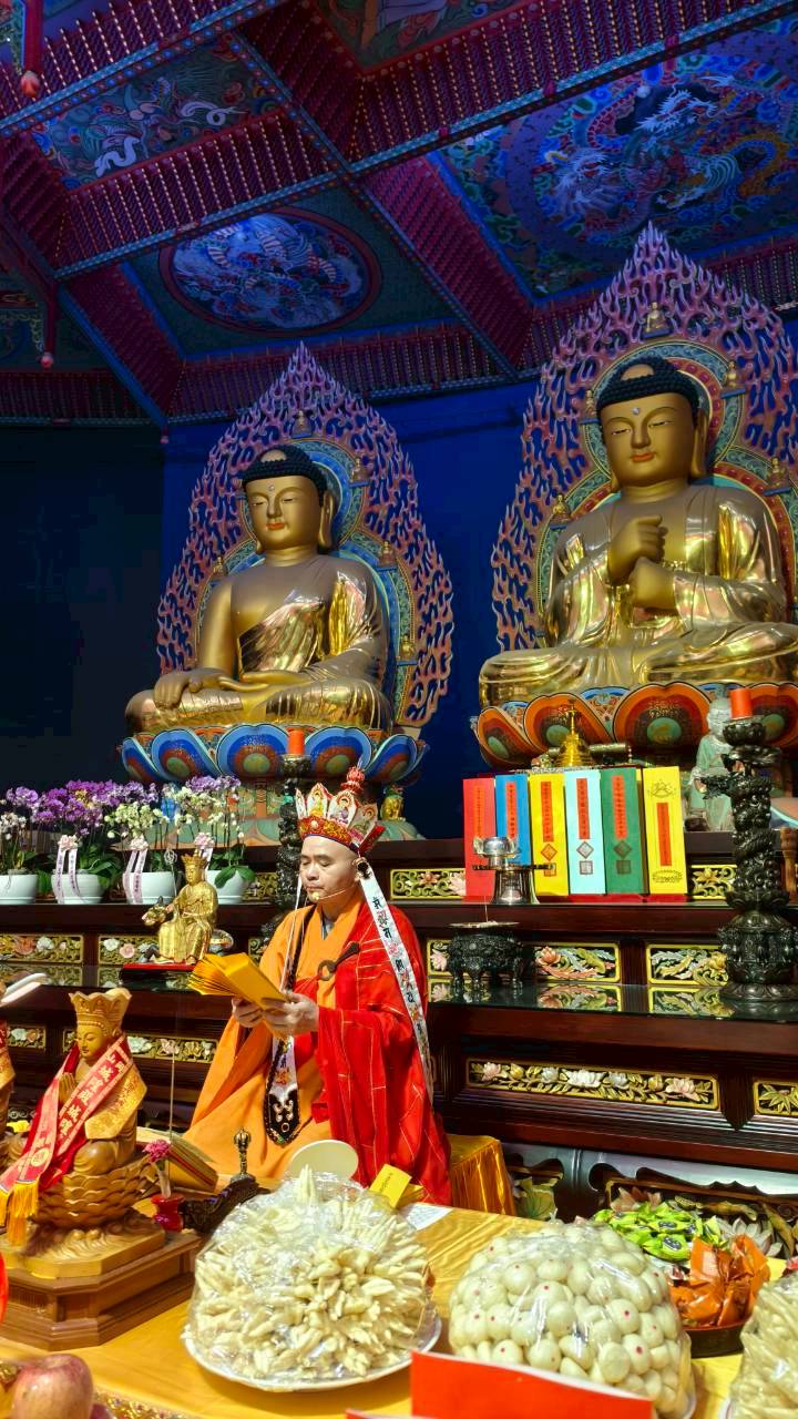 凌晨2點,齋主入壇禮佛三拜,香燈鳴引磬,引領上傳下敦師父、齋主,恭請三位主法和尚。