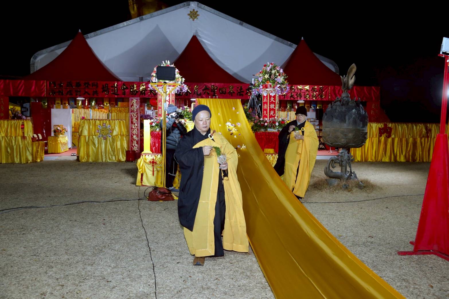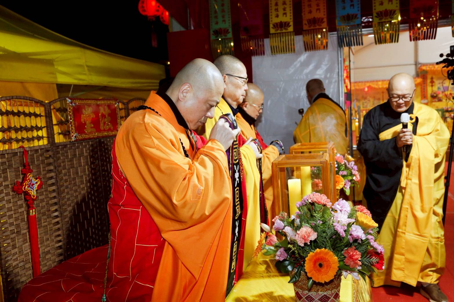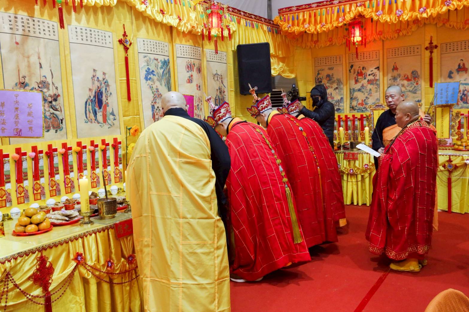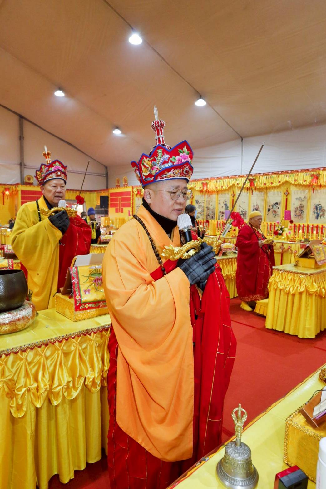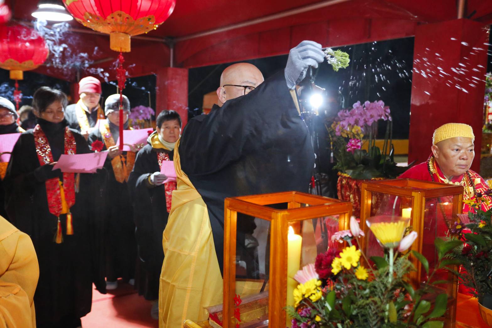 凌晨2點,齋主入壇禮佛三拜,香燈鳴引磬,引領上傳下敦師父、齋主,恭請三位主法和尚。