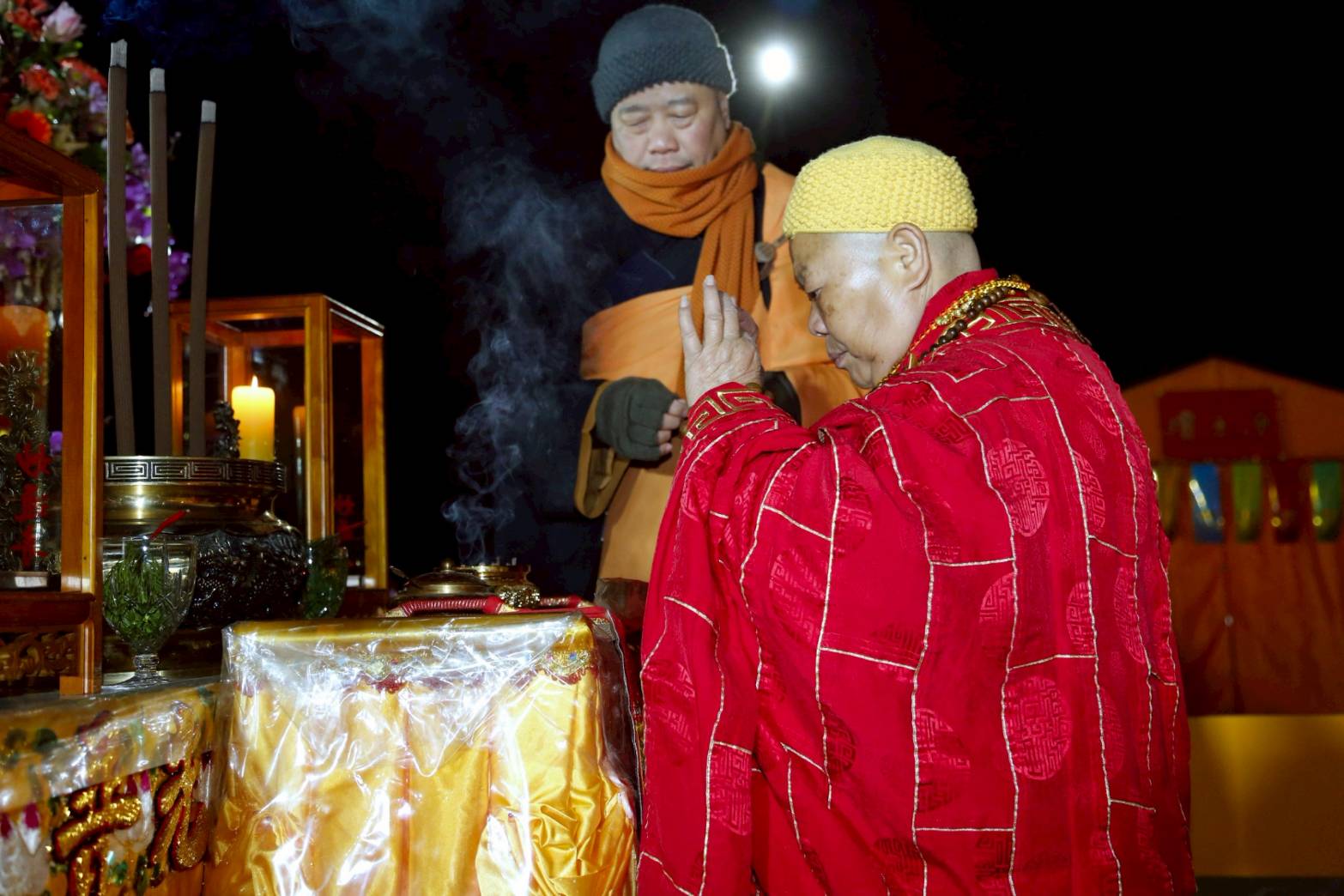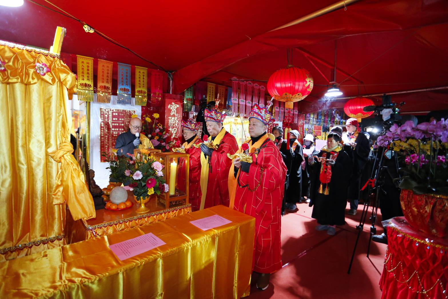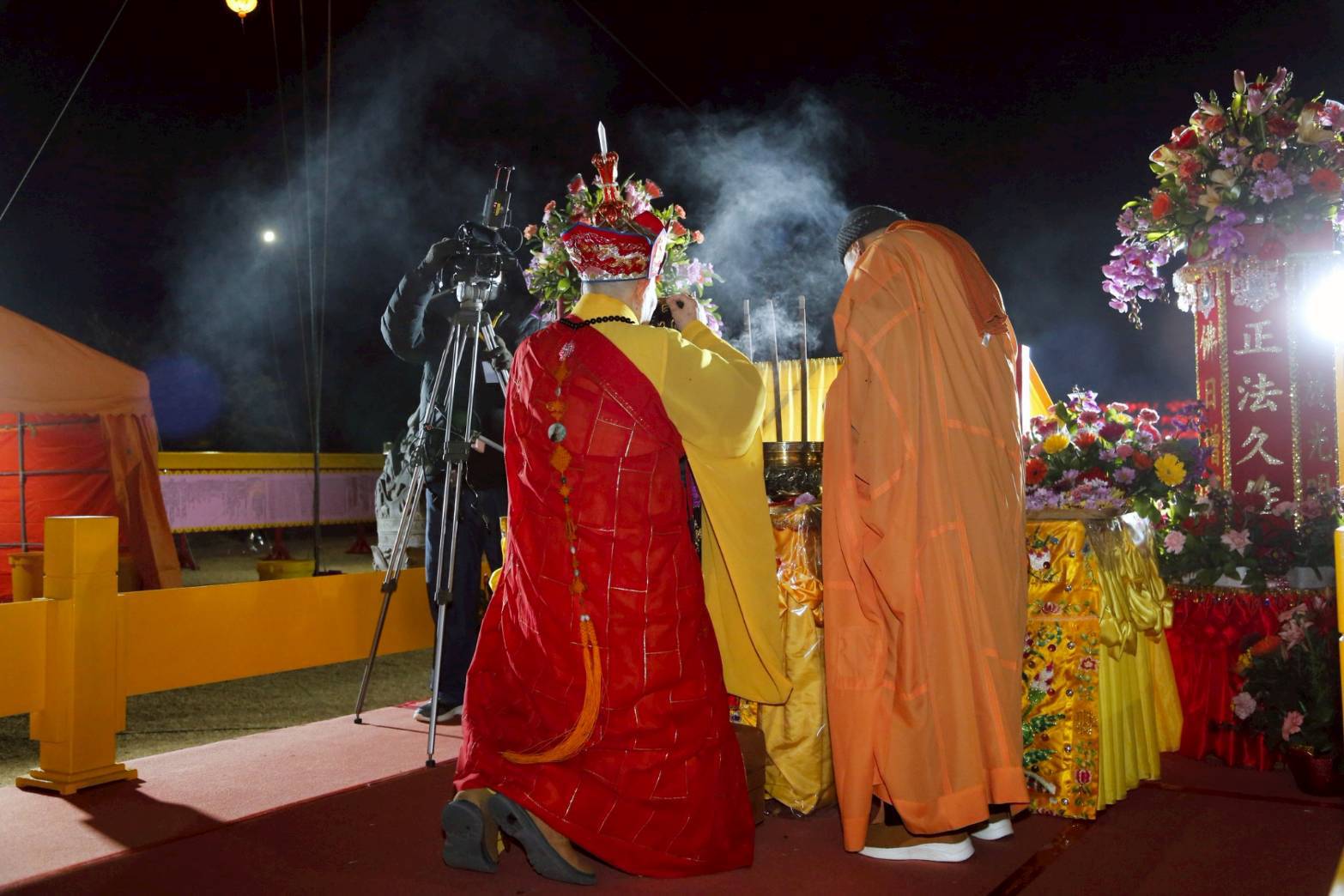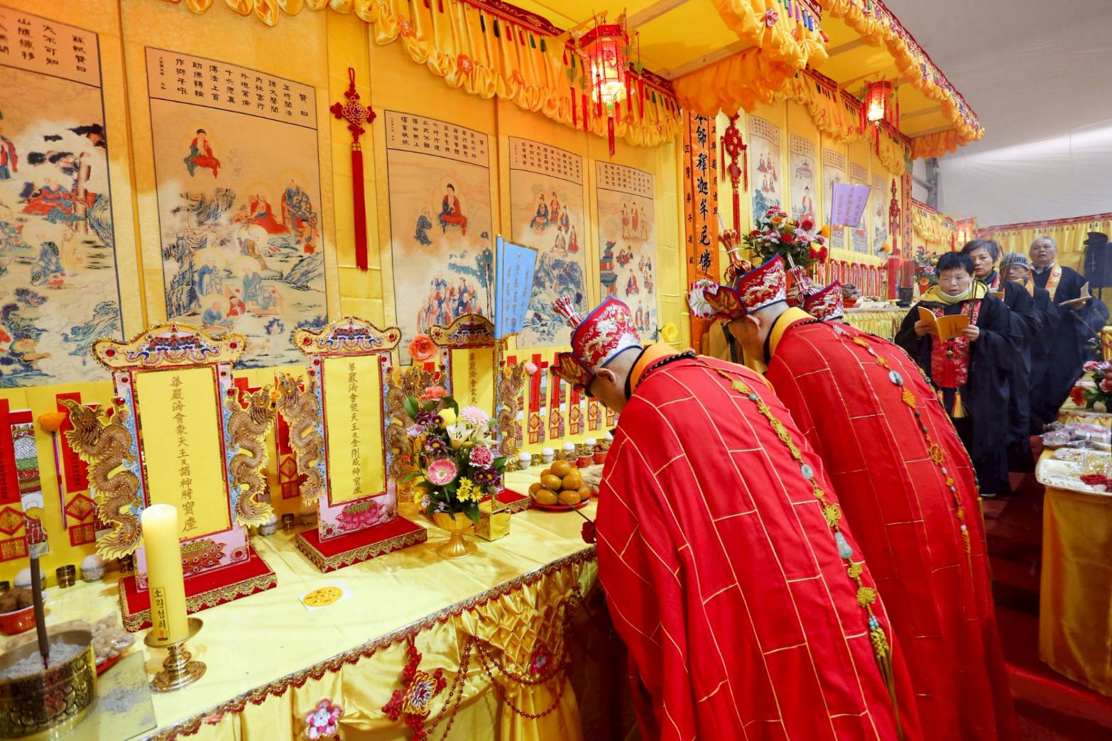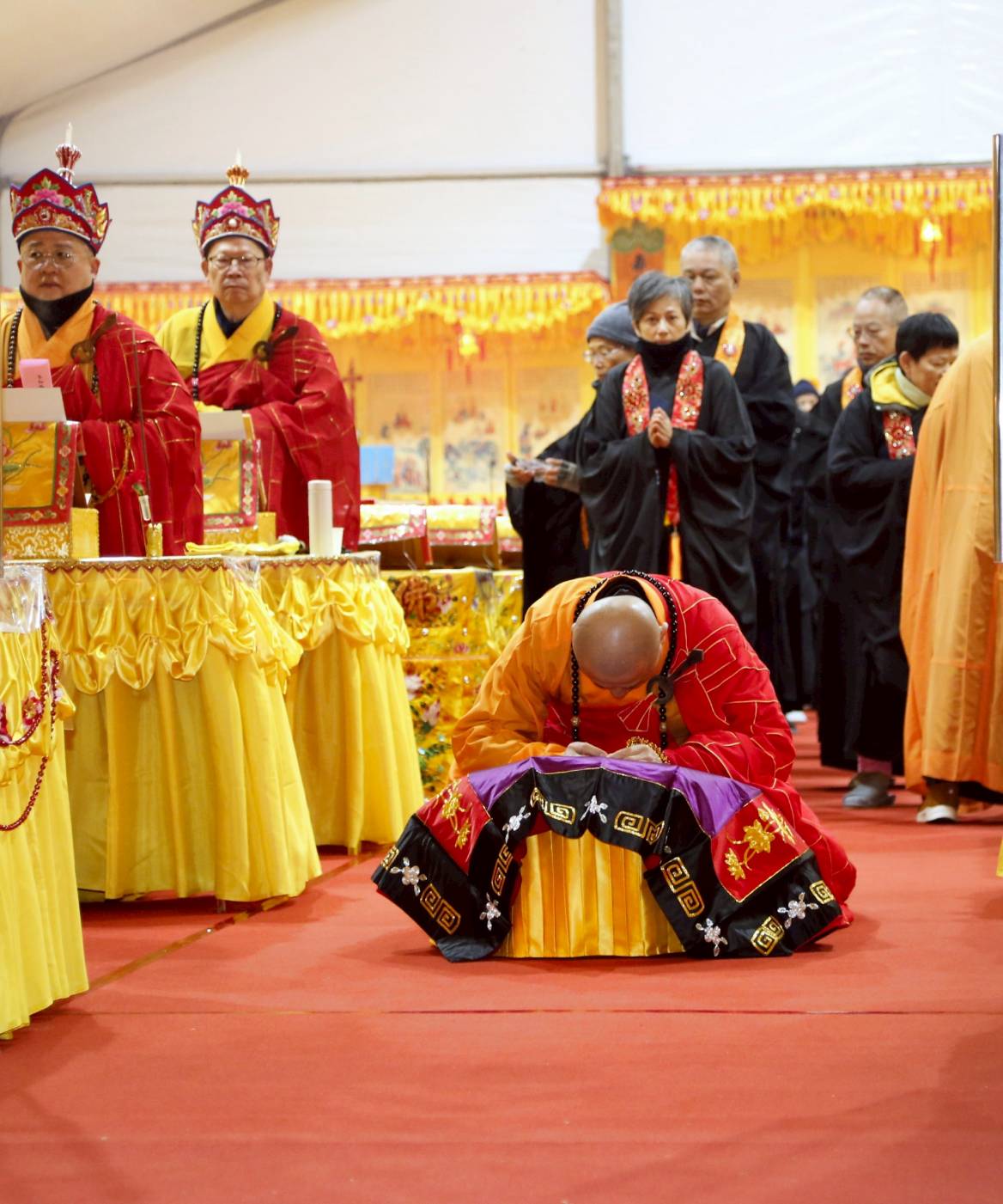 凌晨2點,齋主入壇禮佛三拜,香燈鳴引磬,引領上傳下敦師父、齋主,恭請三位主法和尚。