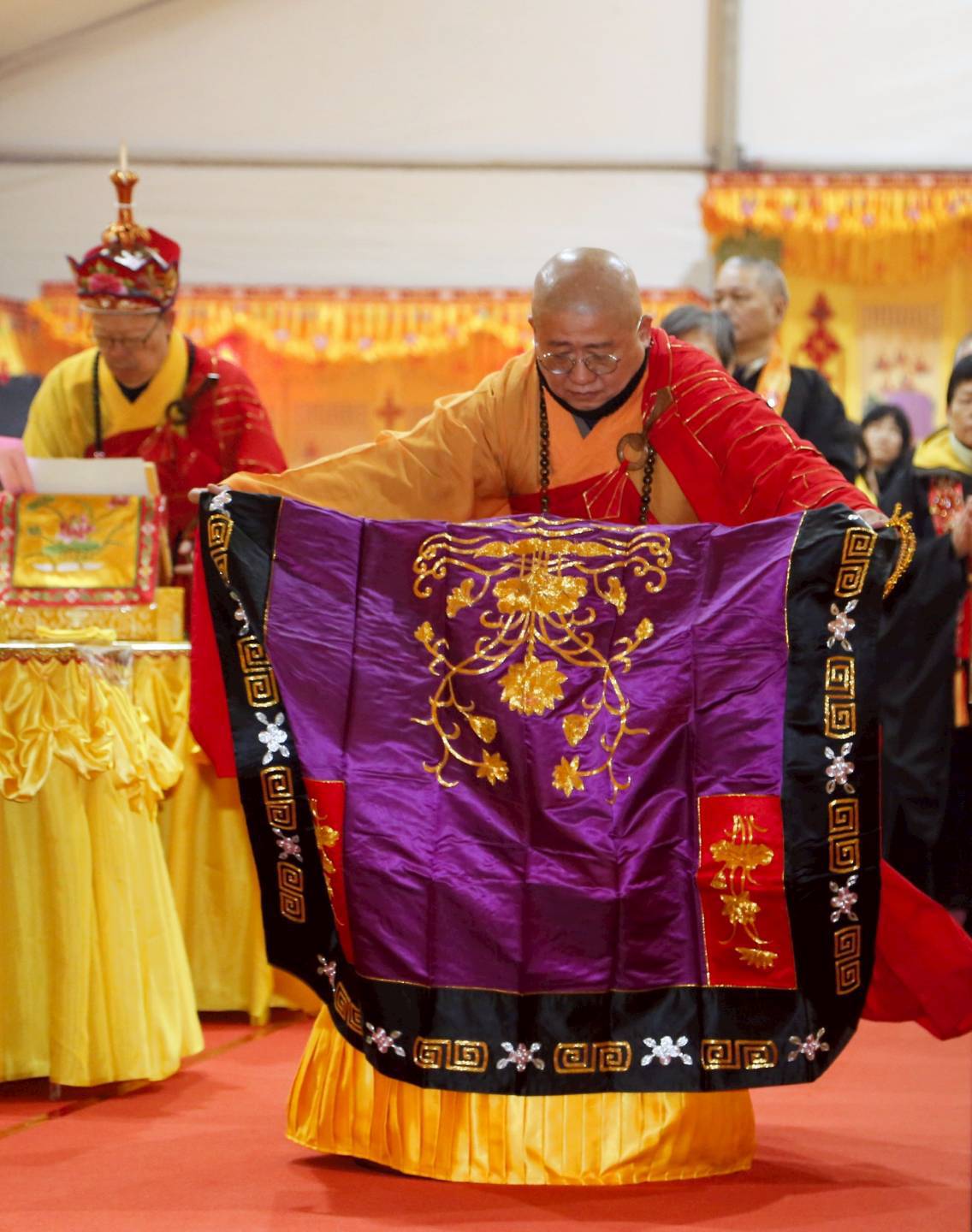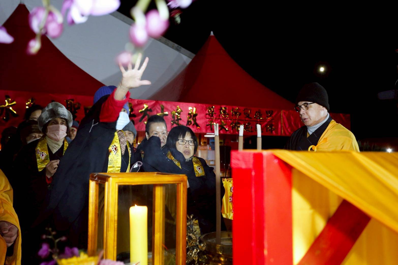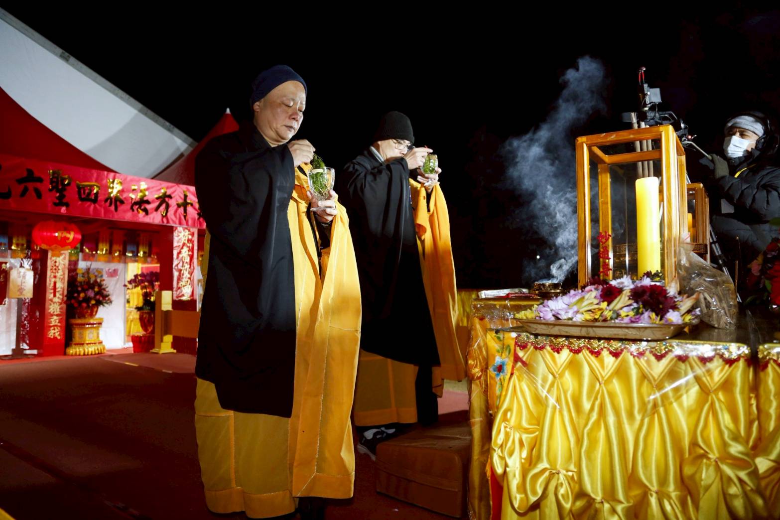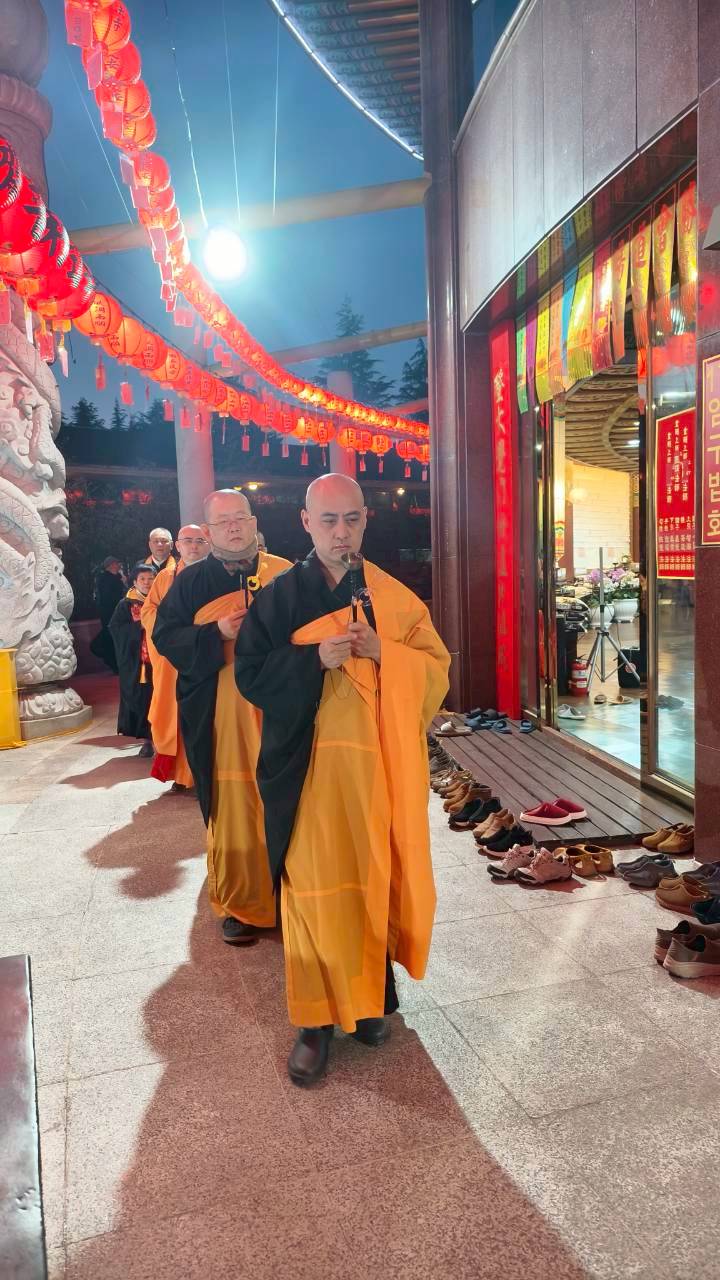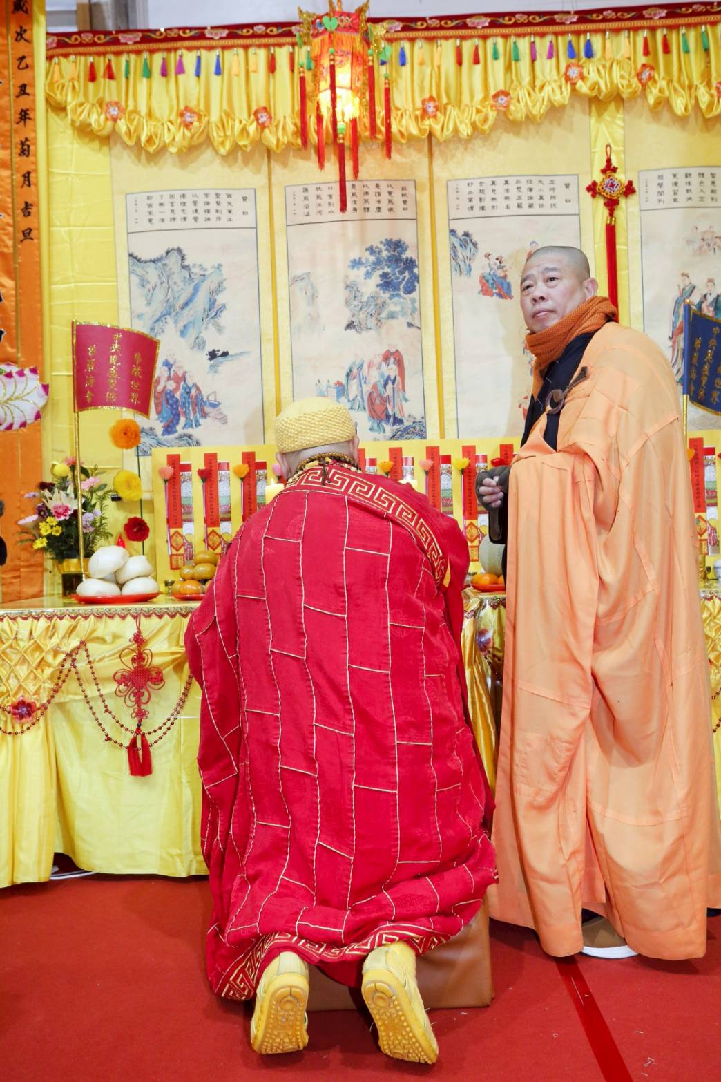 凌晨2點,齋主入壇禮佛三拜,香燈鳴引磬,引領上傳下敦師父、齋主,恭請三位主法和尚。