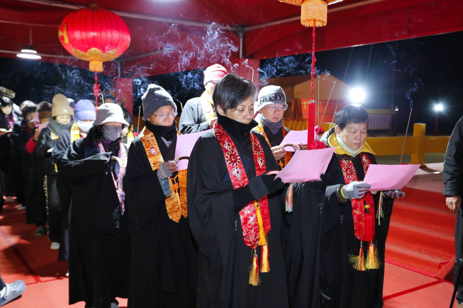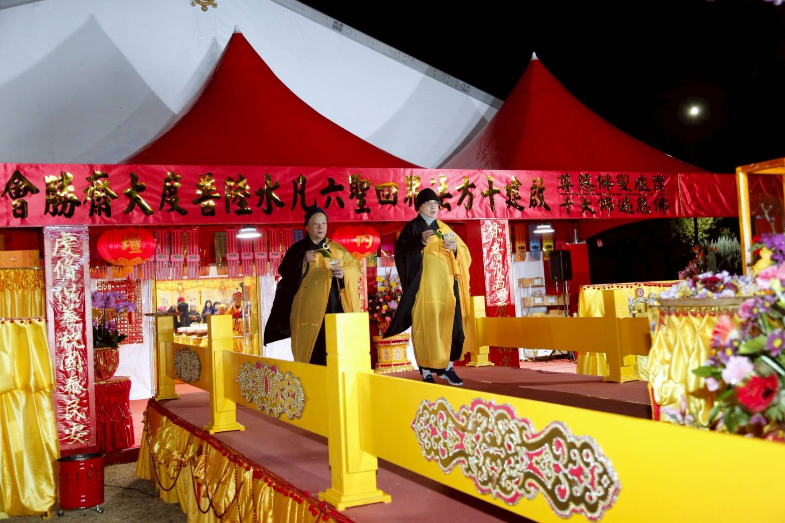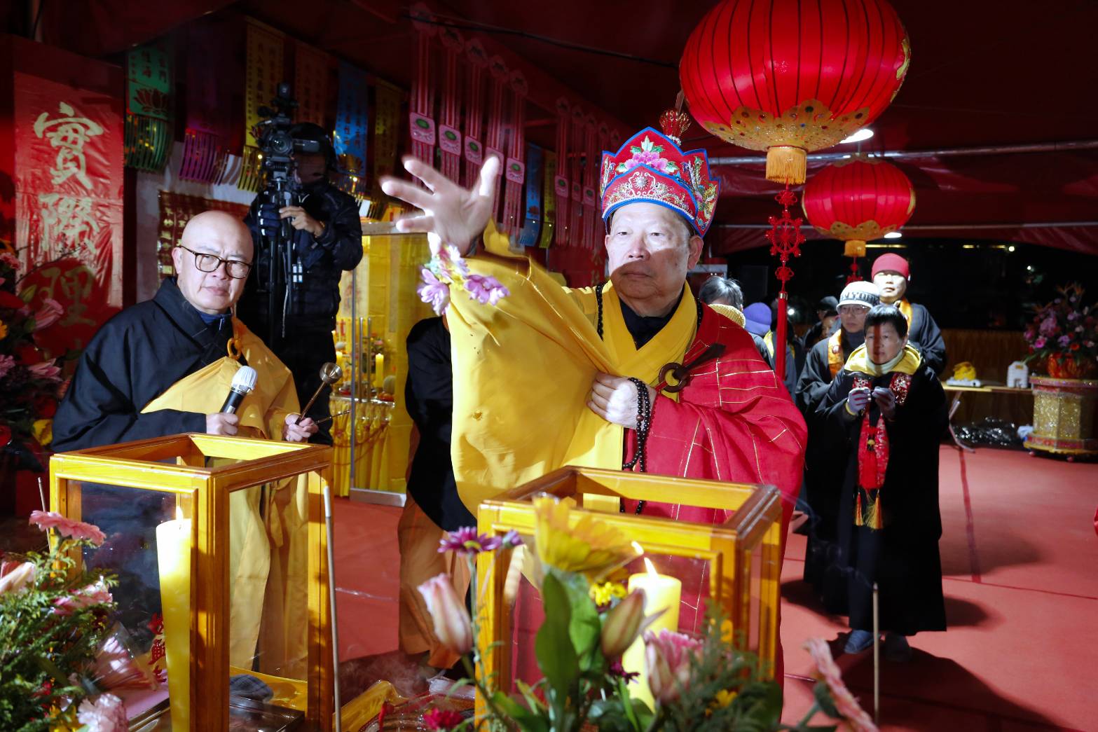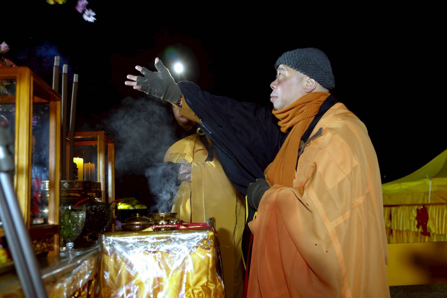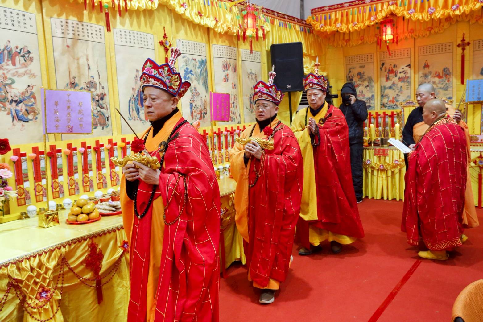 凌晨2點,齋主入壇禮佛三拜,香燈鳴引磬,引領上傳下敦師父、齋主,恭請三位主法和尚。