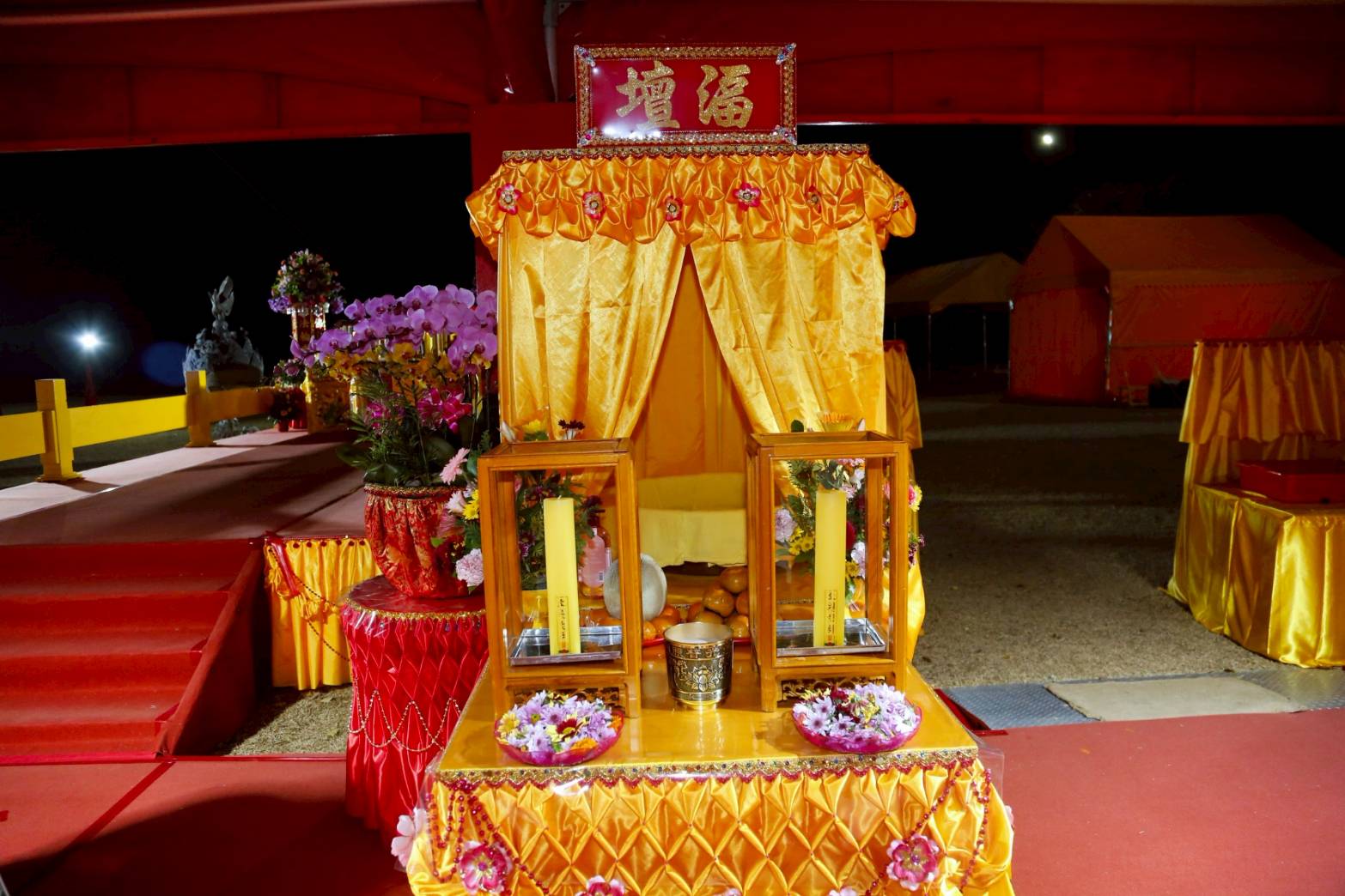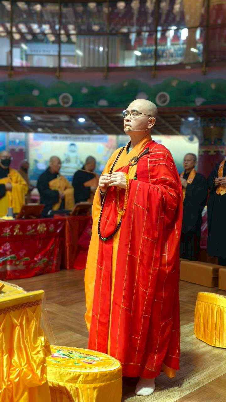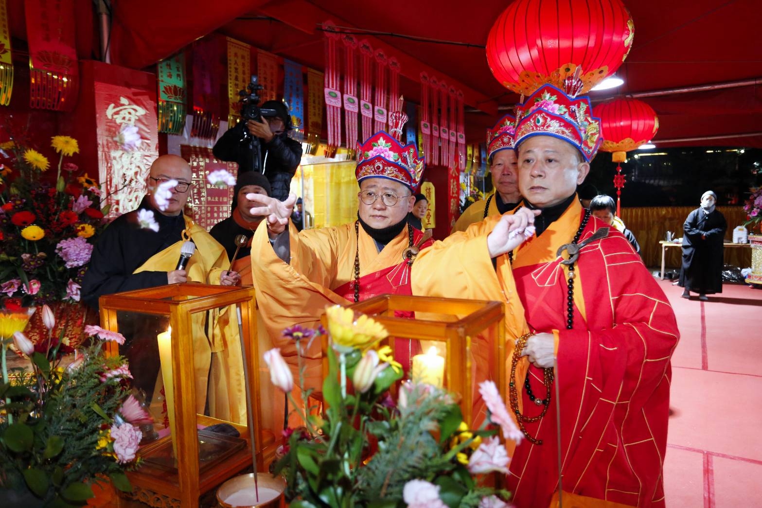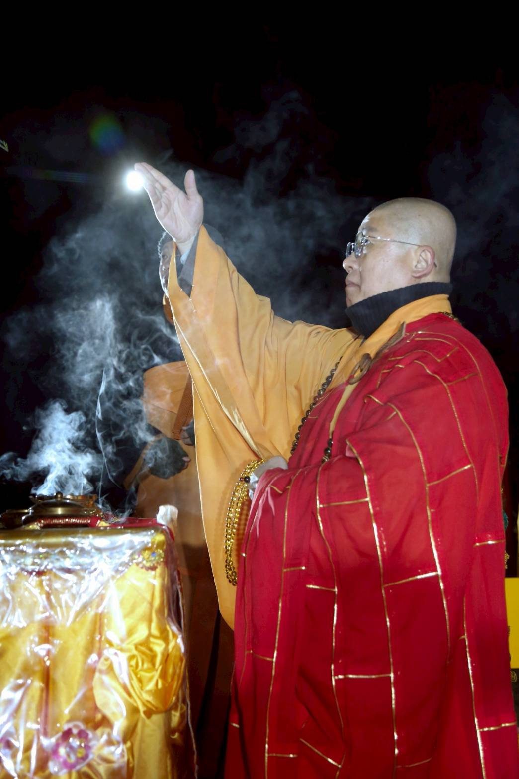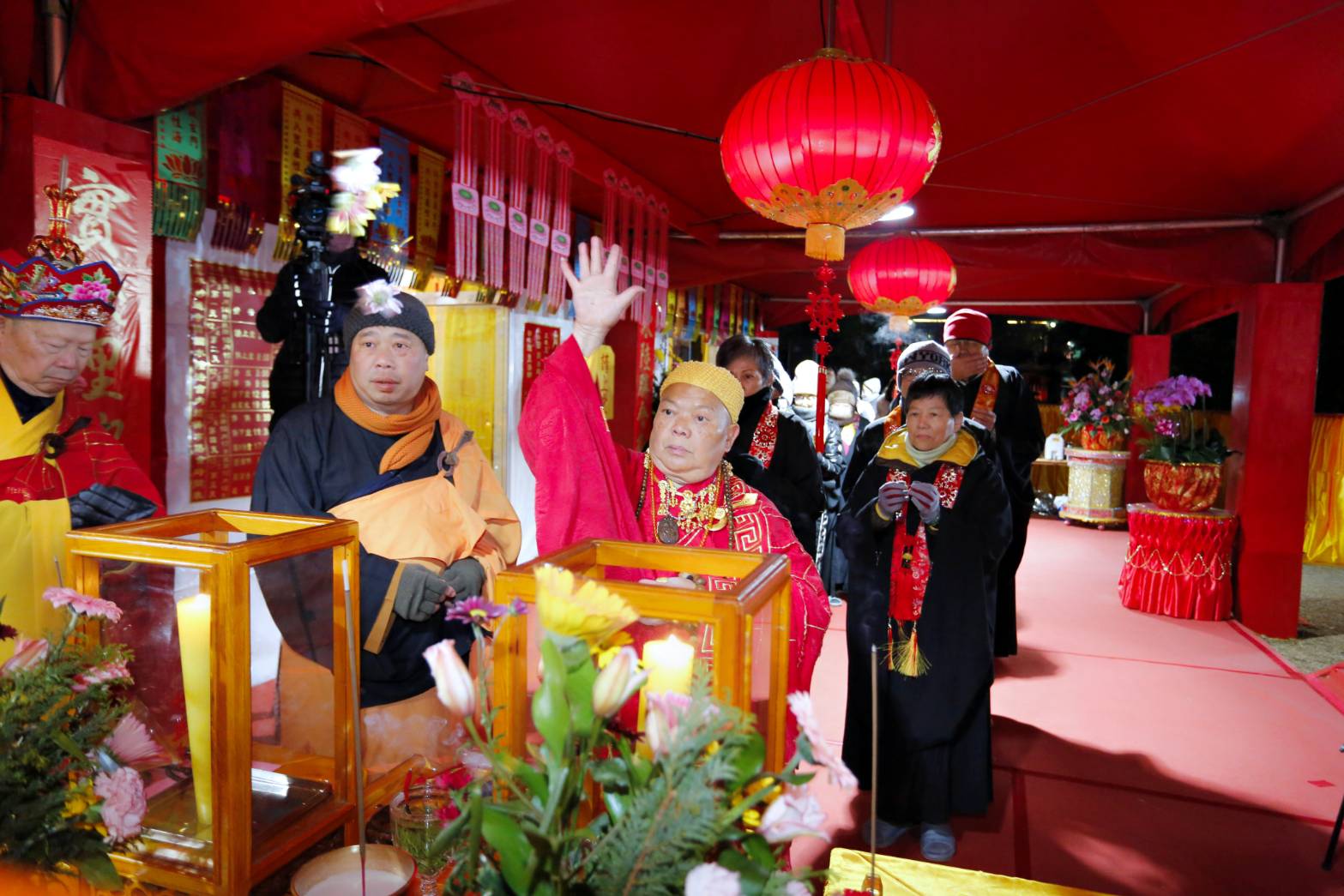 凌晨2點,齋主入壇禮佛三拜,香燈鳴引磬,引領上傳下敦師父、齋主,恭請三位主法和尚。