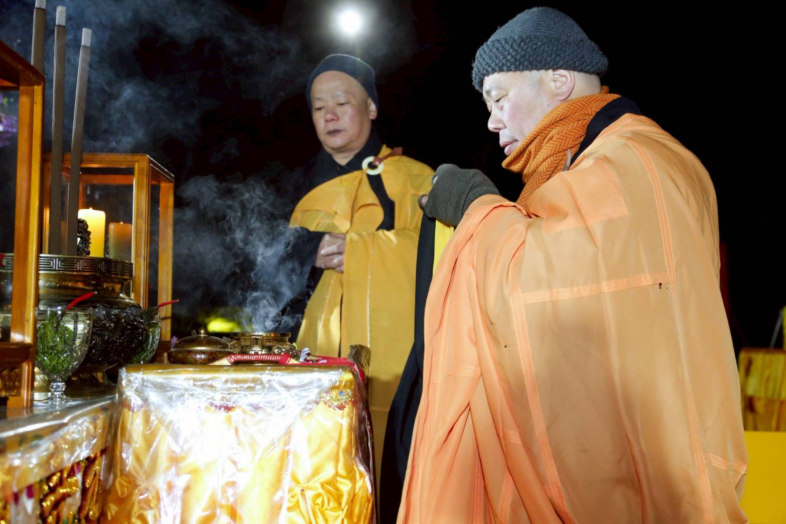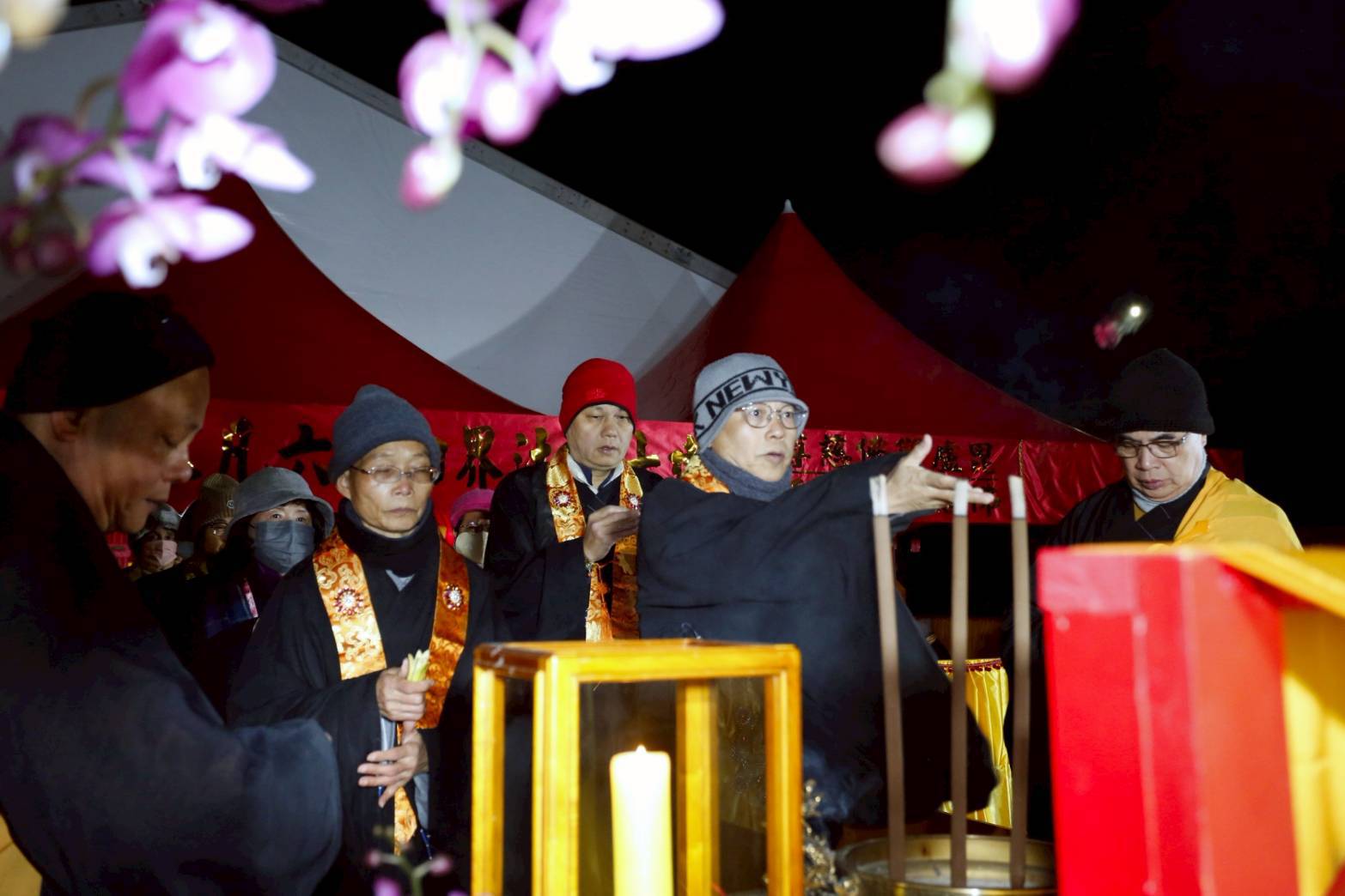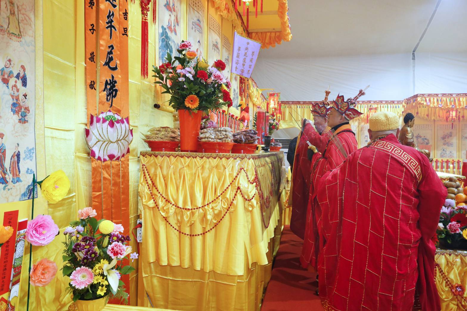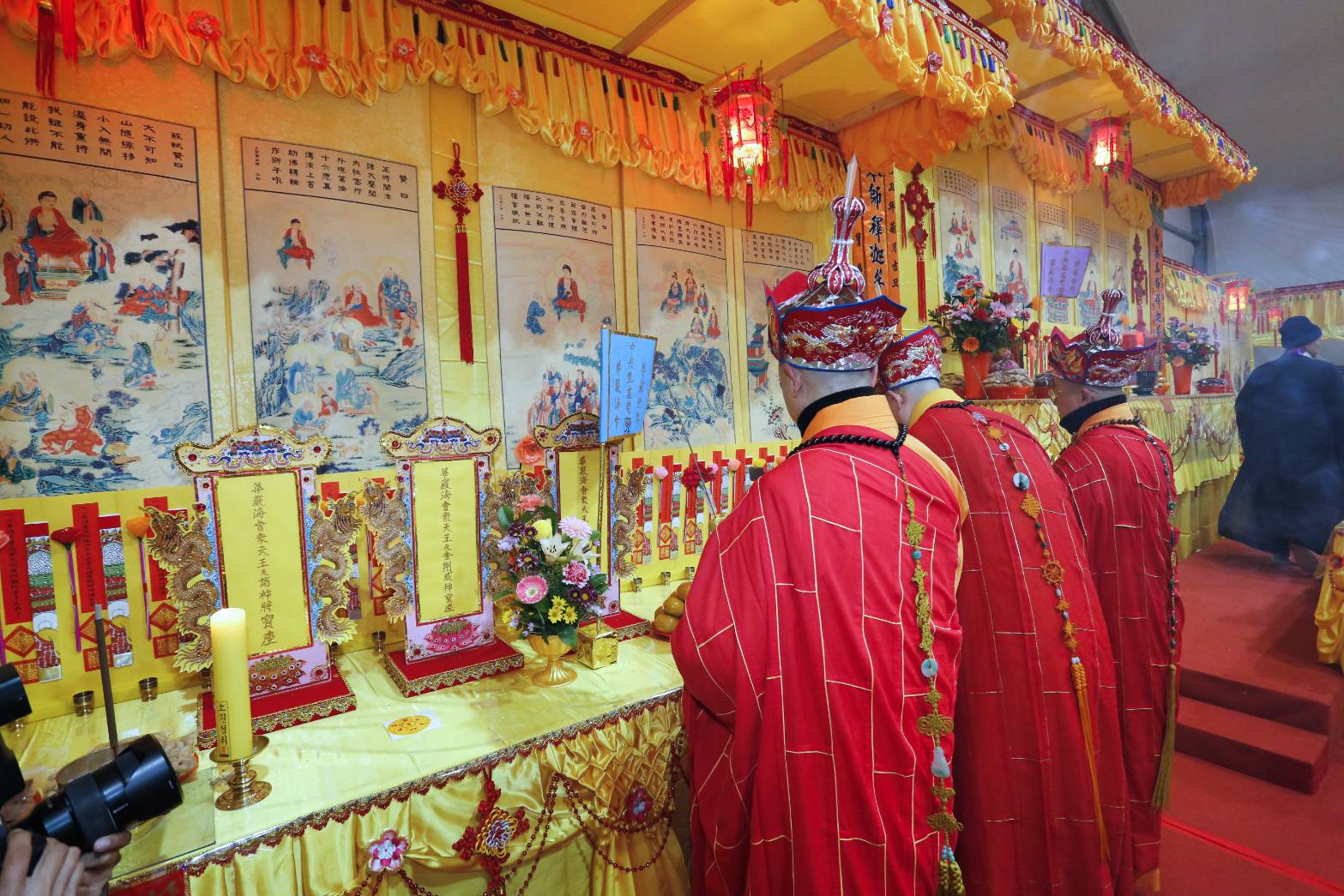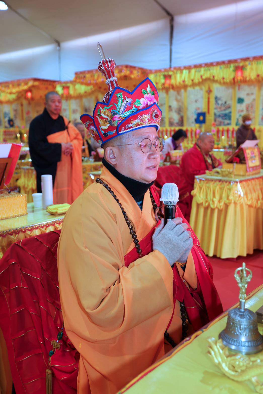 凌晨2點,齋主入壇禮佛三拜,香燈鳴引磬,引領上傳下敦師父、齋主,恭請三位主法和尚。