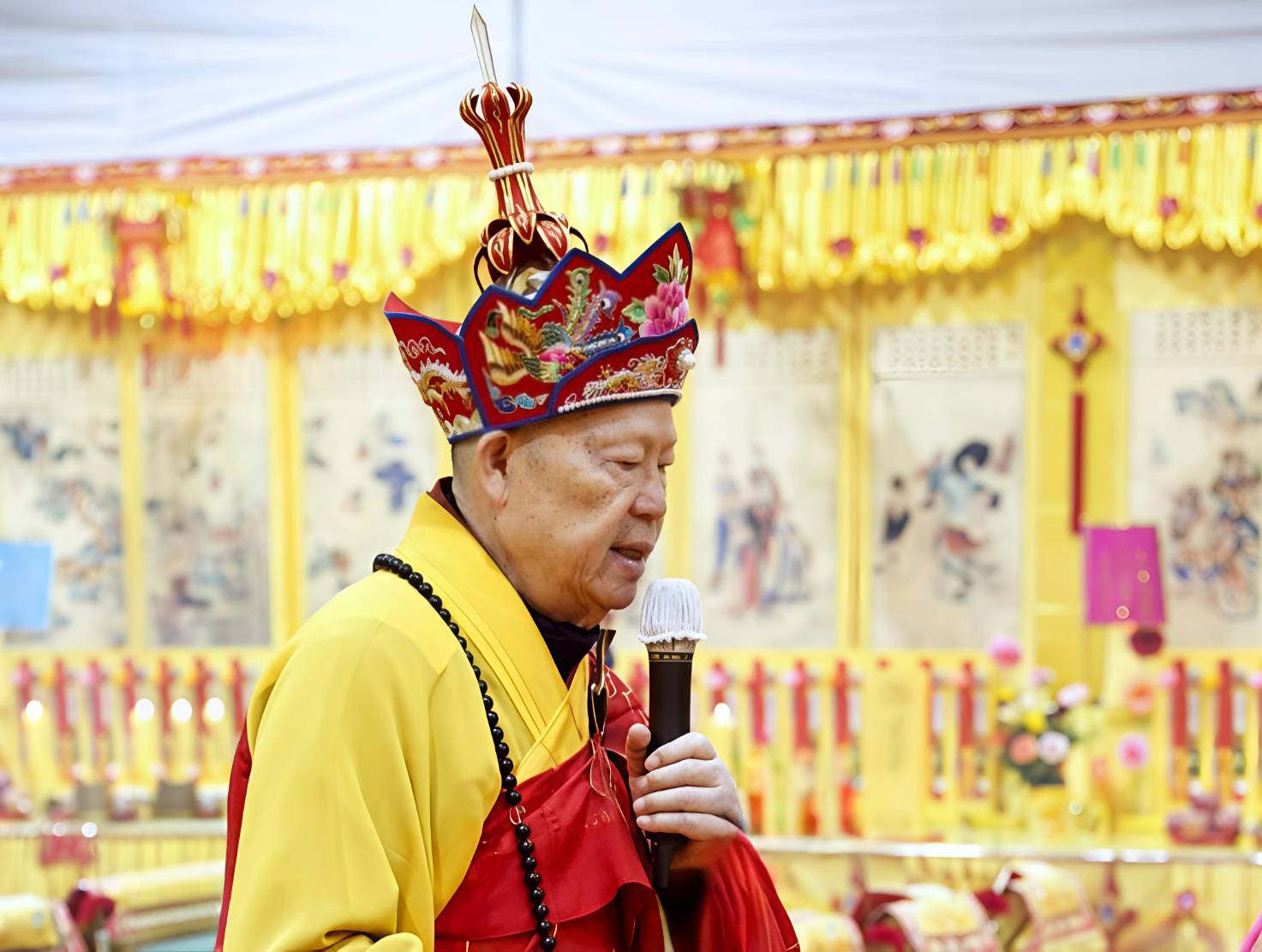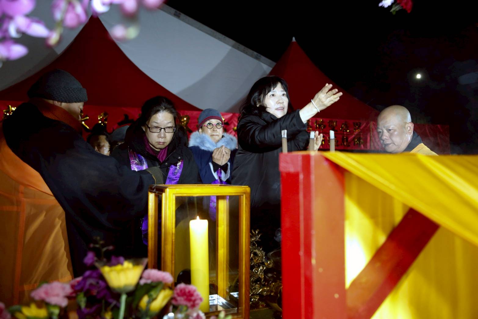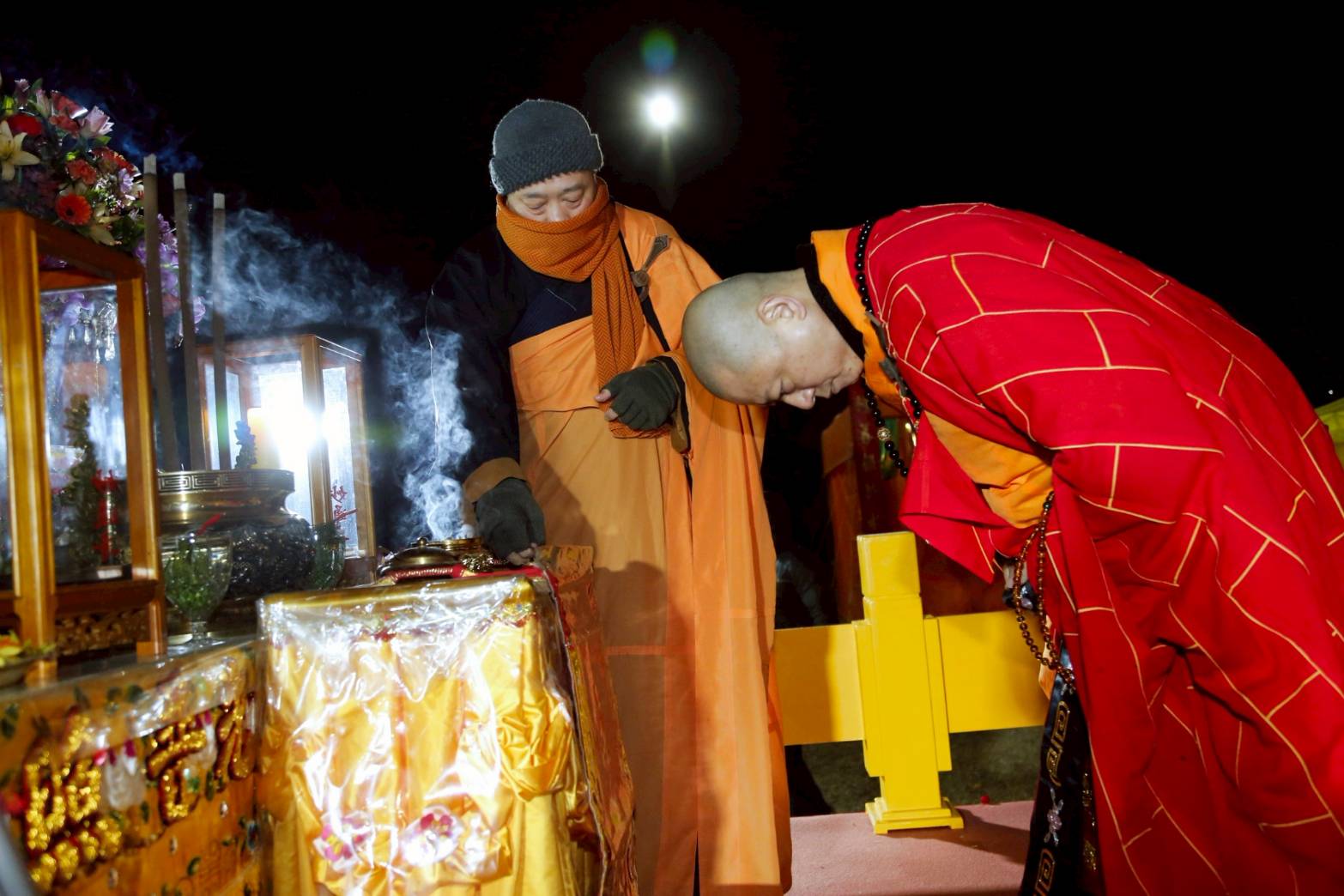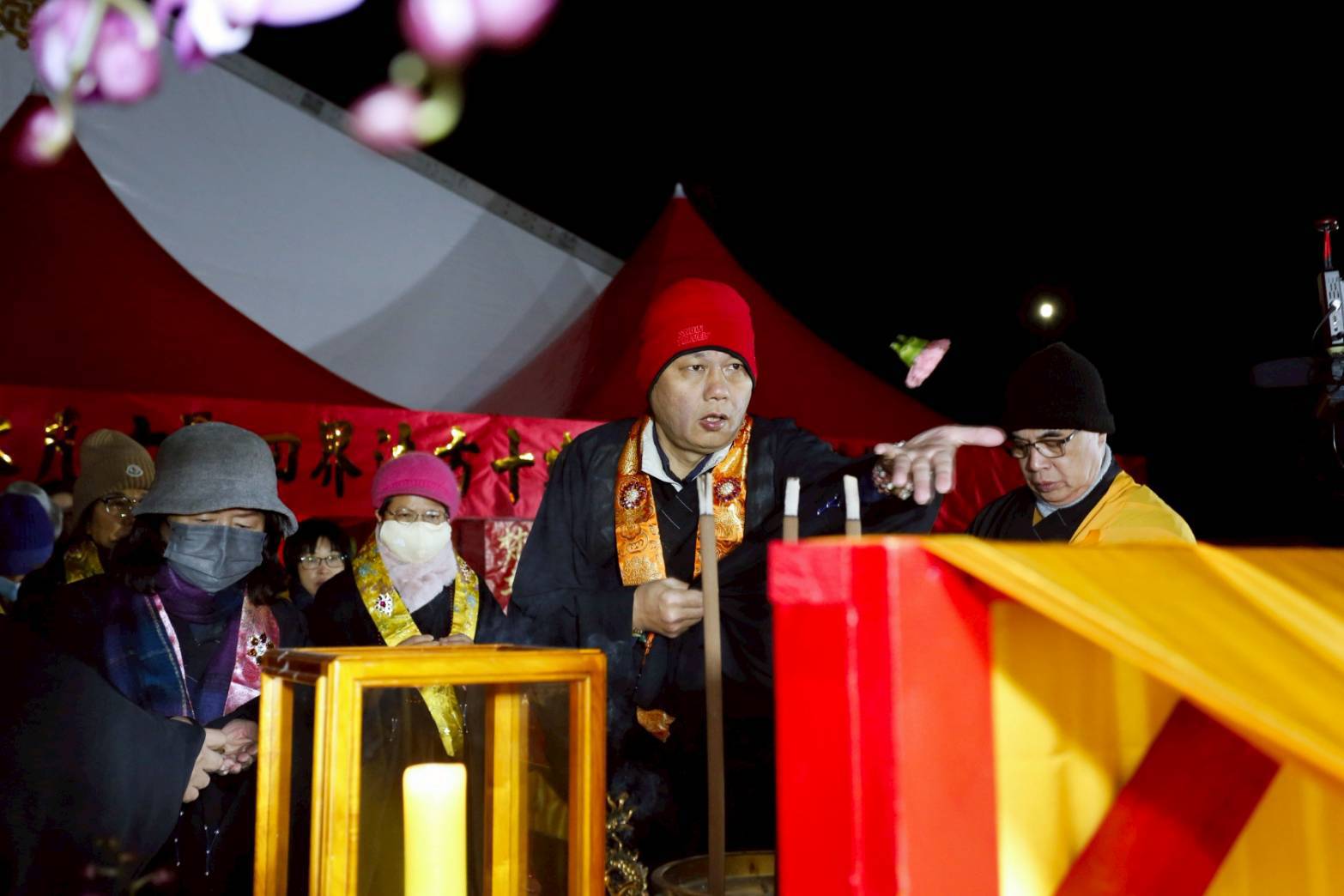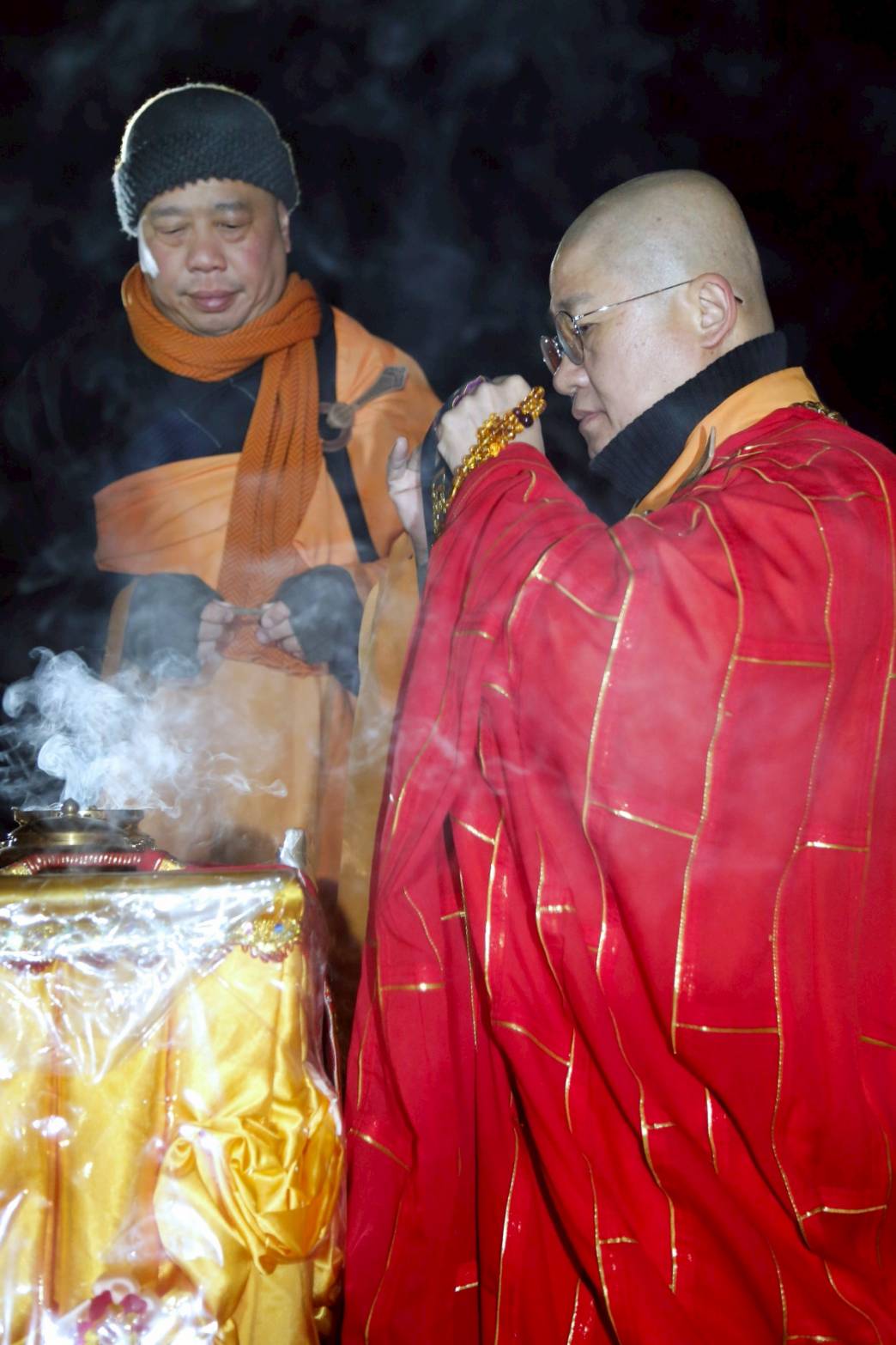 凌晨2點,齋主入壇禮佛三拜,香燈鳴引磬,引領上傳下敦師父、齋主,恭請三位主法和尚。